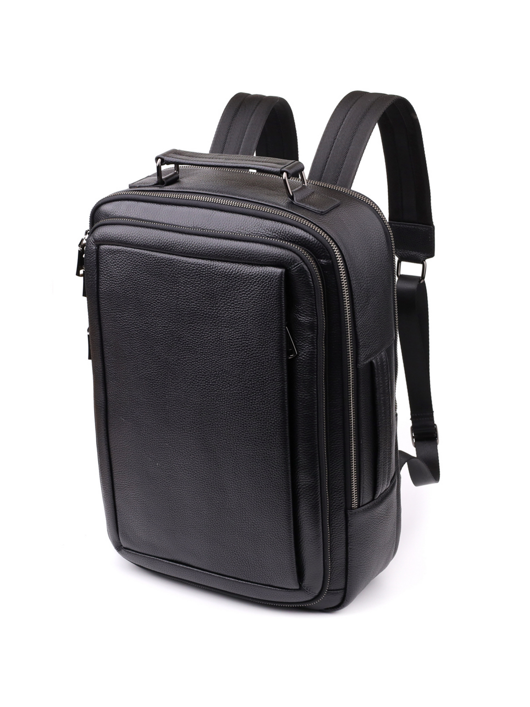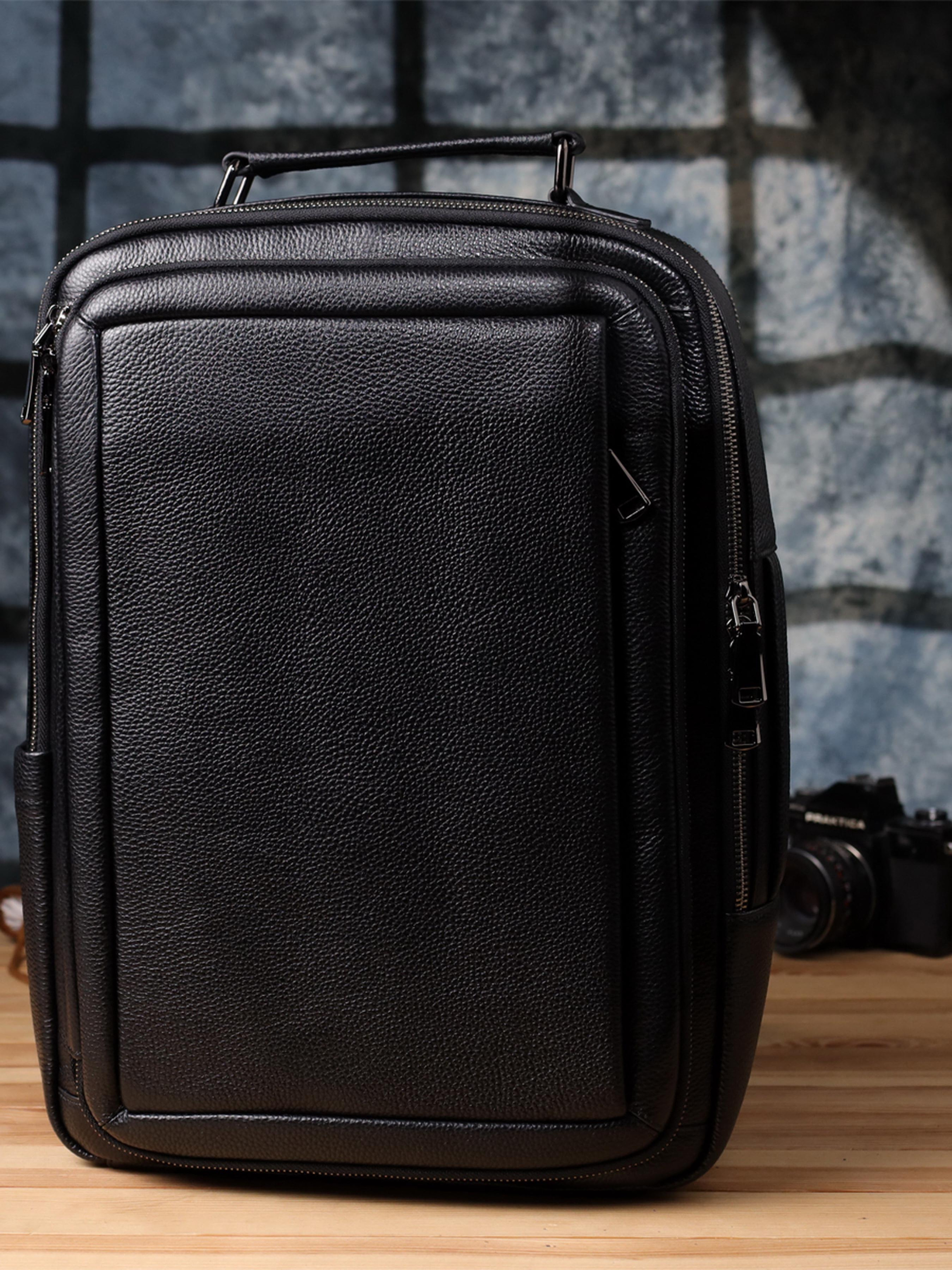 Цвет: черный; Материал: натуральная кожа высокого качества; Размер (ШхВхГ, см): 30х42х17см; Страна производитель: Китай. Бренд: Vintage. Особенности: - два основных отделения на молниях с двумя бегунками; На лицевой стороне: - накладной карман, что закрывается на молнию с двумя бегунками; - встроенный вертикальный карман на молнии; - боковой небольшой карман открытого типа; - две кожаные ручки для переноса, одна сверху рюкзака, другая сбоку; - цвет фурнитуры: темное серебро; - мягкие регулируемые лямки; - ортопедическая спинка. Мужской кожаный рюкзак из зернистой натуральной кожи сочетает в себе стиль, практичность и комфорт. Два основных отделения на молниях с двойными бегунками обеспечивают удобную организацию пространства, позволяя разместить ноутбук, документы и личные вещи. На лицевой стороне рюкзака расположены функциональные карманы накладной и встроенный вертикальный на молнии, а также скрытый под клапаном, что обеспечивает быстрый доступ к необходимым мелочам. Дополнительный боковой открытый карман идеально подходит для бутылки воды или зонта. Для комфортной переноски предусмотрены две кожаные ручки — сверху и сбоку, а мягкие регулируемые лямки и ортопедическая спинка гарантируют удобство даже при длительном использовании. Фурнитура тёмного серебра подчеркивает сдержанный и элегантный образ рюкзака, делая его универсальным аксессуаром для города, работы и путешествий.