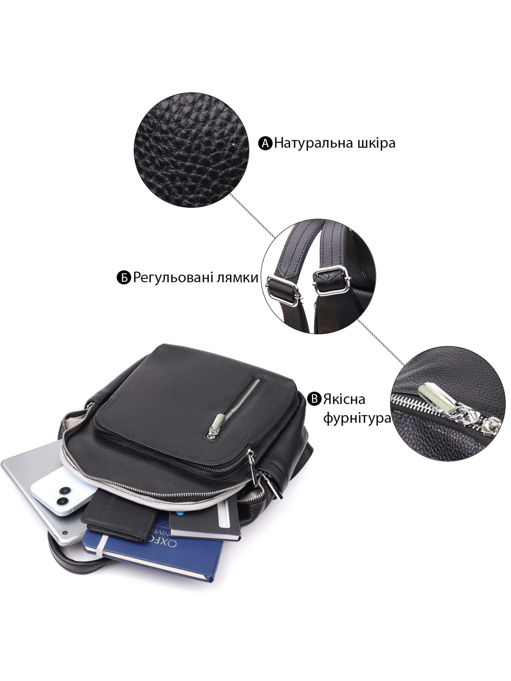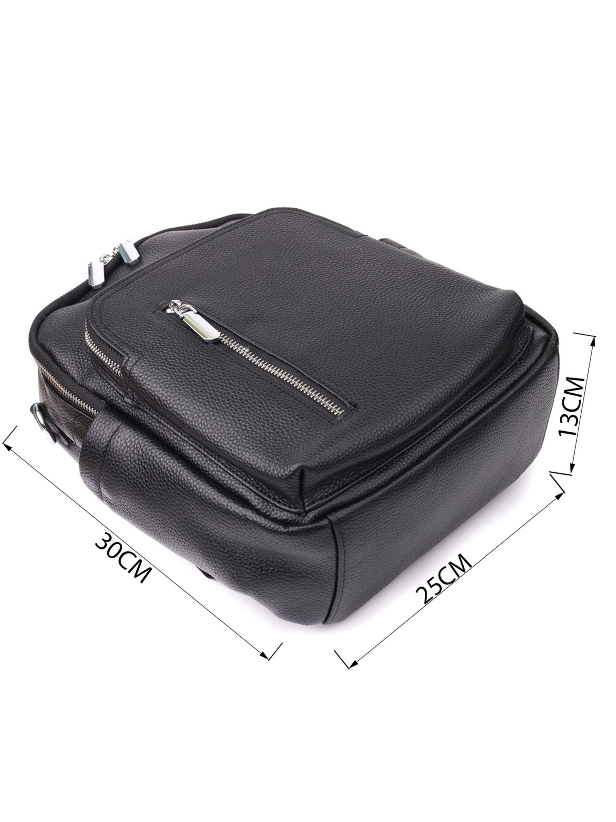 Цвет: черный; Материал: натуральная кожа высокого качества; Размер (ШхВхГ, см): 25х30х13см; Страна производитель: Китай. Бренд: Vintage. Особенности: - одно основное отделения на молнии; - два кармана на молниях внутри; - карман открытого типа внутри; - накладной карман на молнии, на лицевой стороне; - вертикальный карман, что закрывается на молнию, на лицевой стороне; - два боковых кармана; - карман на молнии на тыльной стороне; - кожаная ручка для переноса; - кожано-текстильные регулируемые лямки; - текстильный ремешок чтобы носить как сумку. Женский кожаный рюкзак выполнен в функциональном и современном дизайне, идеально подходящем для повседневного использования. Он оснащён одним основным отделением на молнии, внутри которого предусмотрены два кармана на молниях и один открытого типа для удобного хранения необходимых вещей. На лицевой стороне расположены два практичных отделения: накладной карман на молнии и вертикальный карман, который также закрывается на молнию. По бокам два открытых кармана, удобных для мелочей или бутылки воды. На тыльной стороне находится дополнительный карман на молнии для предметов, к которым нужен быстрый доступ. Рюкзак укомплектован кожаной ручкой для переноски в руке, регулируемыми кожано-текстильными лямками и съёмным текстильным ремешком, благодаря которому его можно носить как сумку. Эта модель гармонично сочетает в себе стиль, комфорт и практичность.