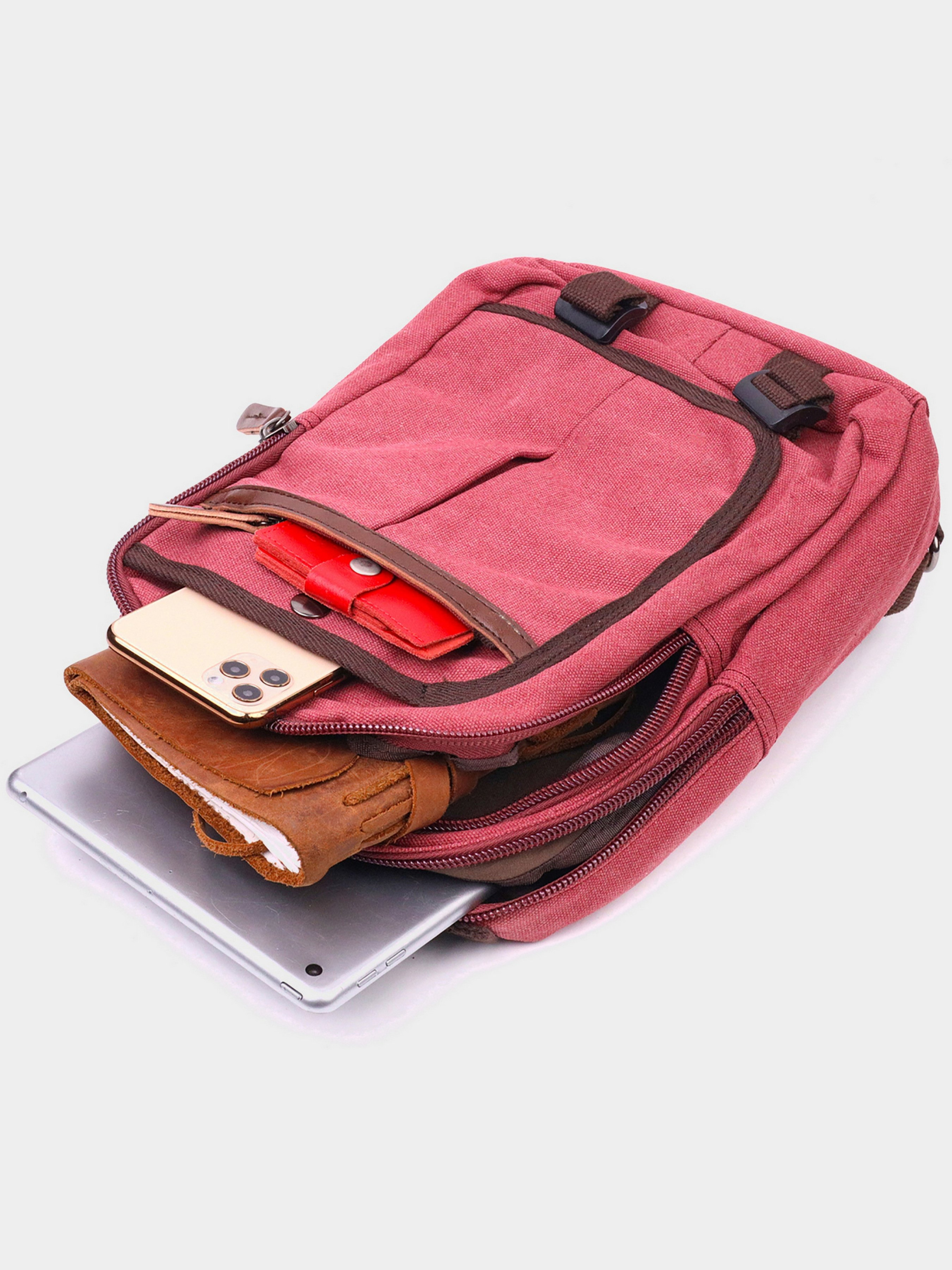 Материал: текстиль; Цвет: малиновый; Размеры (ШхВхГ, см): 22х32х8 см; Страна производитель: Китай. Особенности: - два основных отделения, что закрываются на молнию; - два кармана внутри одного отделения, один на молнии; - накладной карман на лицевой стороне на молнии; - подкладка из темной коричневой ткани; - две регулируемые лямки, что скрепляются молнией. Оригинальный текстильный рюкзак имеет необычный малиновый цвет и удобный дизайн с практичным функционалом. Рюкзак имеет два основных отделения, три дополнительных кармана, два из которых на молниях, уплотненная спинка, две регулируемые лямки, что скрепляются молнией. В рюкзак помещается довольно много вещей, а наличие карманов поможет вам идеально их разложить. В сочетании с качественной фурнитурой и крепкой подкладкой рюкзак прослужит Вам не один год. Если Вам нужен рюкзак на несколько сезонов – рекомендуем вам данную модель.