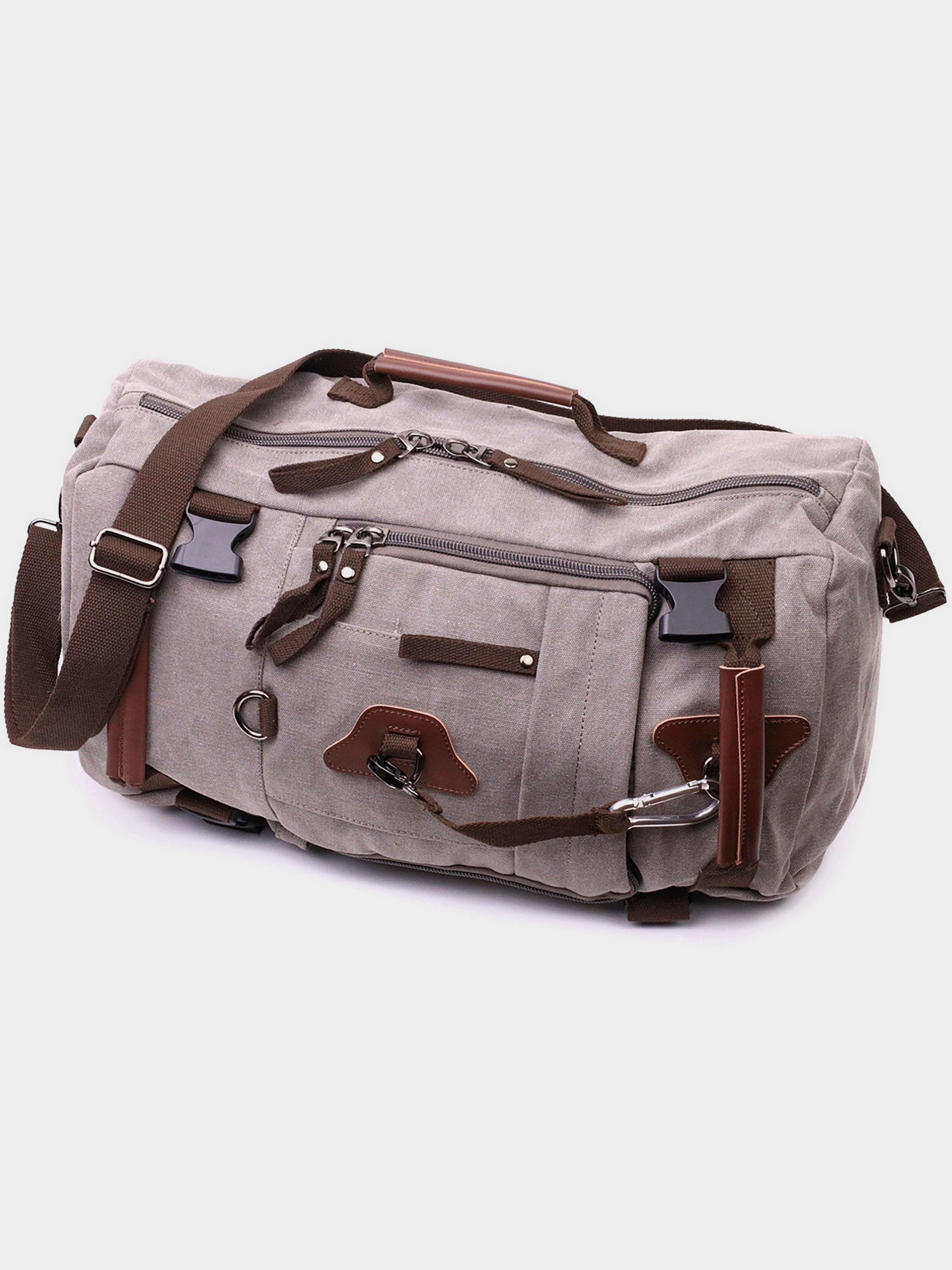 Материал: текстиль; Цвет: серый; Размеры (ШхВхГ, см): 48х28х15; Страна производитель: Китай; Бренд: Vintage. Особенности: - закрывается молниями; - одно основное отделение с уплотненным карманом на липучке для ноутбука; - с передней стороны накладной карман на молнии, в котором два больших отделения, карман для телефона, карман открытого типа и две ячейки для ручек; - встроенный карман на молнии на лицевой стороне; - три металлических кольца-держателя; - добротный карабин из металла; - задний карман на молнии, в который помещаются лямки для рюкзака; - три удобные ручки для переноски в руке; - съемный регулируемый плечевой ремень; - уплотненное дно; - подкладка из темной ткани. Рюкзак трансформер на все случаи жизни из плотного текстиля. Модель можно носить как сумку, так и рюкзак. Аксессуар имеет боковые регуляторы и может расширяться в объем в зависимости от забитости сумки. Изделие имеет достаточный объем кармашков, и Вы с легкостью поместите все свои личные вещи. Сумка выполнена из качественного и прочного текстиля. Изделие станет достойной заменой, если вы не хотите переплачивать за модели из натуральной кожи.