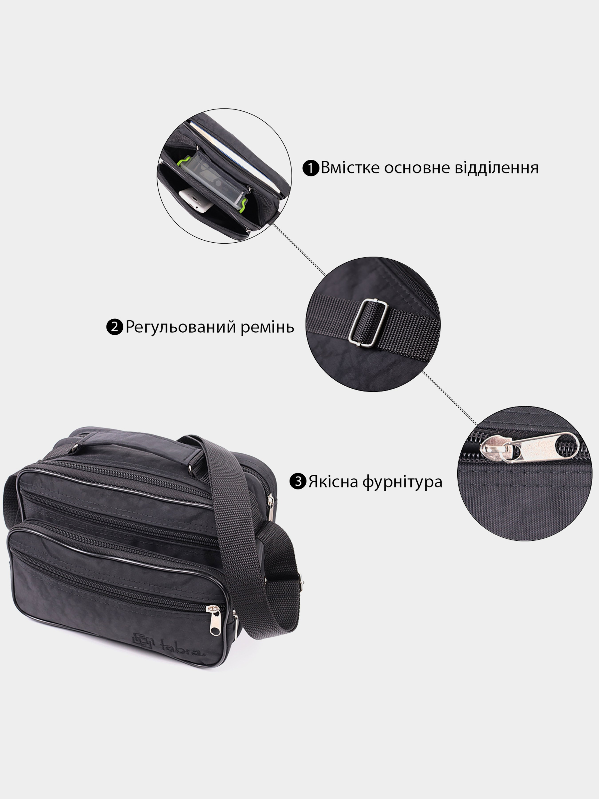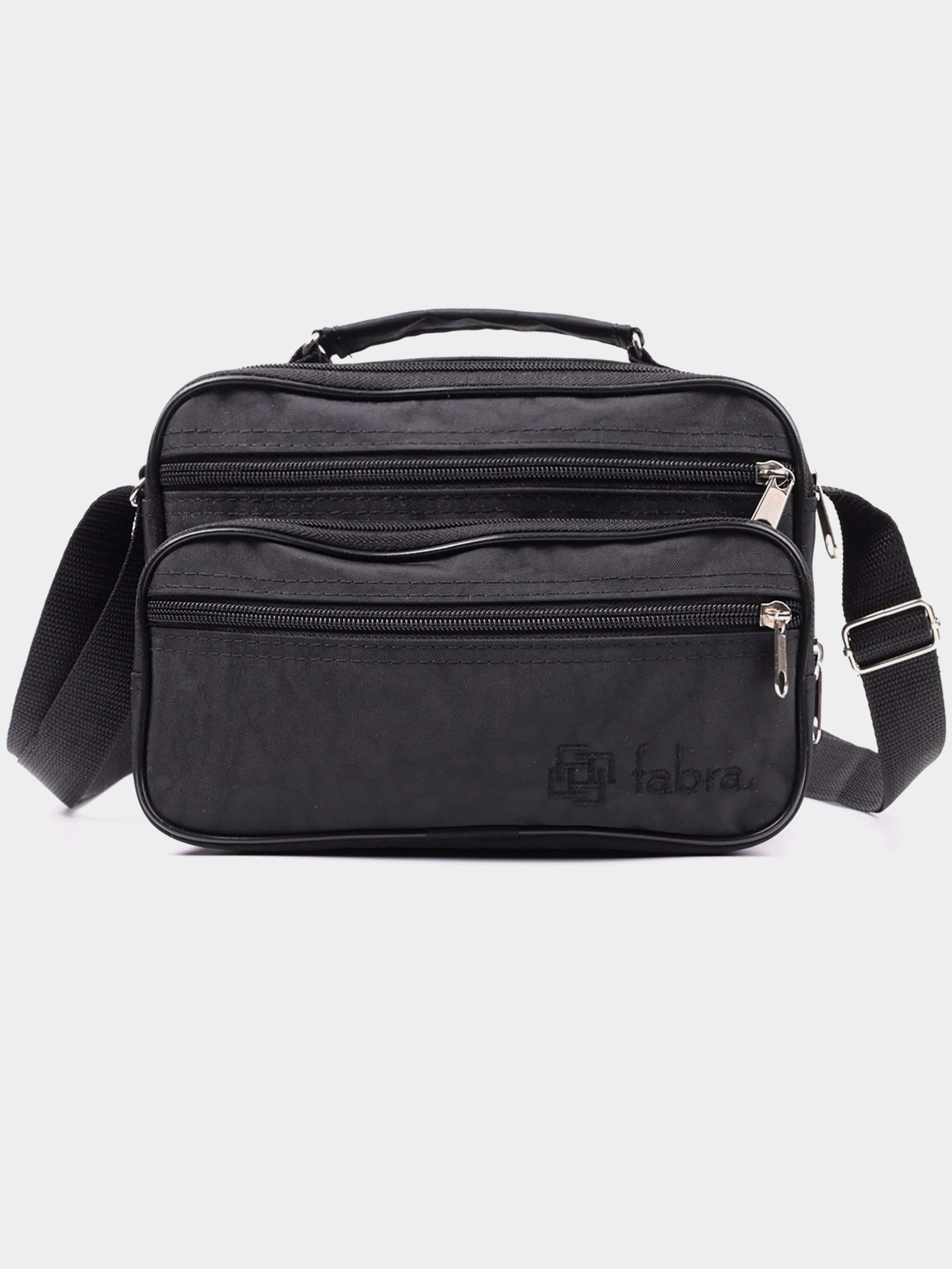 Материал: полиэстер; Цвет: черный; Размеры (ШхВхГ, см):23х18х13 см; Бренд: FABRA; Страна производитель: Украина. Особенности: - два основных отделения на молниях; - три кармана, что закрываются молниями на лицевой стороне; - один карман на молнии на тыльной стороне; - текстильная ручка для носки в руках; - не съемный текстильный регулируемый ремень; - подкладка из ткани. Небольшая прямоугольная сумка на каждый день из качественного материала - полиэстера. Изделие имеет оптимальный размер для Вашего удобства. Функционал сумки продуман до мелочей, она состоит из двух больших отделений и четырех карманов разных размеров снаружи, что очень важно для порядка в вещах. На лицевой стороне, в правом нижнем углу, вышит значок бренда, что есть залогом качества. Носить аксессуар можно в руках, для этого предусмотрена текстильная ручка и на плече при помощи надежного не съемного регулируемого ремня. Пошита сумка аккуратно, все строчки ровные, подкладка прочная черного цвета, фурнитура надежная и качественная. Тканевая сумка станет желанным подарком для ваших близких и самое главное очень полезным и необходимым.