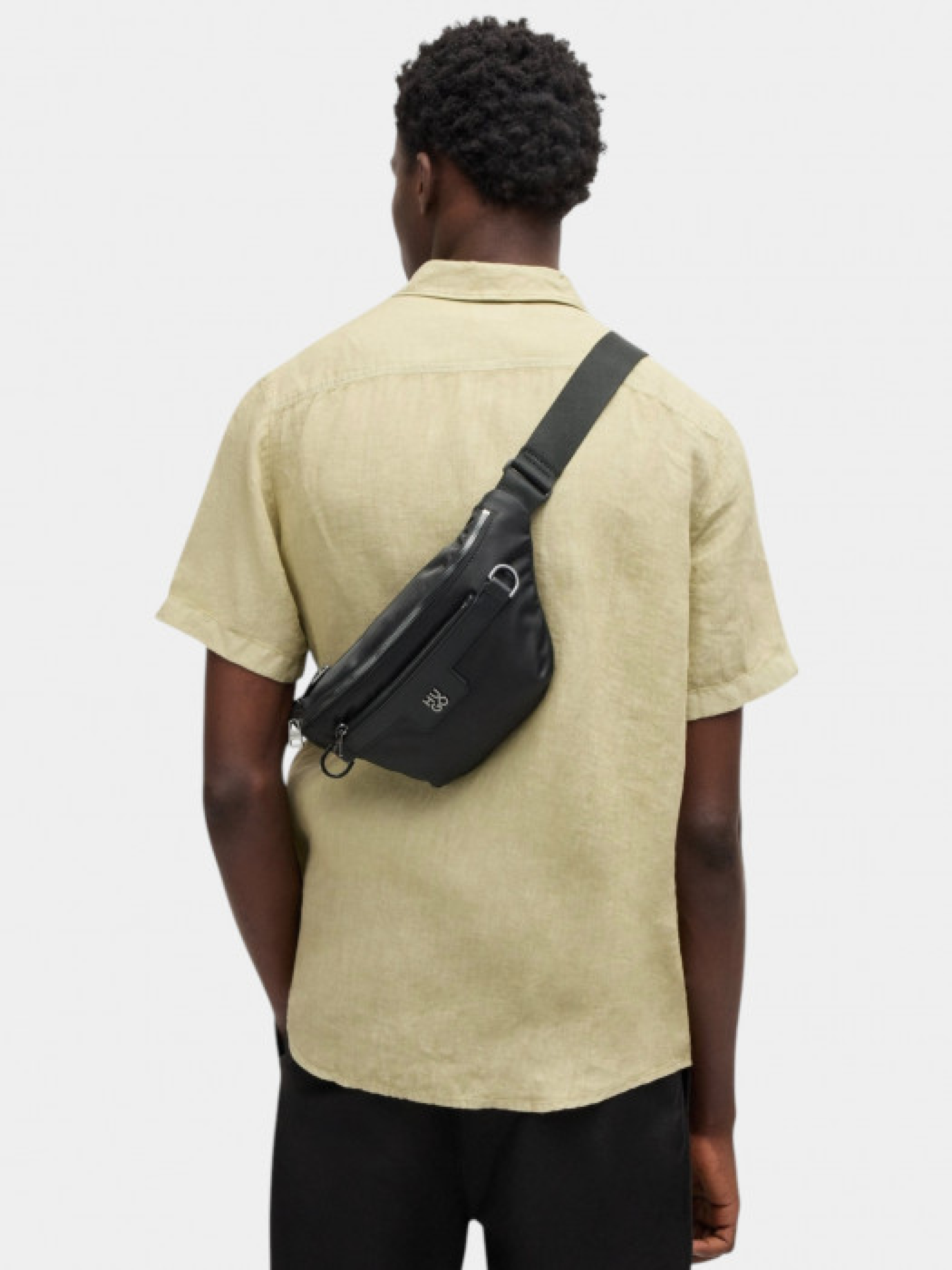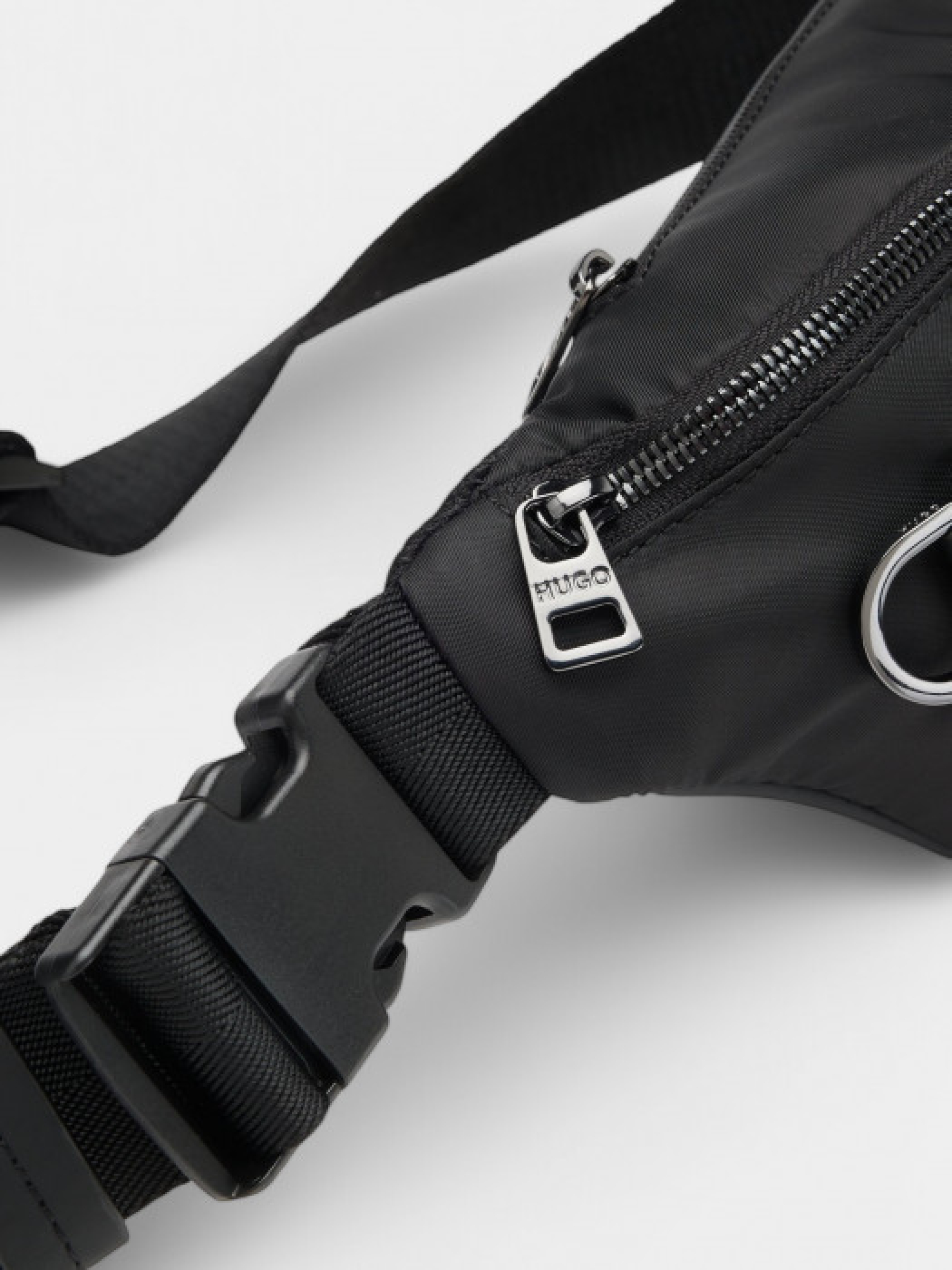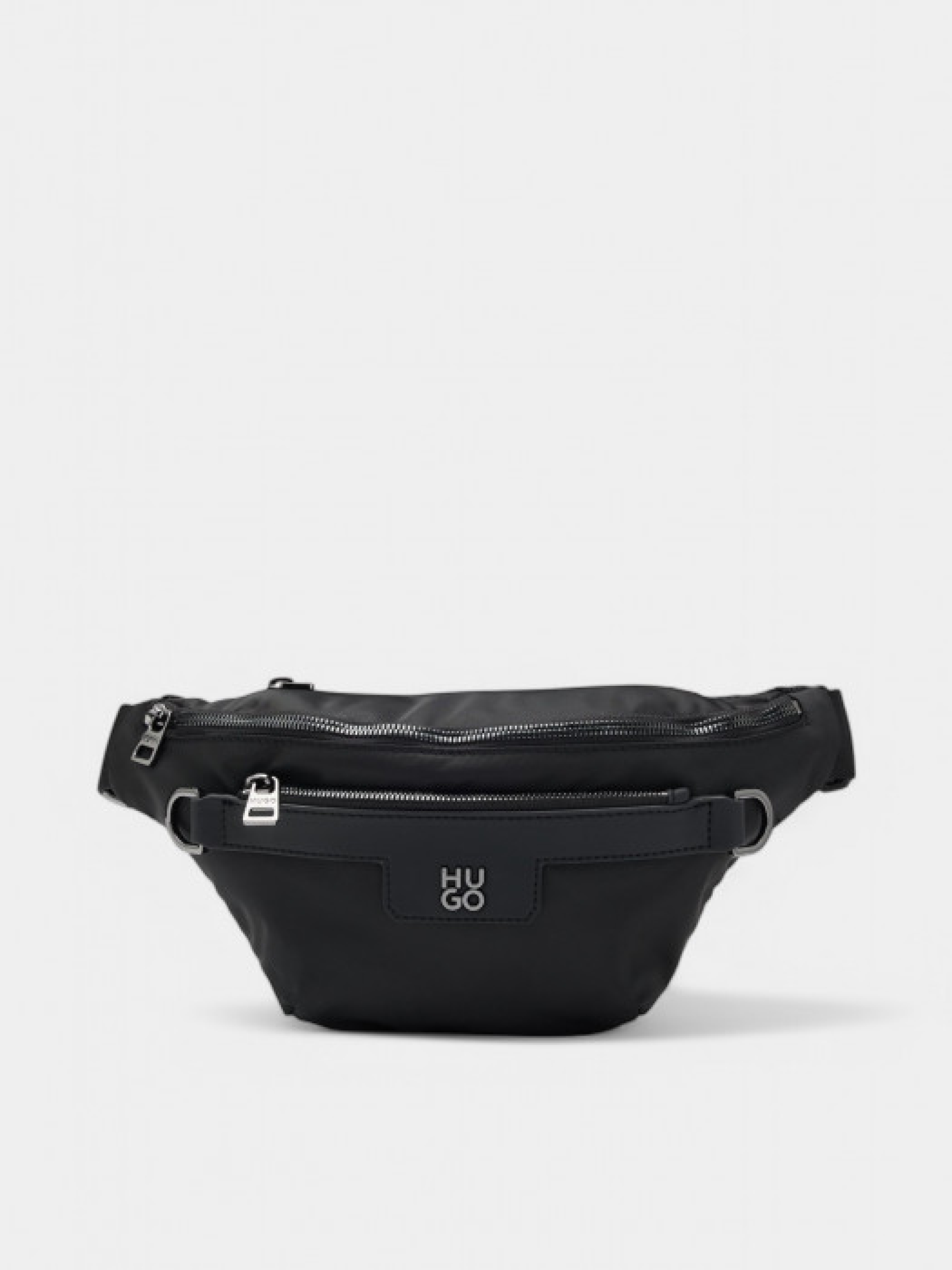 Сумка на пояс HUGO Menswear из матовой ткани с тонкой фактурой. Оснащена металлическими деталями цвета темного серебра, включая два полированных кольца, металлическими буквами и молнией сверху. Регулируемый ремень обеспечивает индивидуальную посадку. Частично изготовлена из переработанного полиэстера из текстильных отходов, что способствует сохранению ресурсов. Размеры: 16х31х9 см.