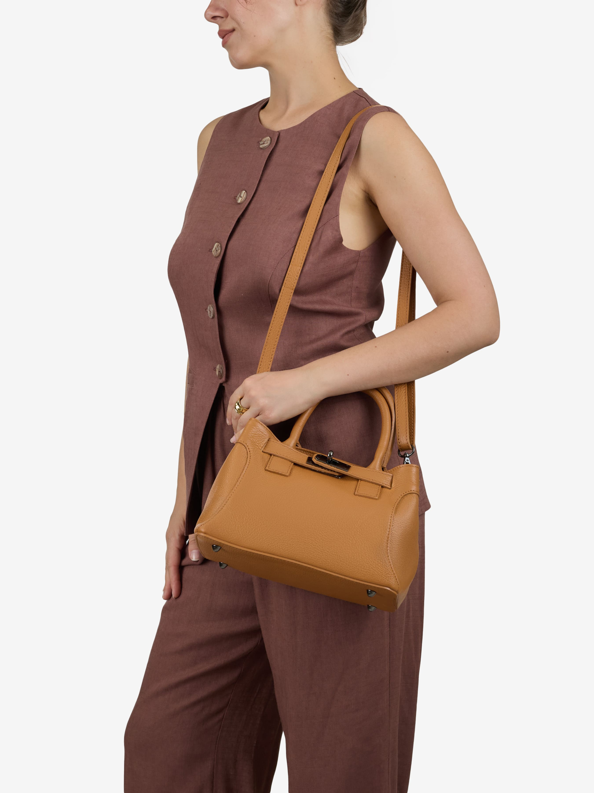 Детали: Материал: 100% натуральная кожа флотар Фурнитура черного цвета Размеры (Ш x В x Г) - 26 x 17 x 14 см Внутри 1 отделение и карманчик на молнии Сзади карманчик на молнии Подкладка: хлопок Застежка: молния Ремешок кожаный, съемный, регулируется, максимальная длина 125 см Высота ручек 11 см