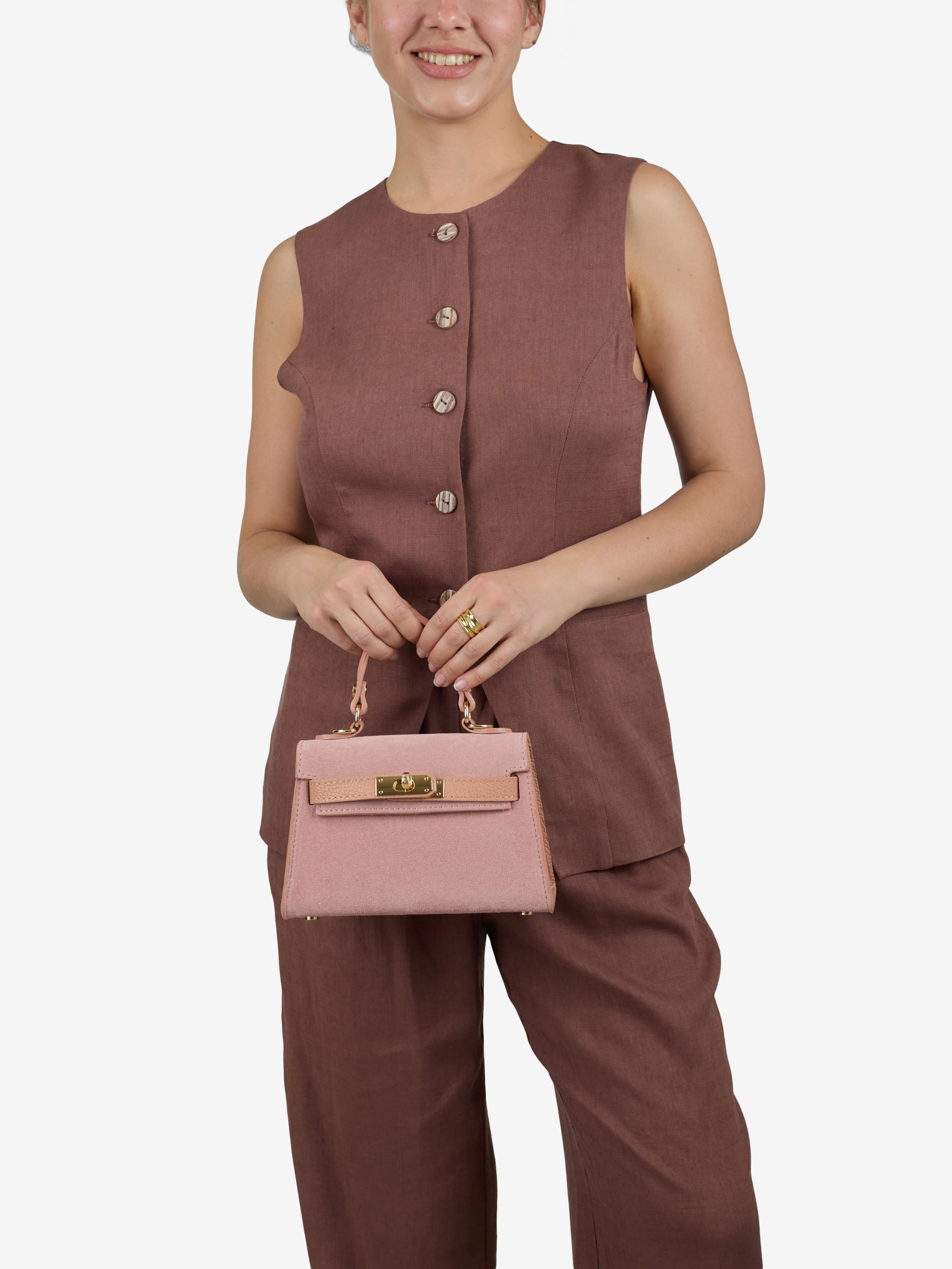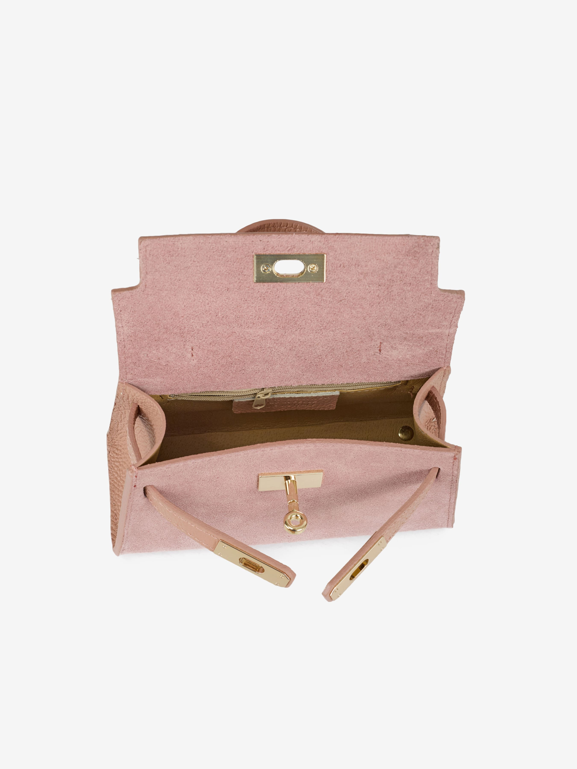 Детали: Материал: 100% натуральная кожа флотар, замша Фурнитура золотистого цвета Размеры (Ш x В x Г) - 20 x 13 x 8 см Внутри 1 отделение, 1 карманчик на молнии для мелочей Подкладка: отсутсвует Застежка: клапан на поворотном замке Высота ручки: 8 см. Ремешок кожаный, съемный, регулируется, максимальная длина 110 см