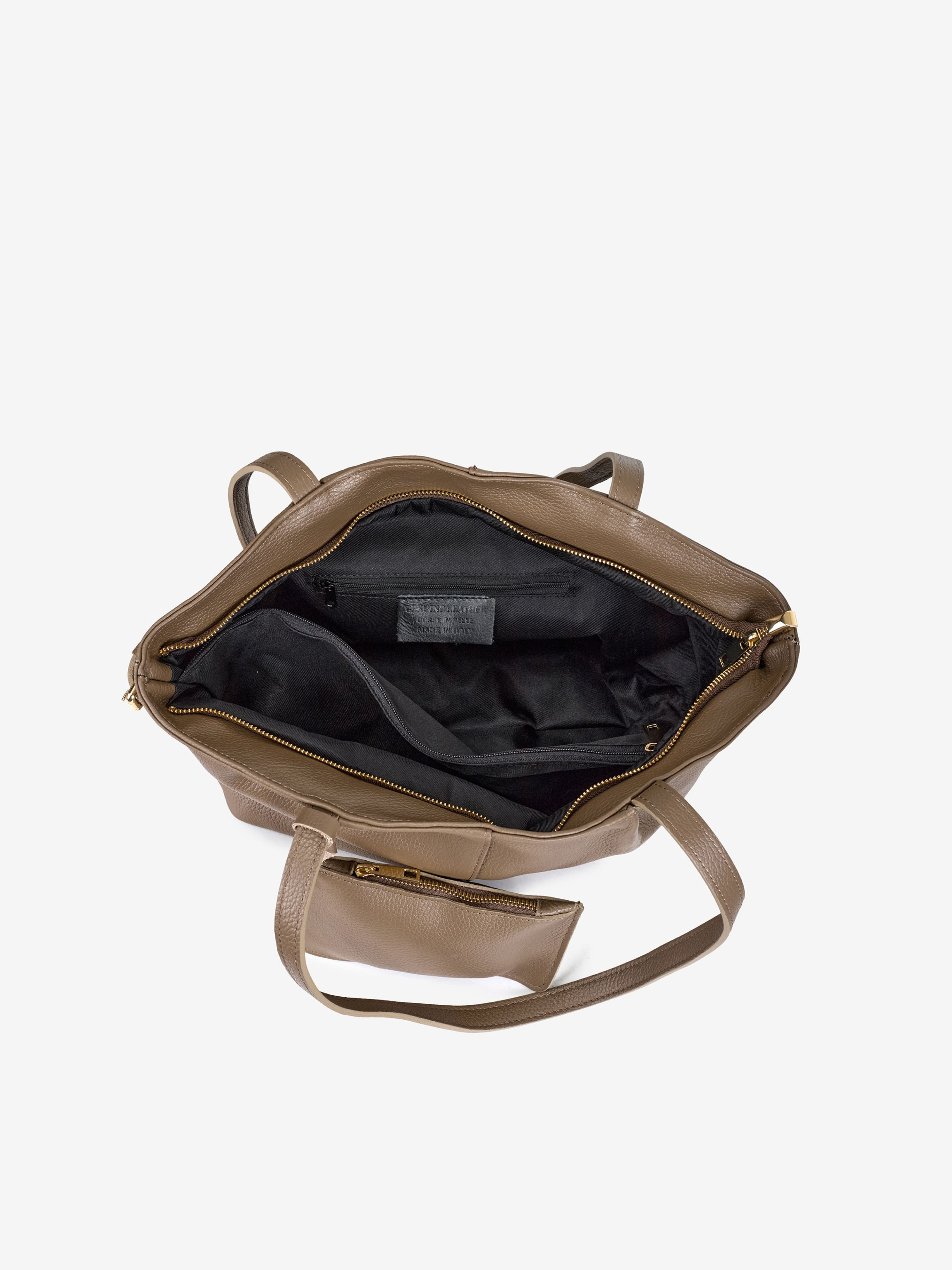 Детали: Материал: 100% натуральная кожа флотар Фурнитура золотистого цвета Размеры (Ш x В x Г) - 30 x 25 x 13 см Внутри 2 раздельных отделения на молнии и карманчик на молнии для мелочей Спереди сьемный кошелек Подкладка: хлопок Застежка: молния Высота ручек 30 см