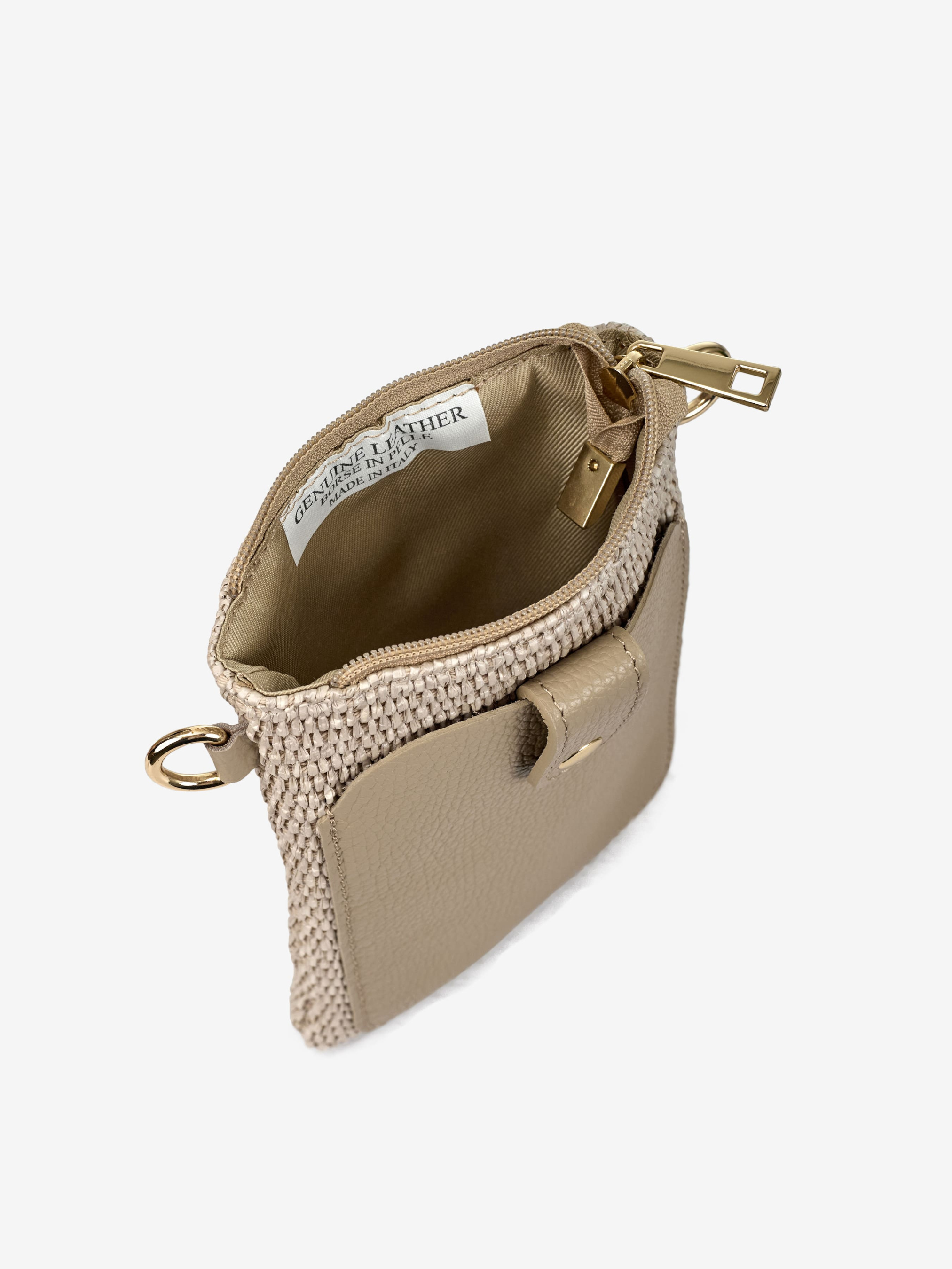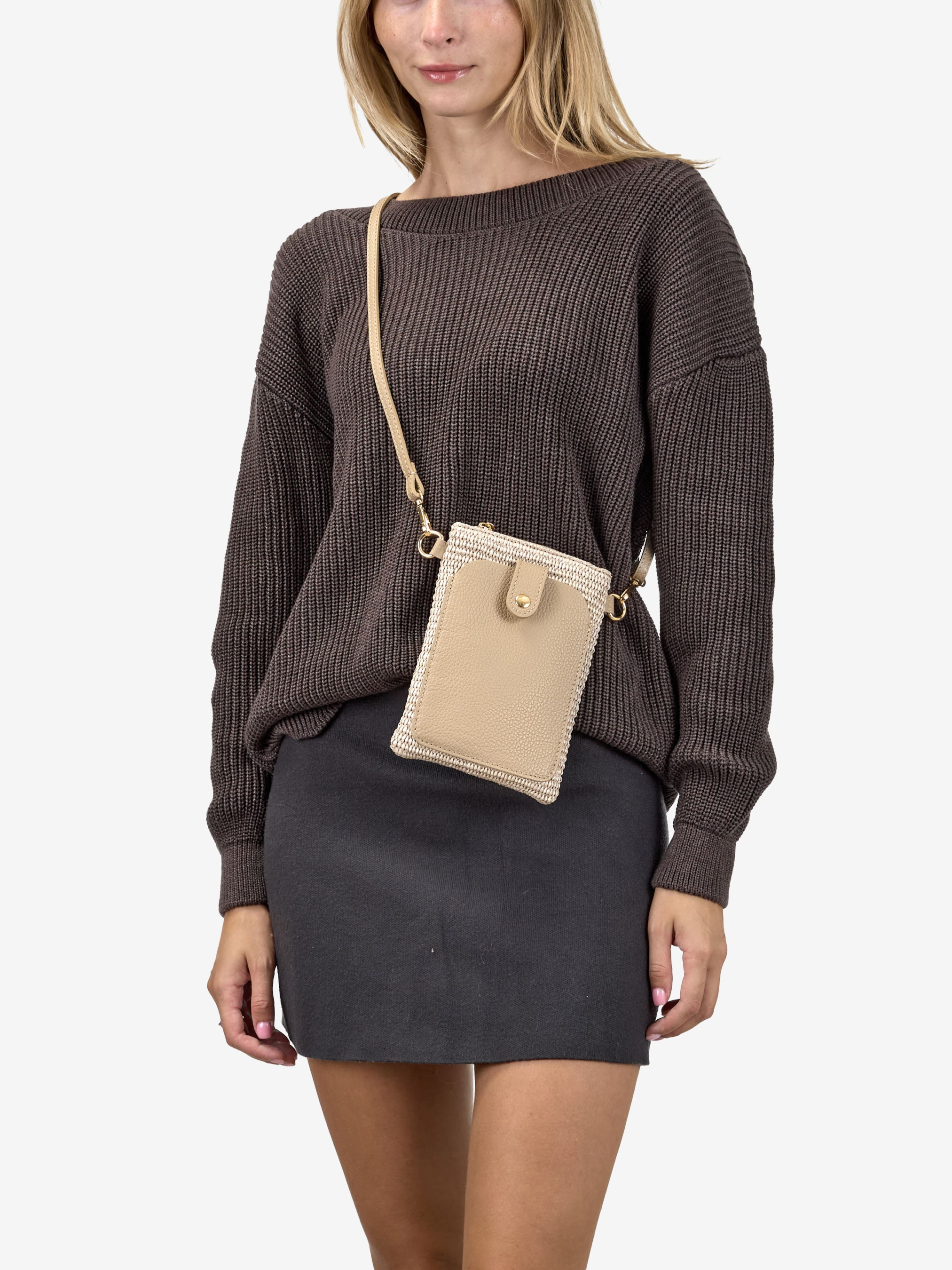 Детали: Материал: 100% натуральная кожа флотар, бумажная солома Фурнитура золотистого цвета Размеры (Ш x В x Г) - 13 x 20 x 4 см Внутри 1 отделение Спереди карманчик на магните Подкладка: хлопок Застежка: молния Ремешок кожаный, съемный, регулируется, максимальная длина 115 см