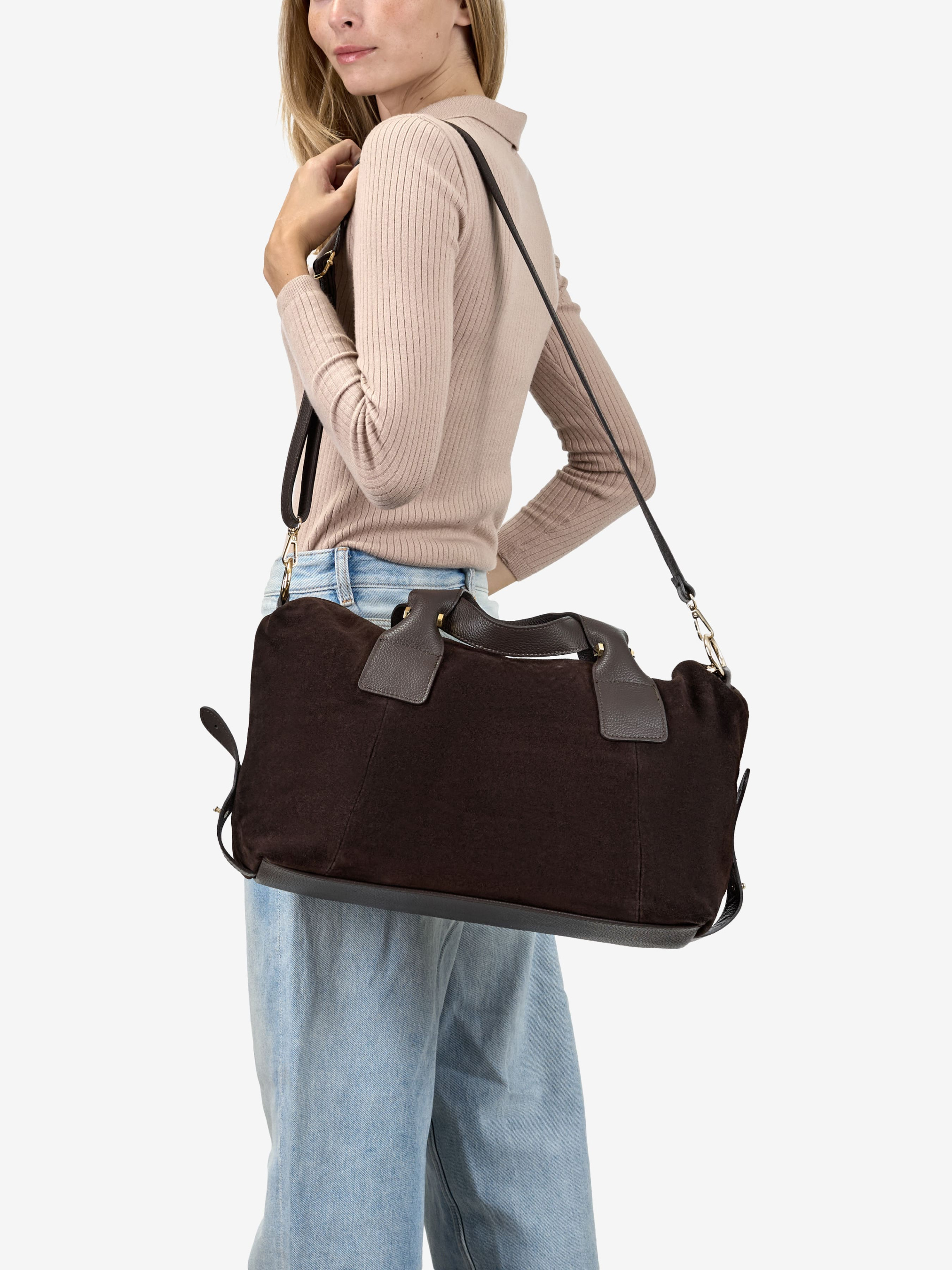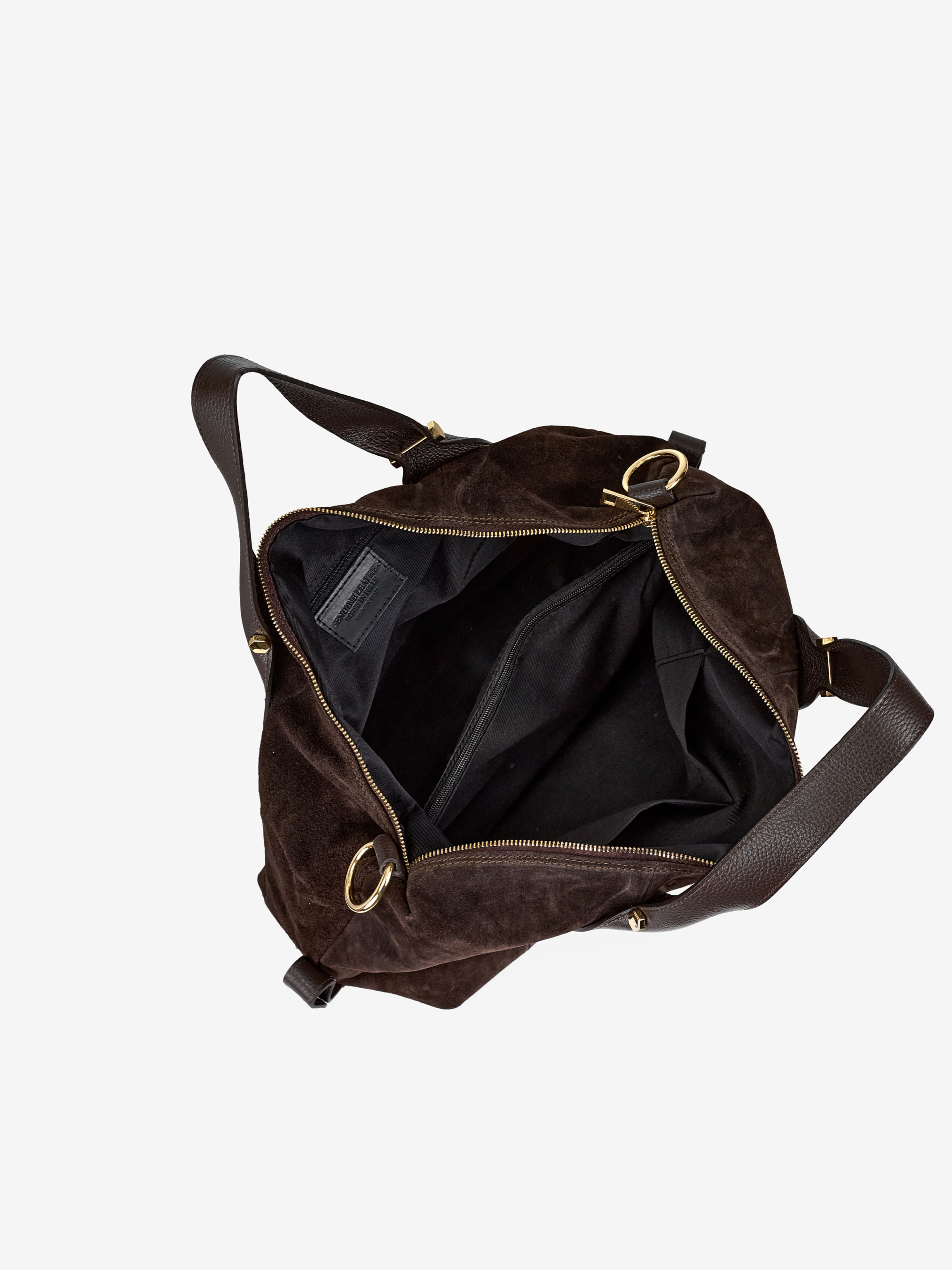 Детали: Материал: 100% натуральная замша, натуральная кожа флотар Фурнитура золотистого цвета Размеры (Ш x В x Г) - 39 x 25 x 13 см Внутри 2 раздельных отделения на молнии, 2 карманчика без молнии для мелочей, карманчик на молнии для мелочей По бокам есть регуляторы высоты сумки Подкладка: хлопок Застежка: молния Ремешок кожаный, съемный, регулируется, максимальная длина 120 см, Высота ручек 15 см