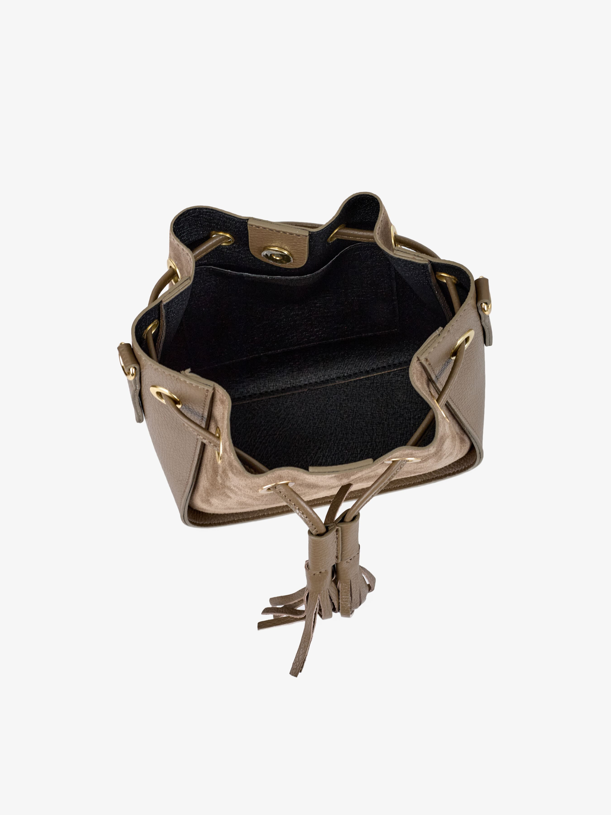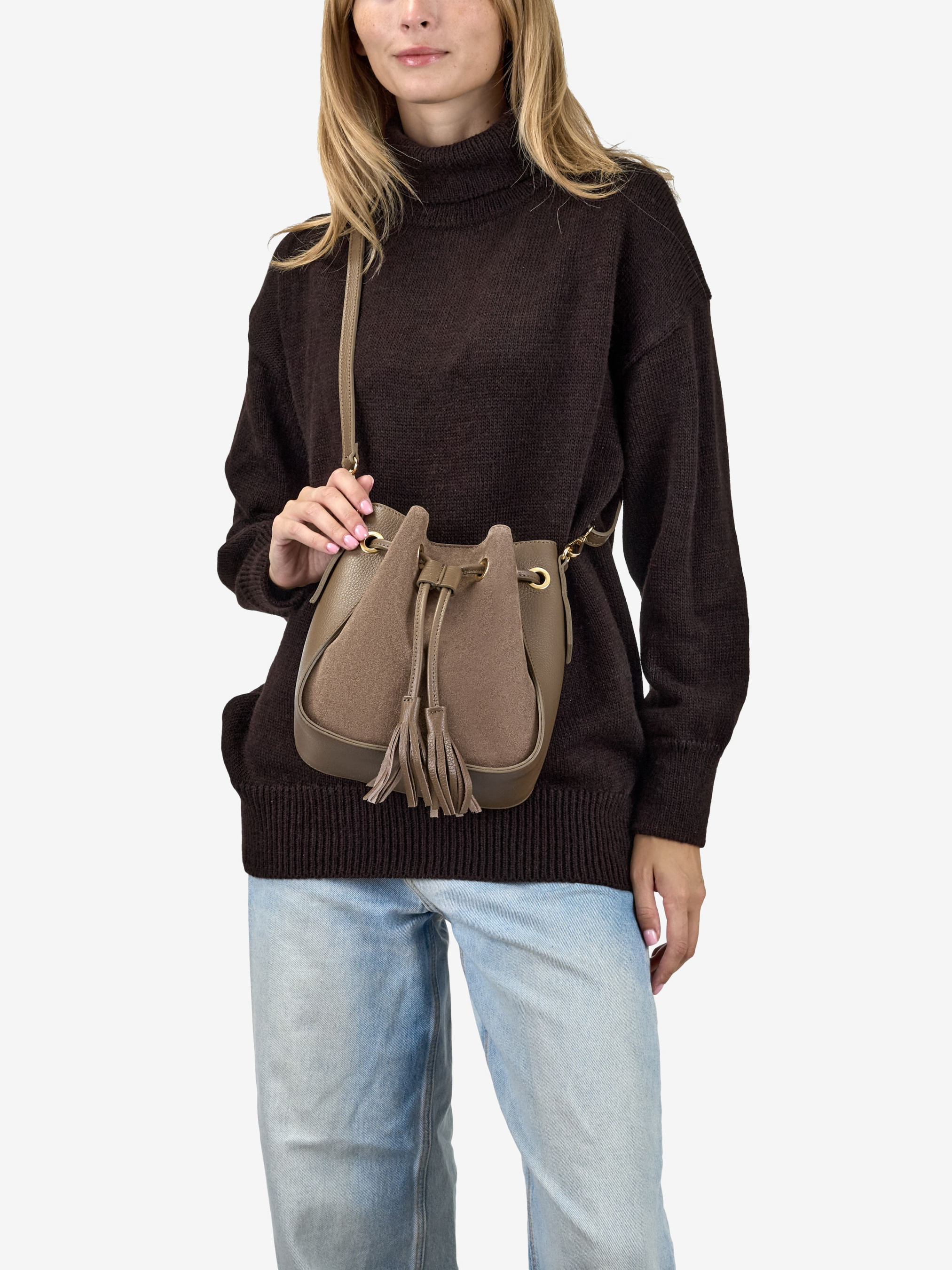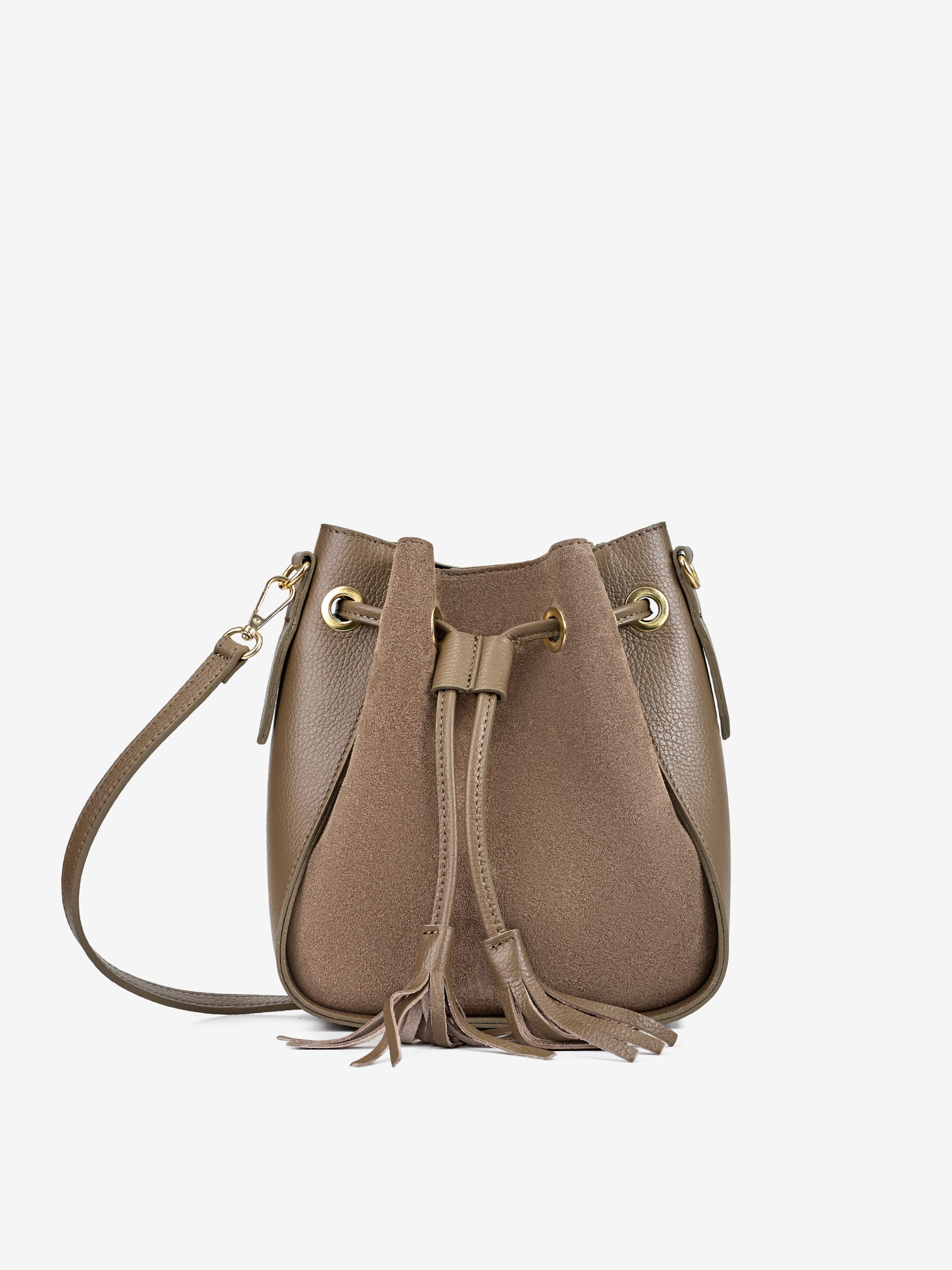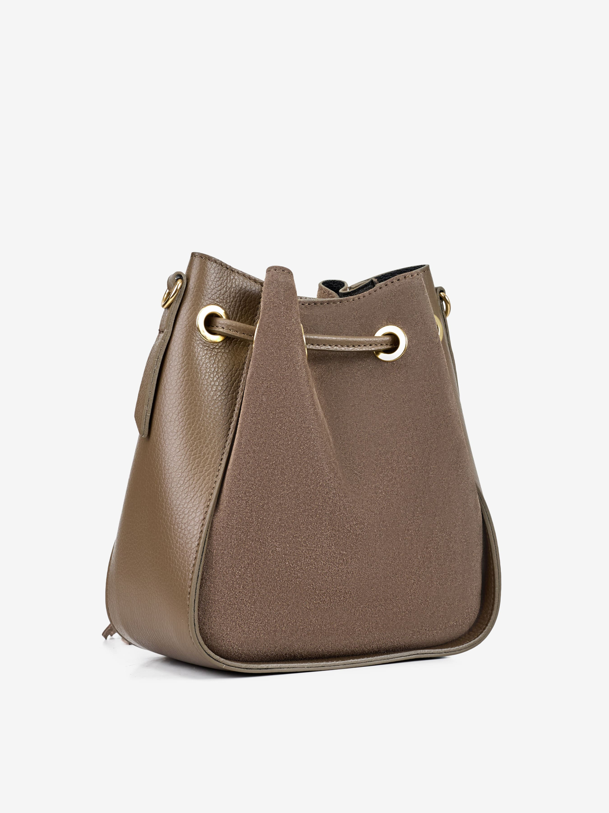 Детали: Материал: 100% натуральная замша, натуральная кожа флотар Фурнитура золотистого цвета Размеры (Ш x В x Г) - 20 x 22 x 11 см Внутри 1 отделение и карманчик без молнии для мелочей Подкладка: без подкладки Застежка: магнит, затяжка Ремешок кожаный, съемный, регулируется, максимальная длина 115 см