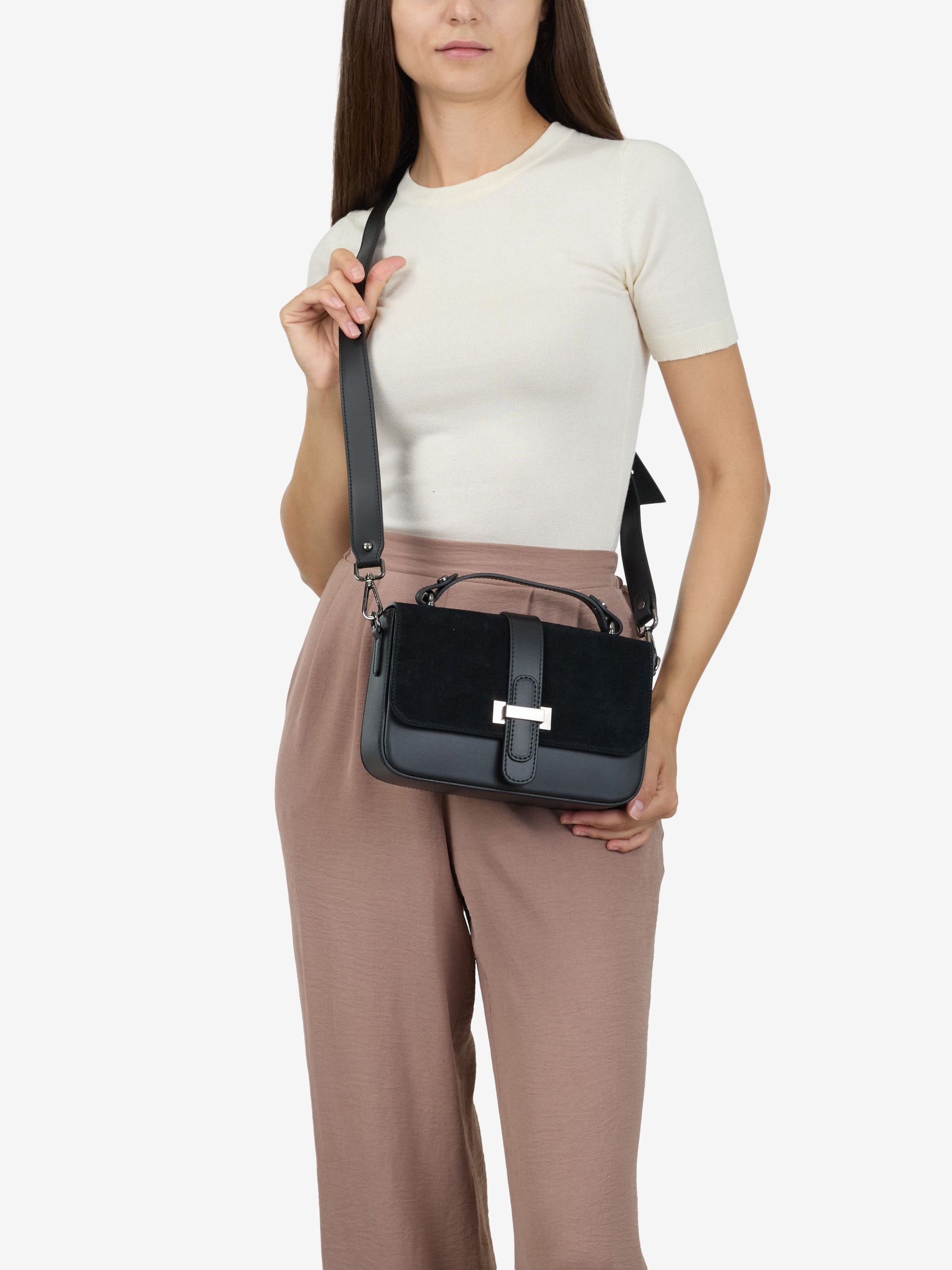 Детали: Материал: 100% натуральная замша, натуральная гладкая кожа Фурнитура черного цвета Размеры (Ш x В x Г) - 25 х 15 х 7 см Внутри 1 отделение и карманчик для мелочей на молнии, сзади карманчик без застежки Подкладка: хлопок Застежка: молния, клапан на магнитах Ремешок кожаный , съемный, регулируется, максимальная длина 110 см Высота ручки 5 см