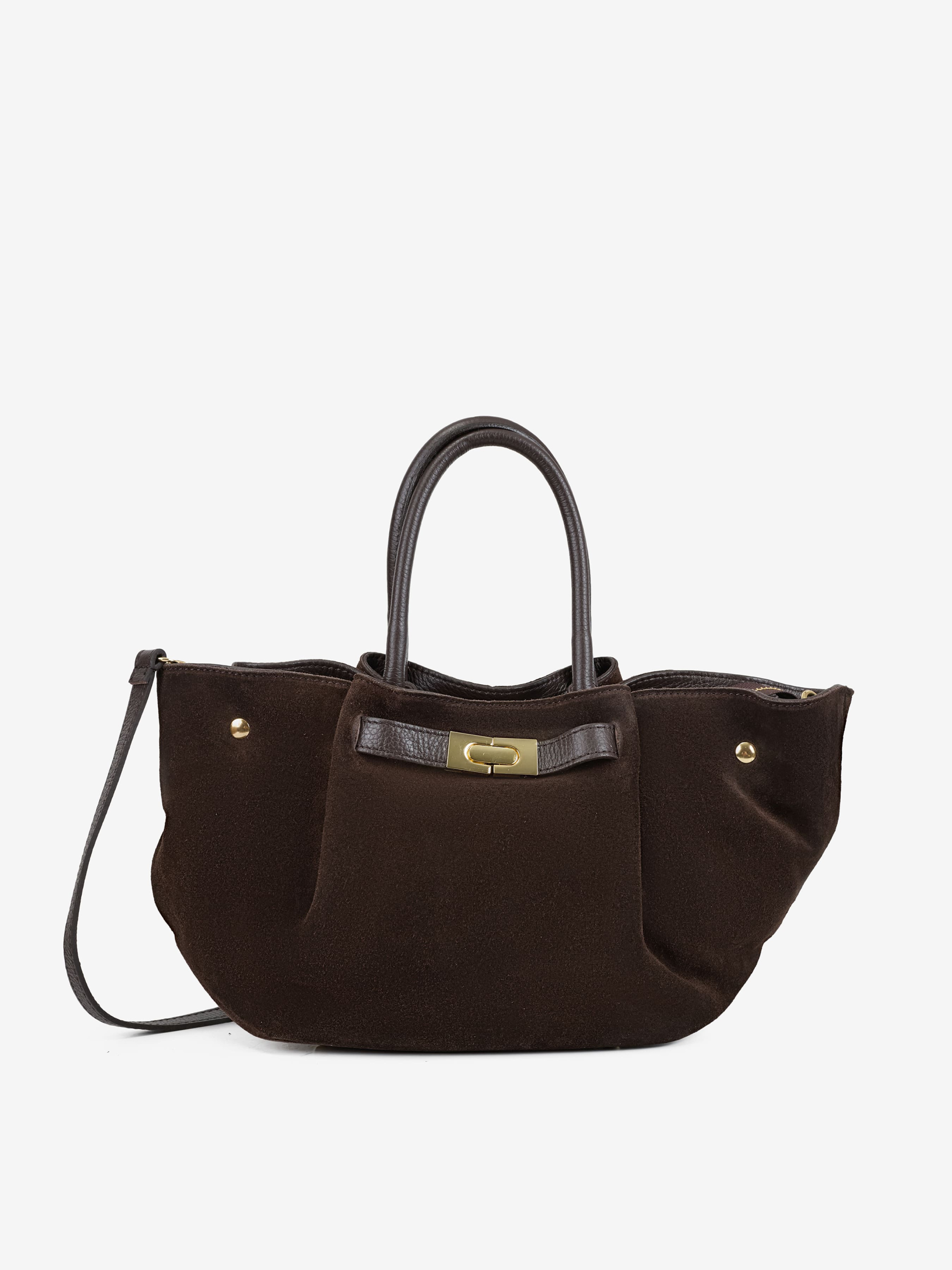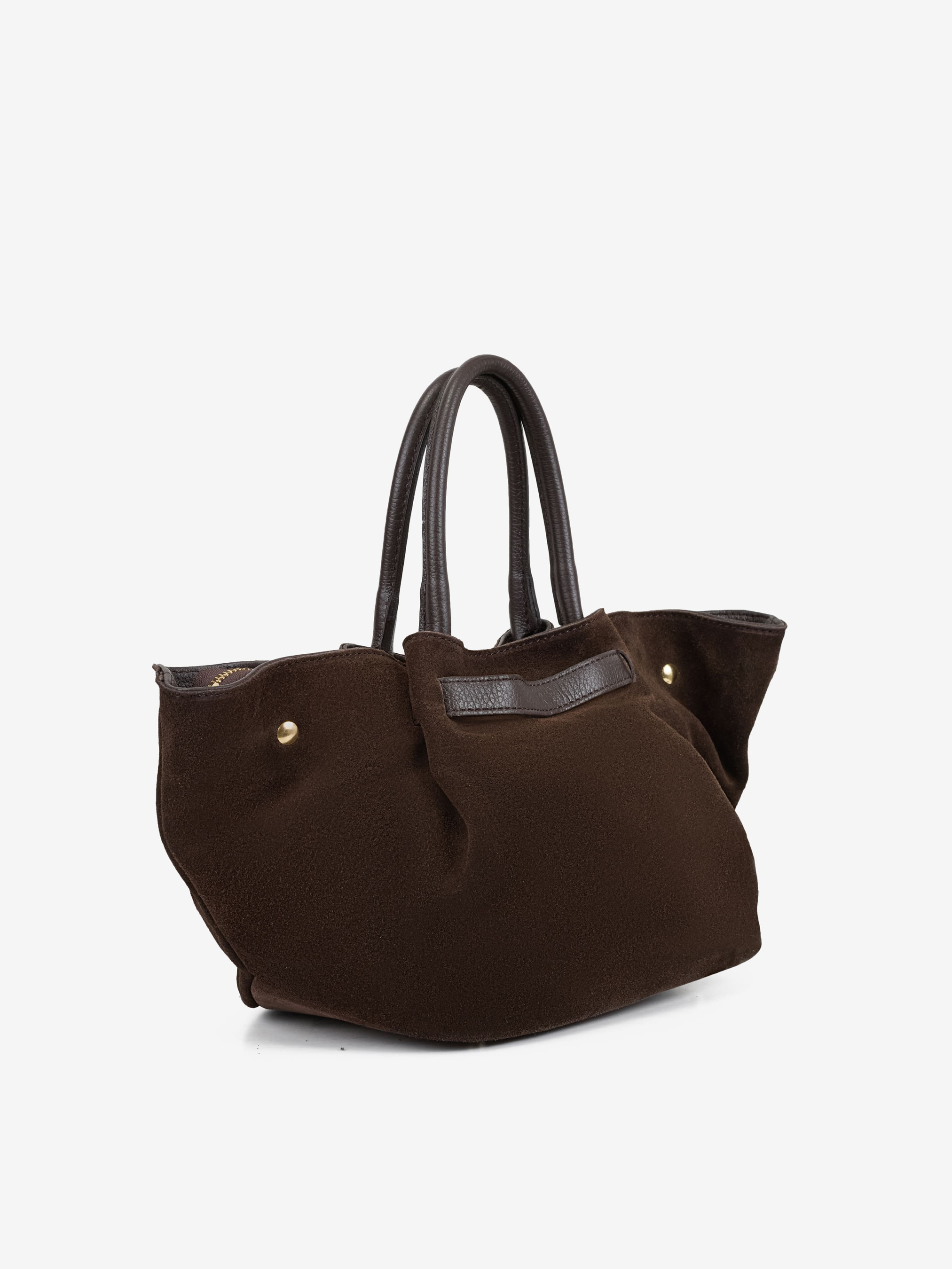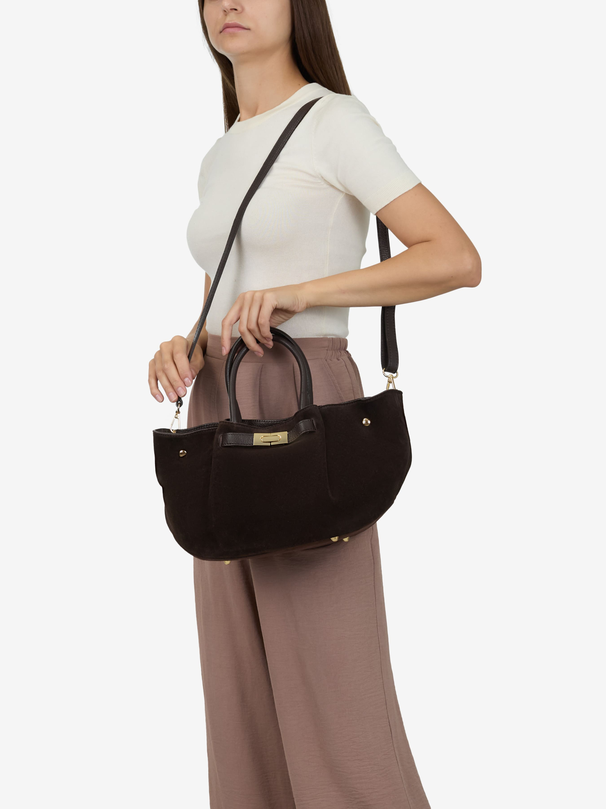 Детали: Материал: 100% натуральная замша Фурнитура золотистого цвета Размеры (Ш x В x Г) - 32 x 21 x 16 см Внутри 1 отделение, 1 карманчик на молнии Подкладка: хлопок Застежка: молния Высота ручек 15 см Ремешок кожаный, съемный, регулируется, максимальная длина 120 см
