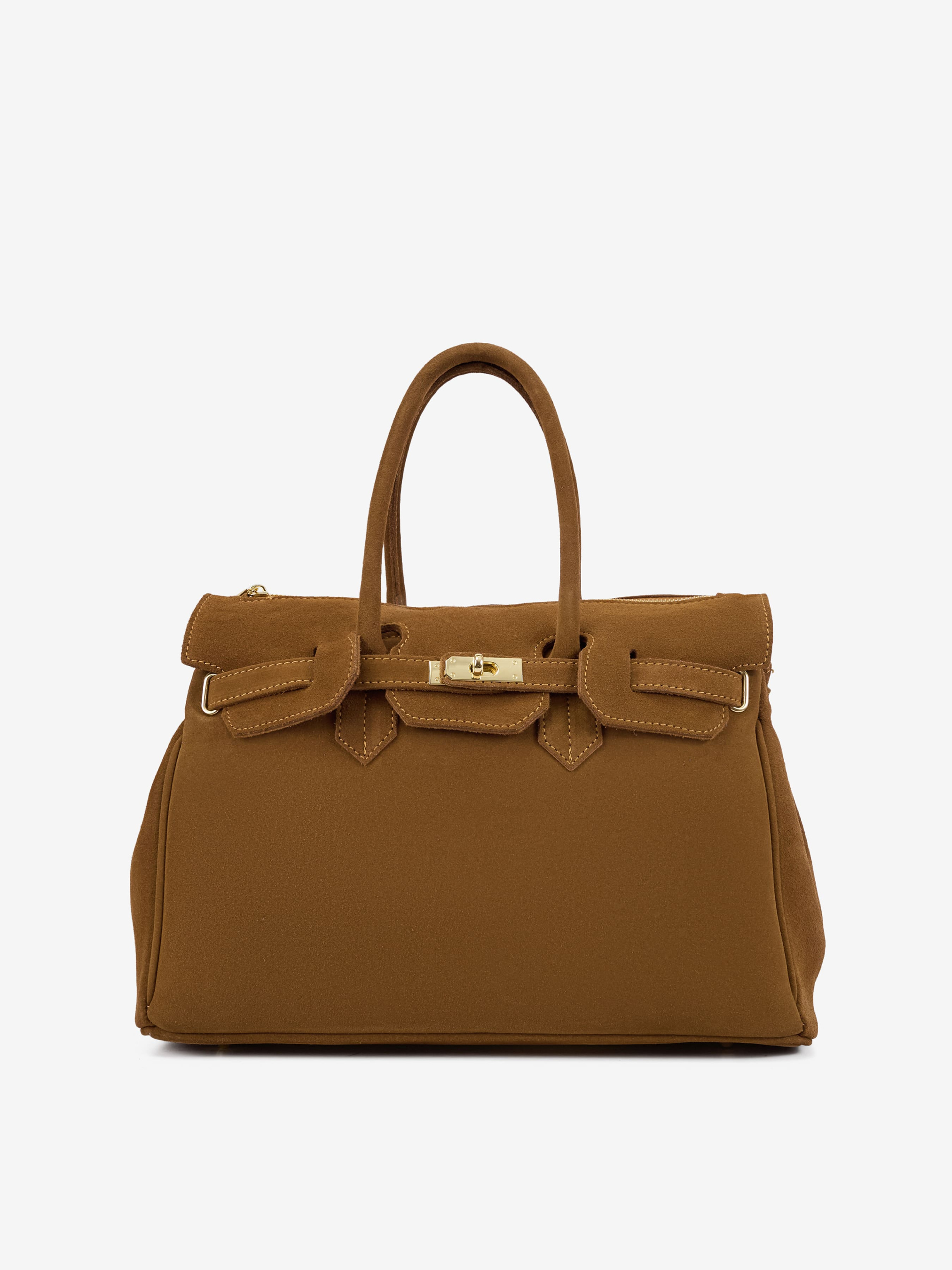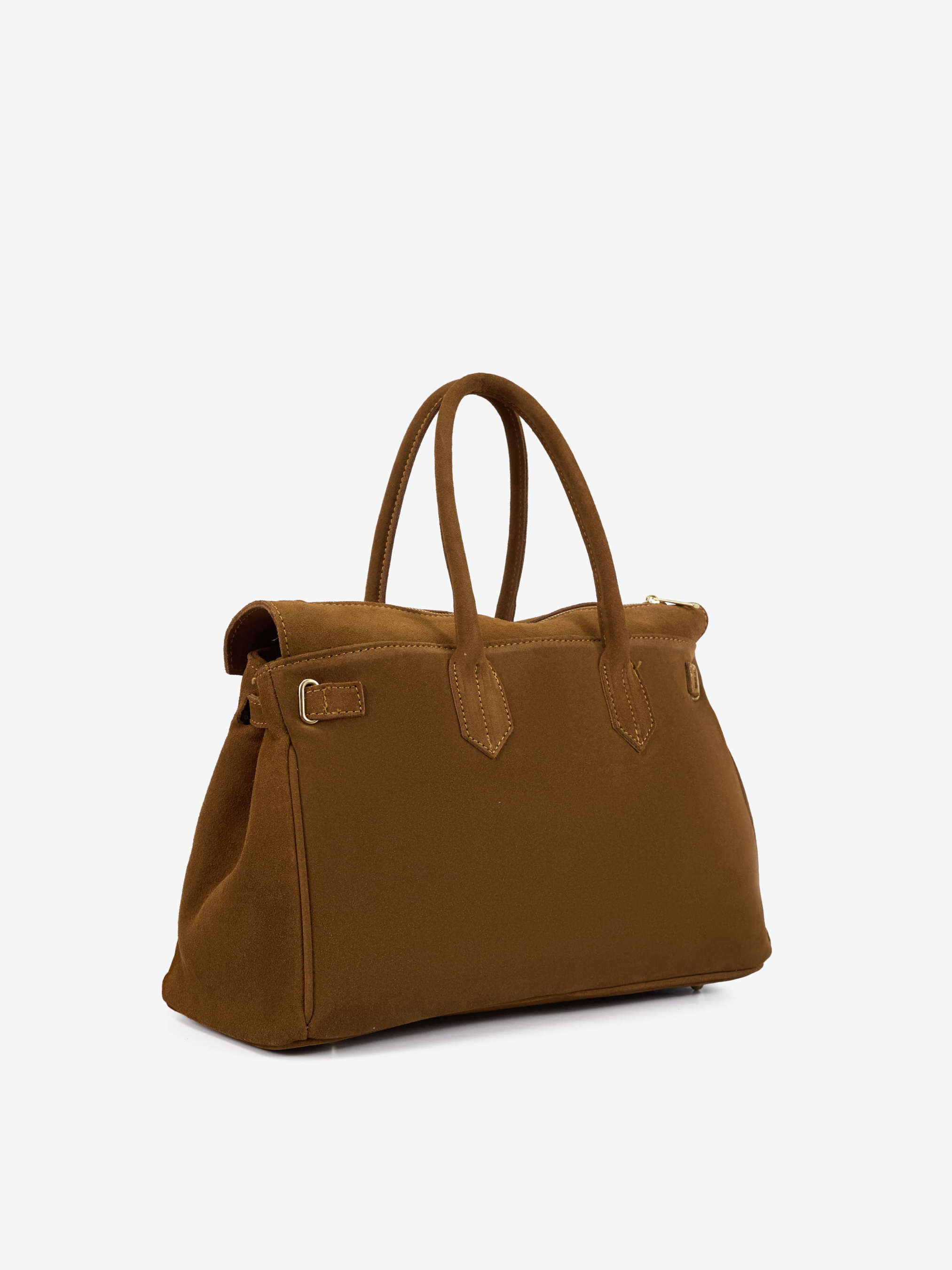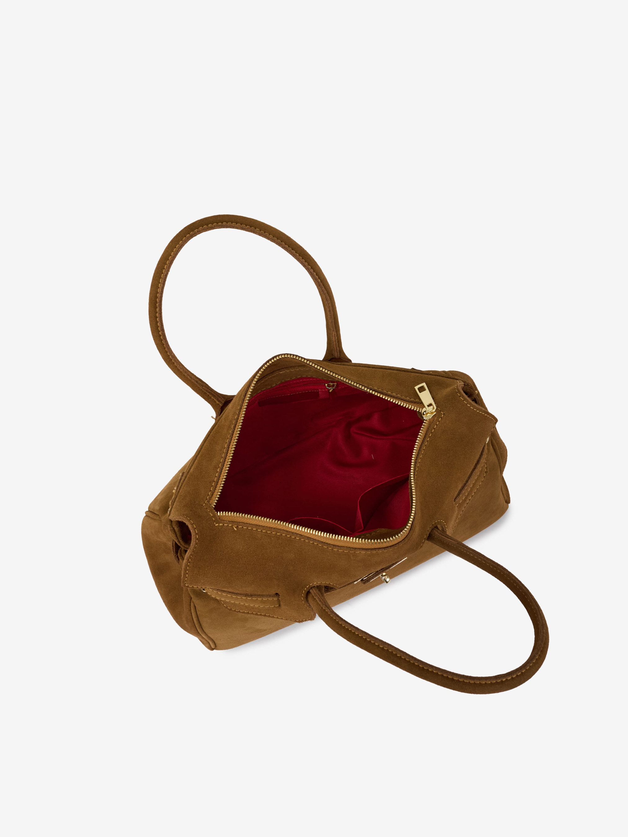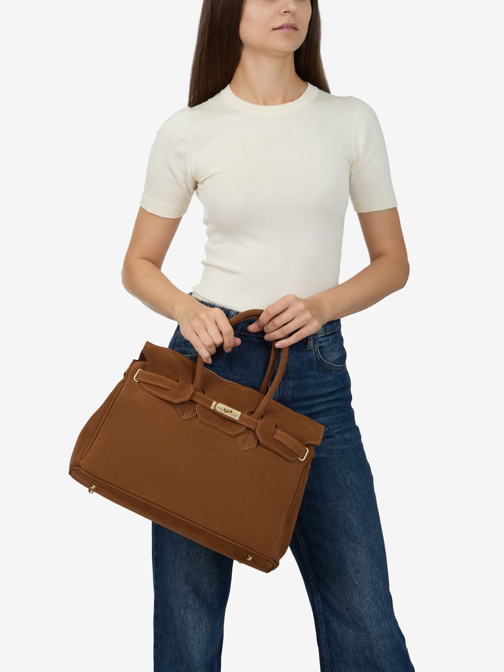 Детали: Материал: 100% натуральная замша Фурнитура золотистого цвета Размеры (Ш x В x Г) - 38 x 30 x 18 см Внутри 1 отделение и 3 карманчика, один из них на молнии Подкладка: хлопок Застежка: молния Высота ручек 18 см