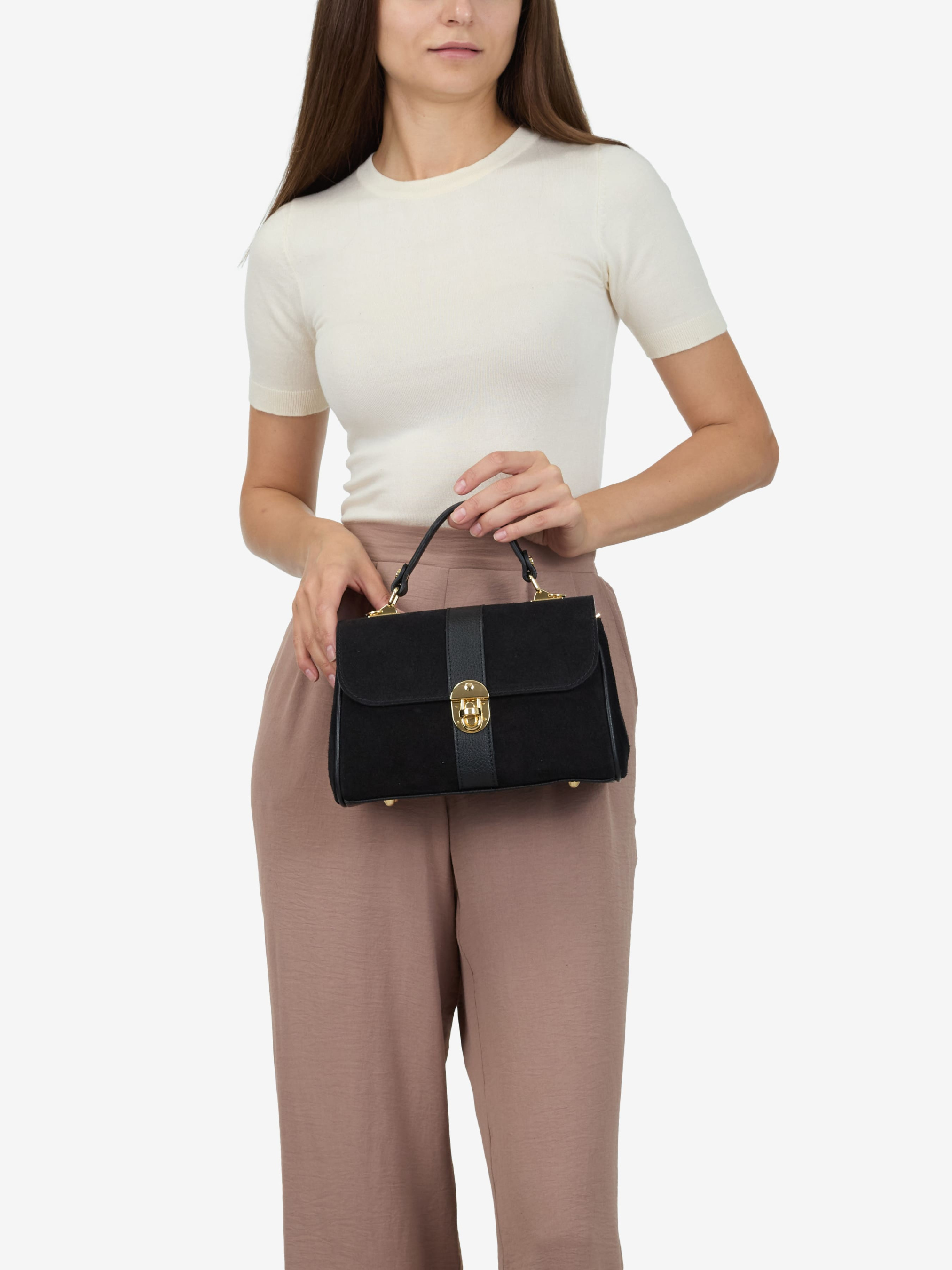 Детали: Материал: 100% натуральная замша, натуральная кожа флотар Фурнитура золотистого цвета Размеры (Ш x В x Г) - 25 x 17 x 10 см Внутри 2 отдельных отделение на молниии карманчик на молнии для мелочей. Подкладка: хлопок Застежка: молния, клапан на поворотном замке Ремешок кожаный, съемный,регулируется, максимальная длина 120 см Высота ручки 8 см