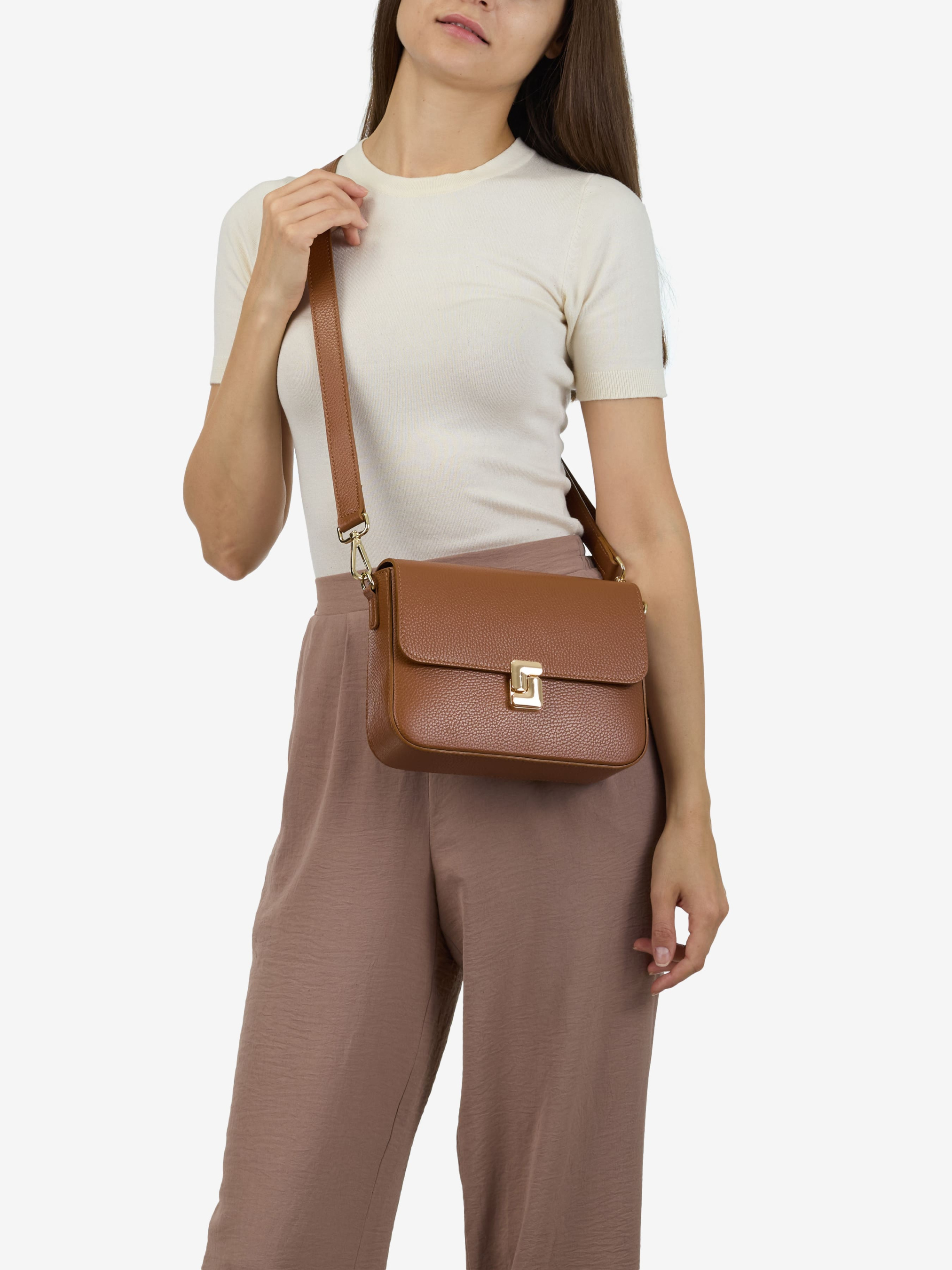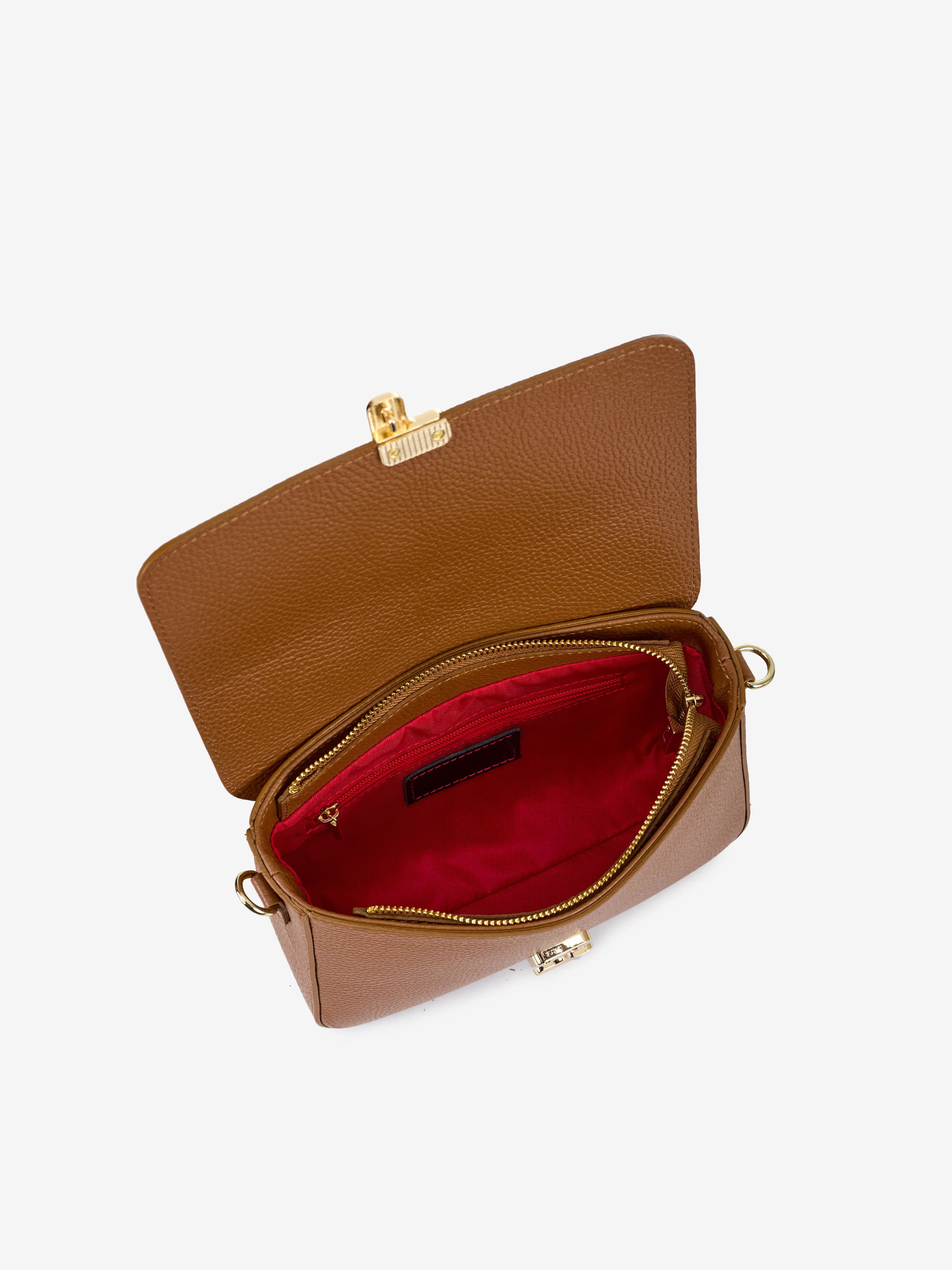 Детали: Материал: 100% натуральная кожа флотар Фурнитура золотистого цвета Размеры (Ш x В x Г) - 24 x 17 x 7 см Внутри 1 отделение и карманчик на молнии Подкладка: хлопок Застежка: молния и клапан на замке Высота ручки 26 см Ремешок кожаный, съемный, регулируется, максимальная длина 100 см