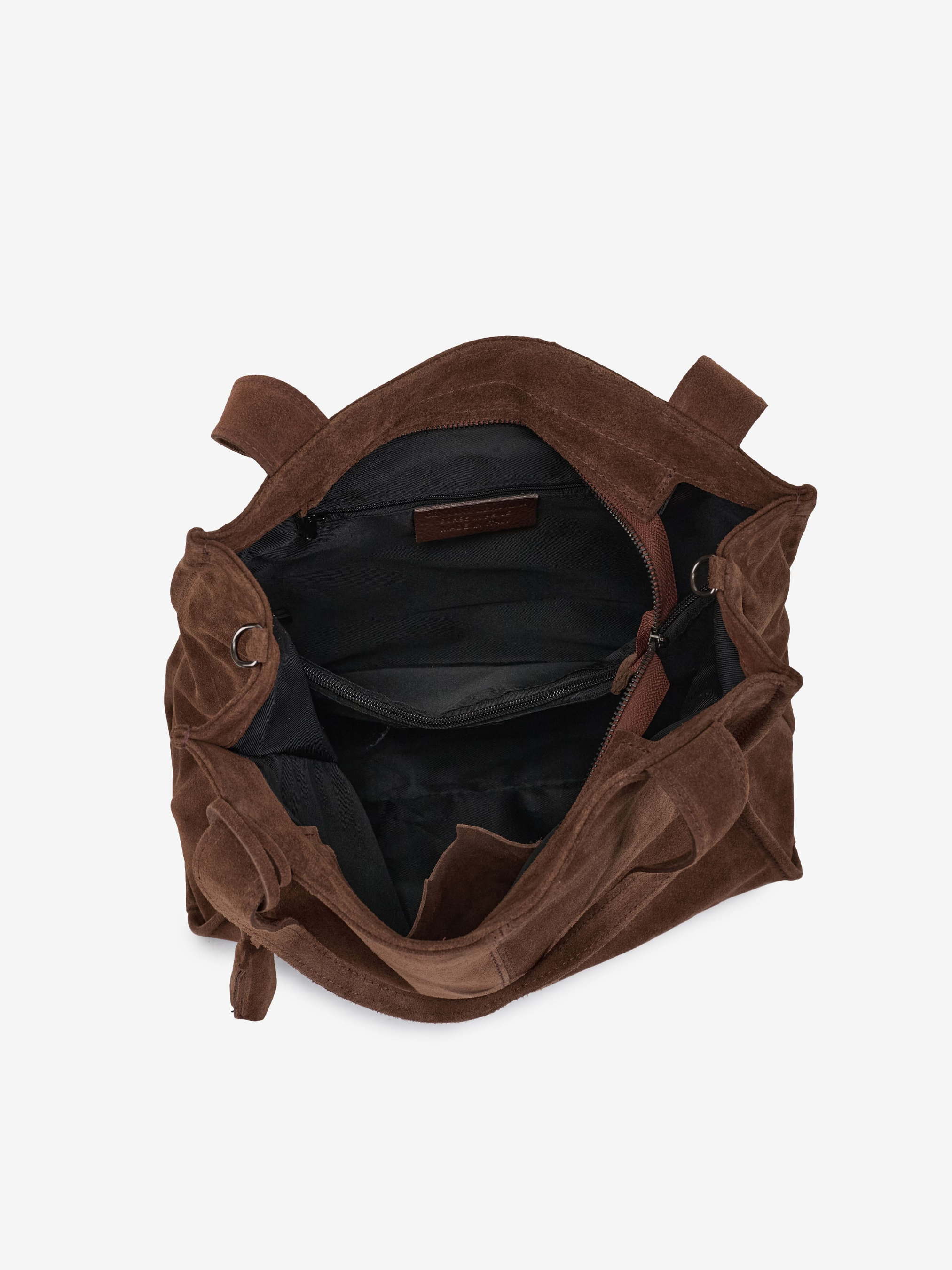 Детали: Материал: 100% натуральная замша Фурнитура серебристого цвета Размеры (Ш x В x Г) - 34 х 32 х 10 см Внутри 2 отделения разделены карманом на молнии, карманчик для мелочей на молнии и карманчик для смартфона без застежки Подкладка: хлопок Застежка: молния Ремешок кожаный, съемный, регулируется, максимальная длина 110 см Высота ручки 23 см
