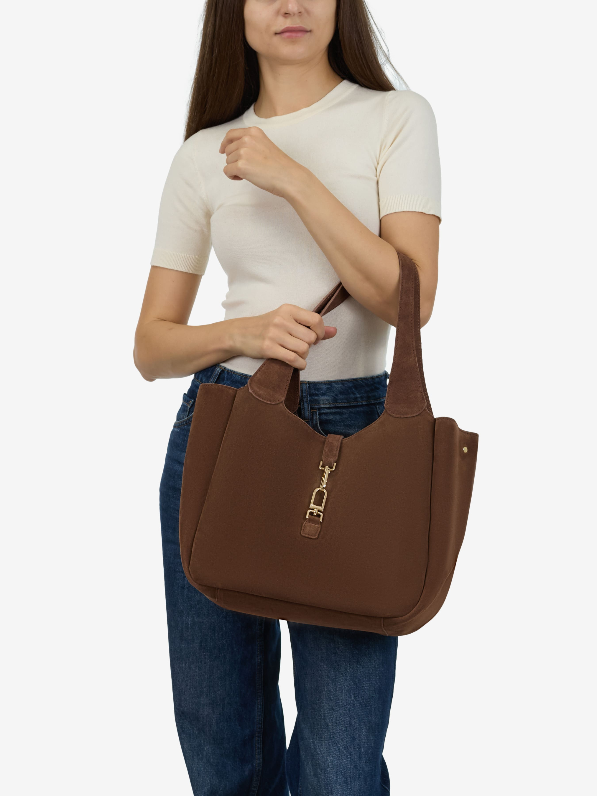 Детали: Материал: 100% натуральная замша Фурнитура золотистого цвета Размеры (Ш x В x Г) - 33х28х13 см Внутри 1 отделение со сьемной косметичкой Подкладка: нет Застежка: карабин Ремешок змшевый, съемный, регулируется, максимальная длина 110 см Высота ручек 30 см
