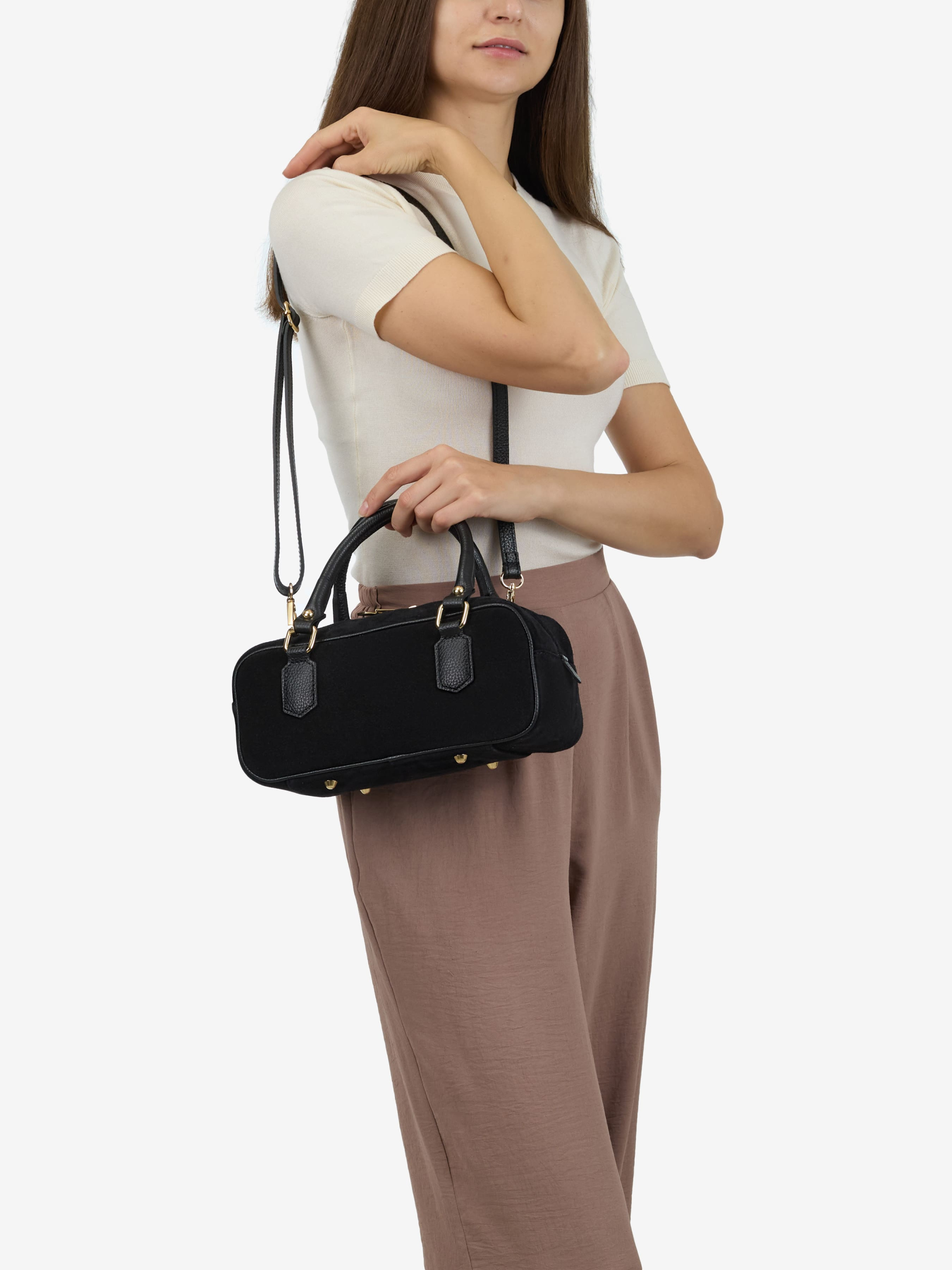 Детали: Материал: 100% натуральная замша, 100% натуральная кожа флотар Фурнитура золотистого цвета Размеры (Ш x В x Г) - 28х12х12 см Внутри 1 отделение Подкладка: хлопок Застежка: молния Ремешок кожаный, съемный, регулируется, максимальная длина 115 см Высота ручек 14 см