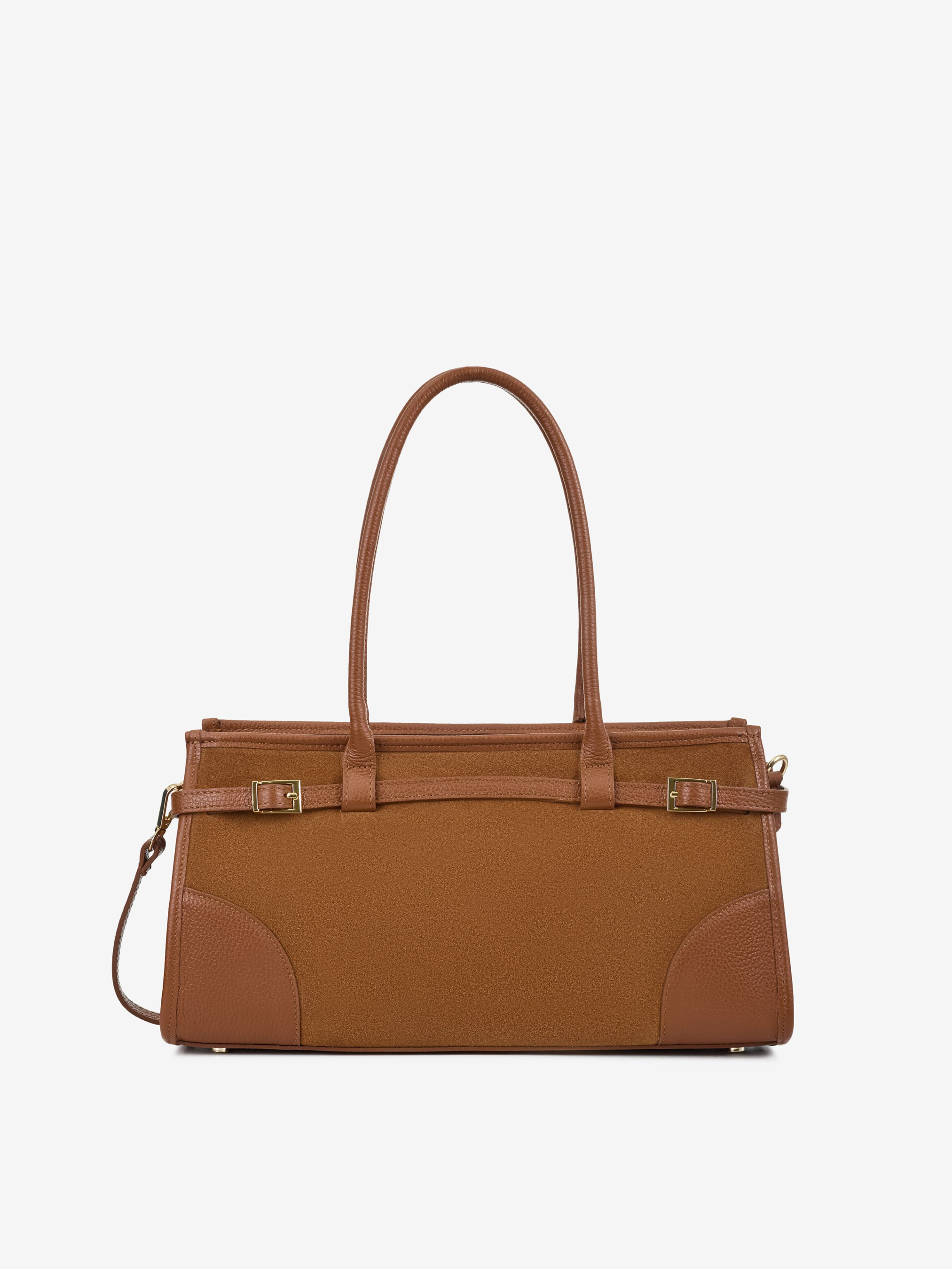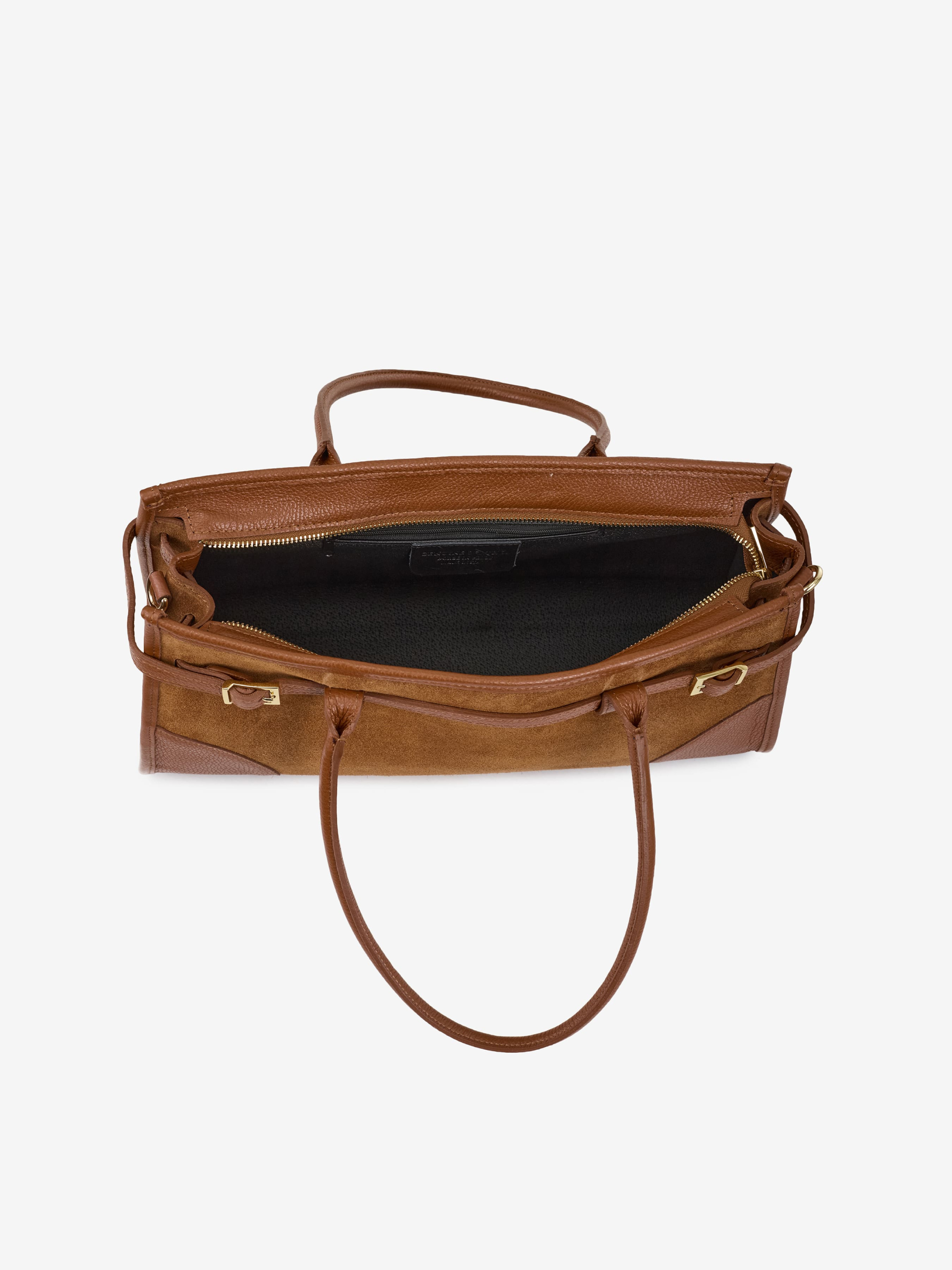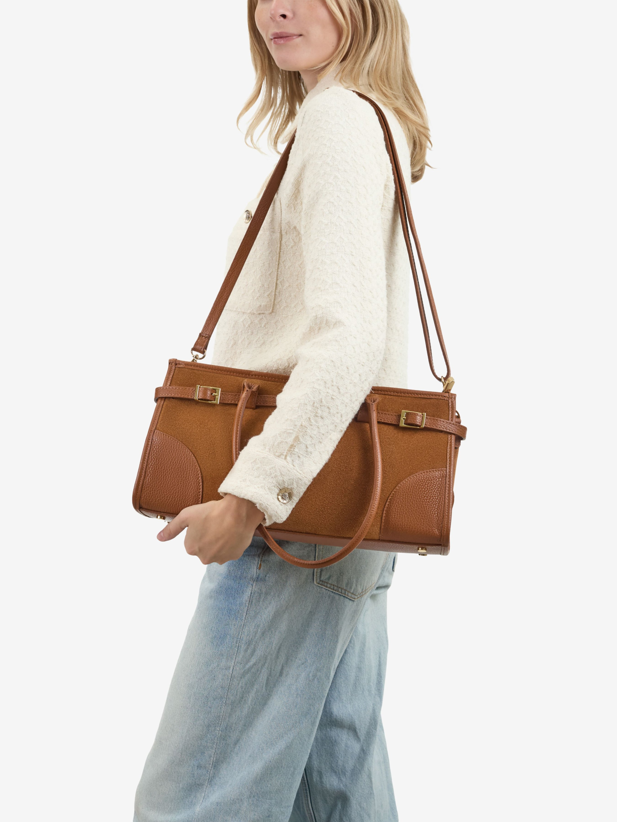 Детали: Материал: 100% натуральная кожа флотар, замша Фурнитура золотистого цвета Размеры (Ш x В x Г) - 38 x 20 x 12 см Внутри 1 отделение, 1 карманчик на молнии для мелочей Подкладка: отсутствует Застежка: молния Высота ручки: 23 см Ремешок кожаный, съемный, регулируется, максимальная длина 125 см