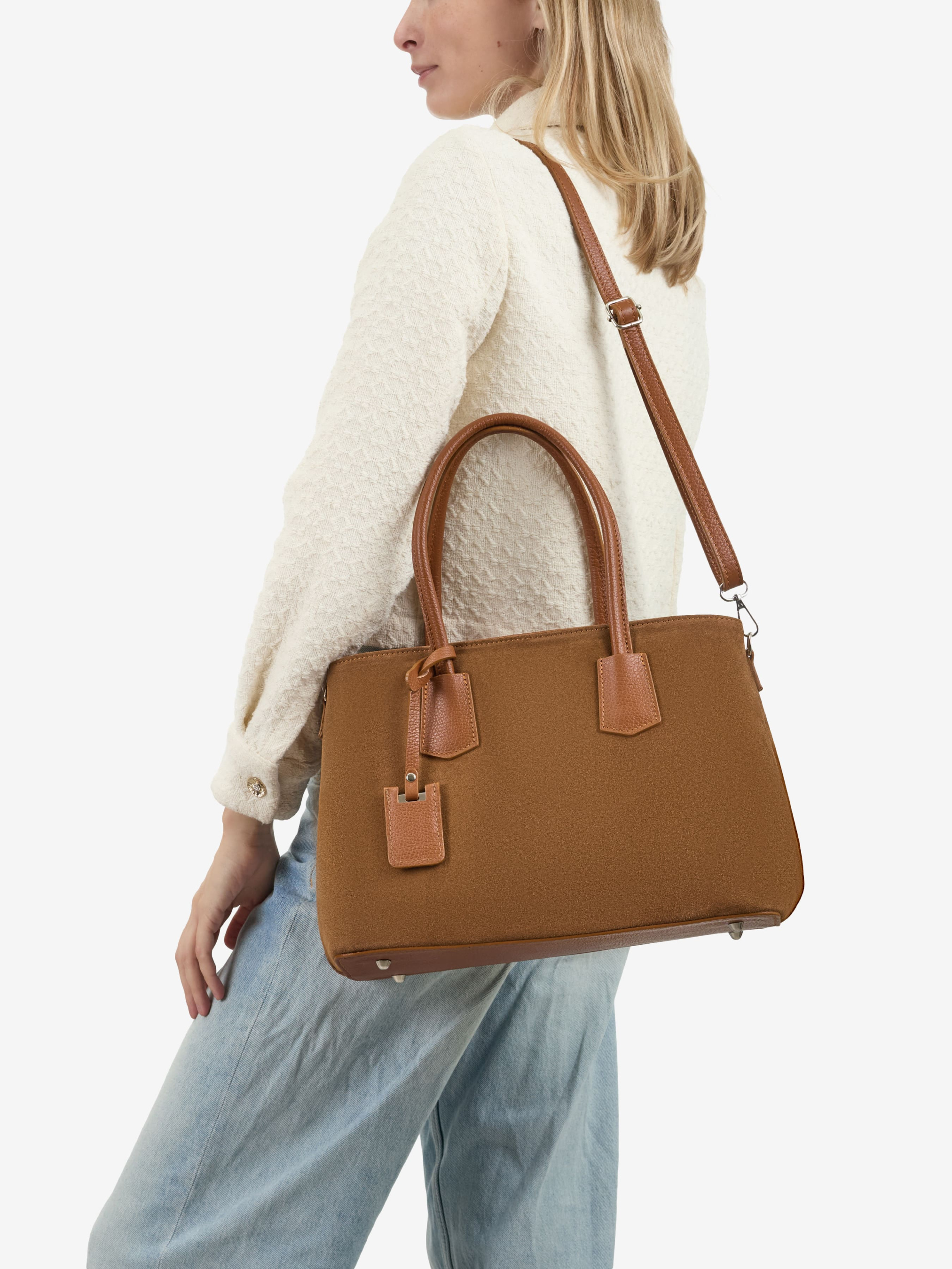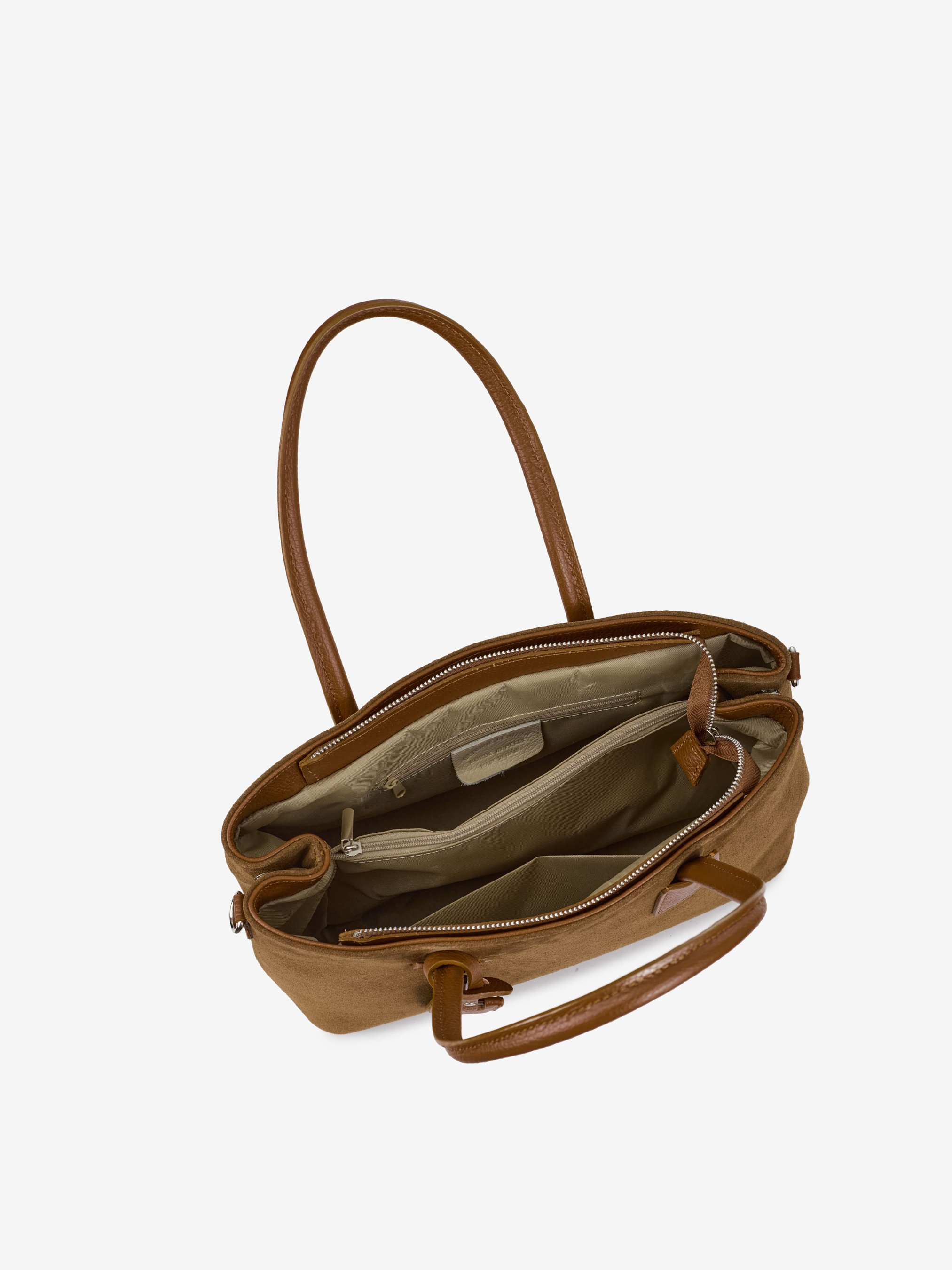 Детали: Материал: 100% натуральная кожа флотар, замша Фурнитура серебристого цвета Размеры (Ш x В x Г) - 36 x 25 x 15 см Внутри 1 отделение, 1 карманчик на молнии для мелочей Подкладка: отсутсвует Застежка: молния Высота ручки: 8 см Ремешок кожаный, съемный, регулируется, максимальная длина 110 см