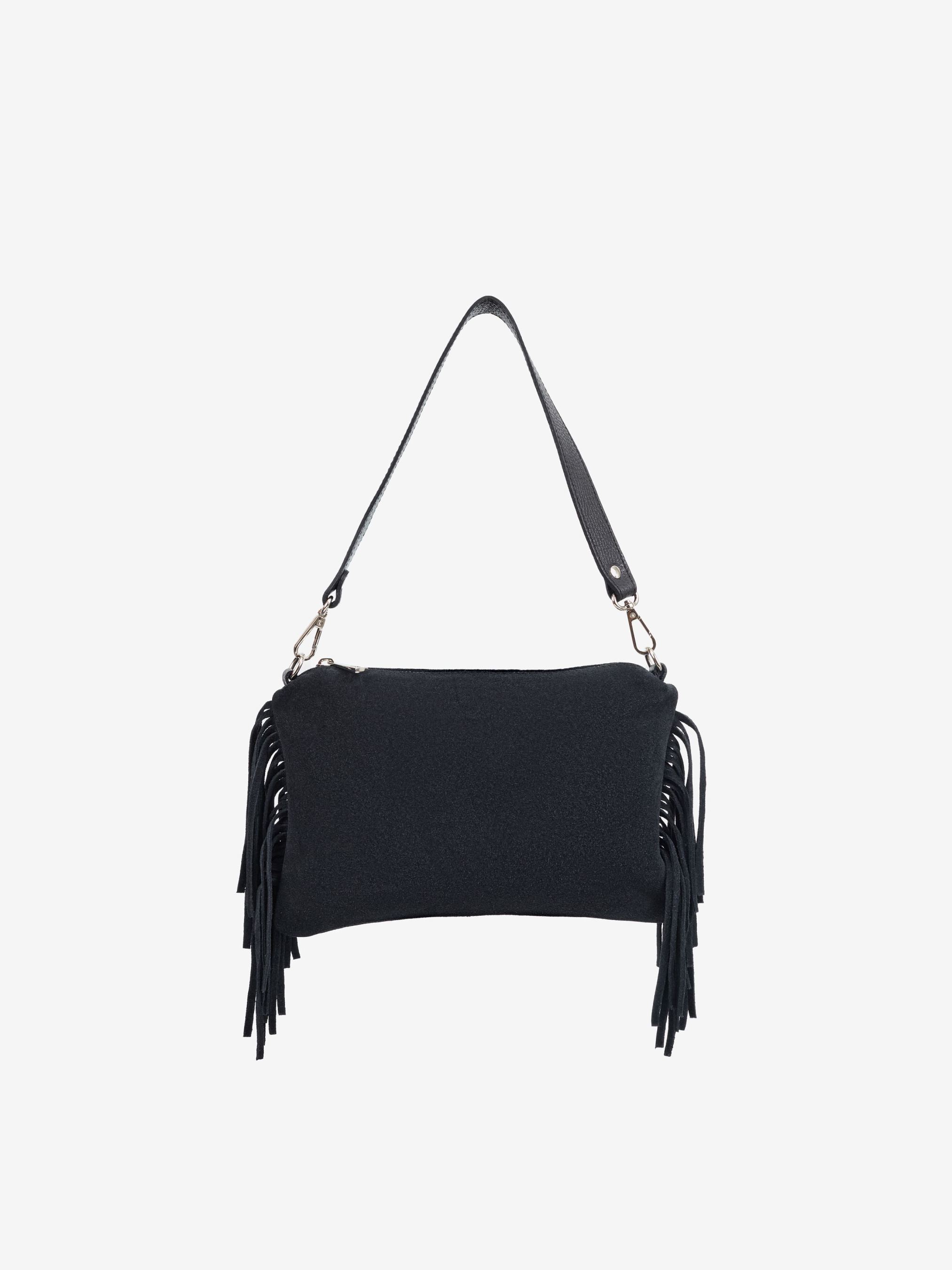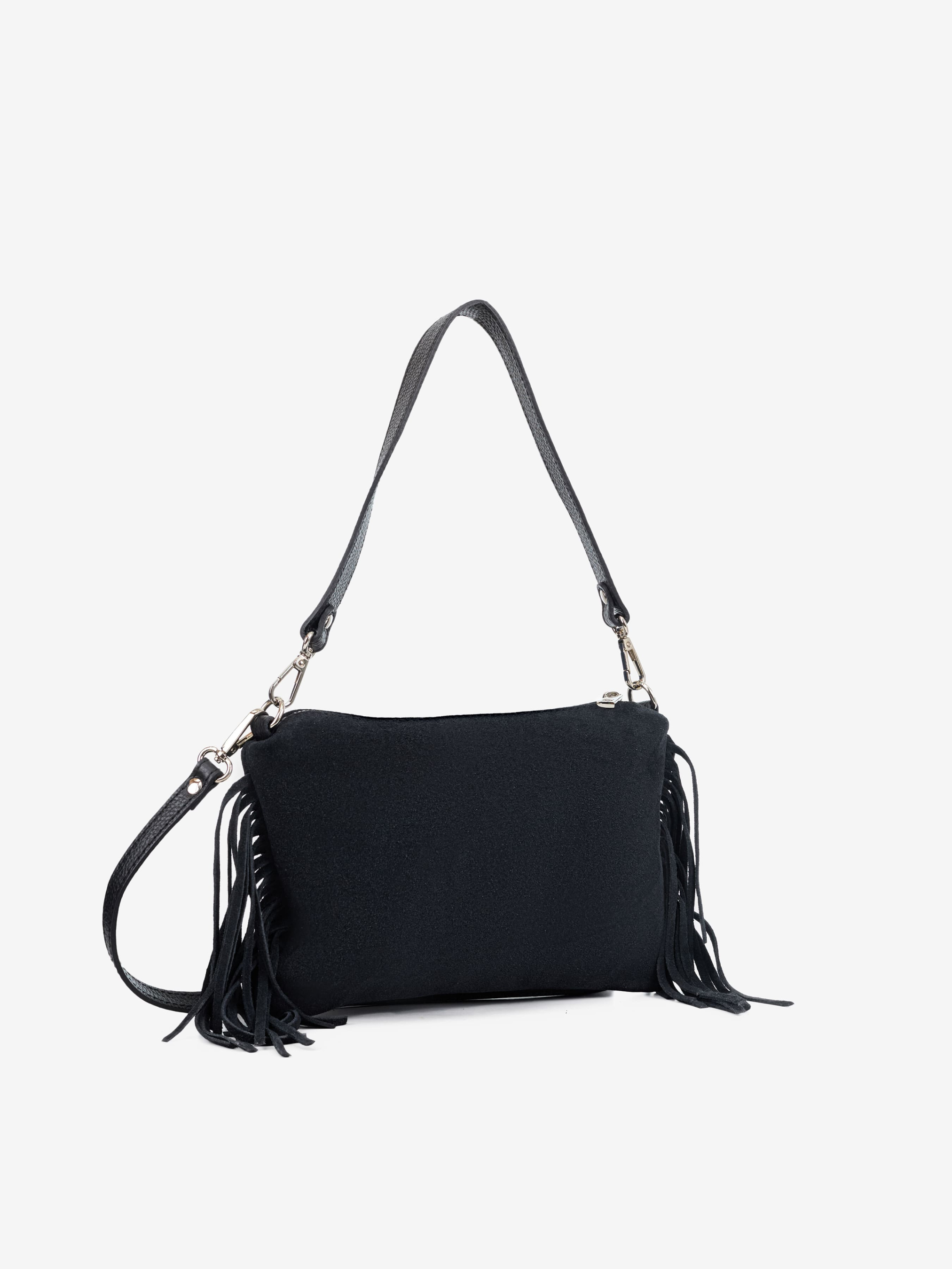 Детали: Материал: 100% натуральная замша Фурнитура серебристого цвета Размеры (Ш x В x Г) - 25 x 19 x 2 см Внутри 1 отделение и 1 карманчик на молнии Подкладка: хлопок Застежка: молния Высота ручки 23 см Ремешок замшевый, съемный, регулируется, максимальная длина 110 см