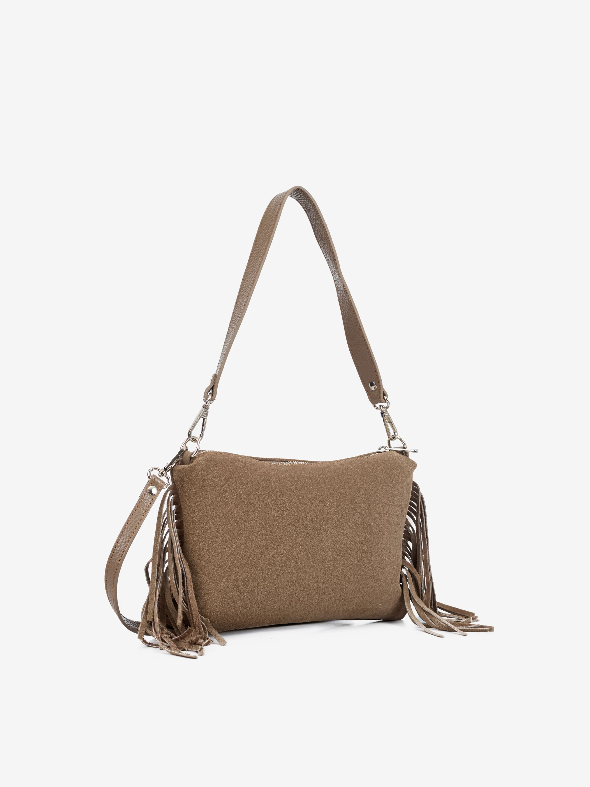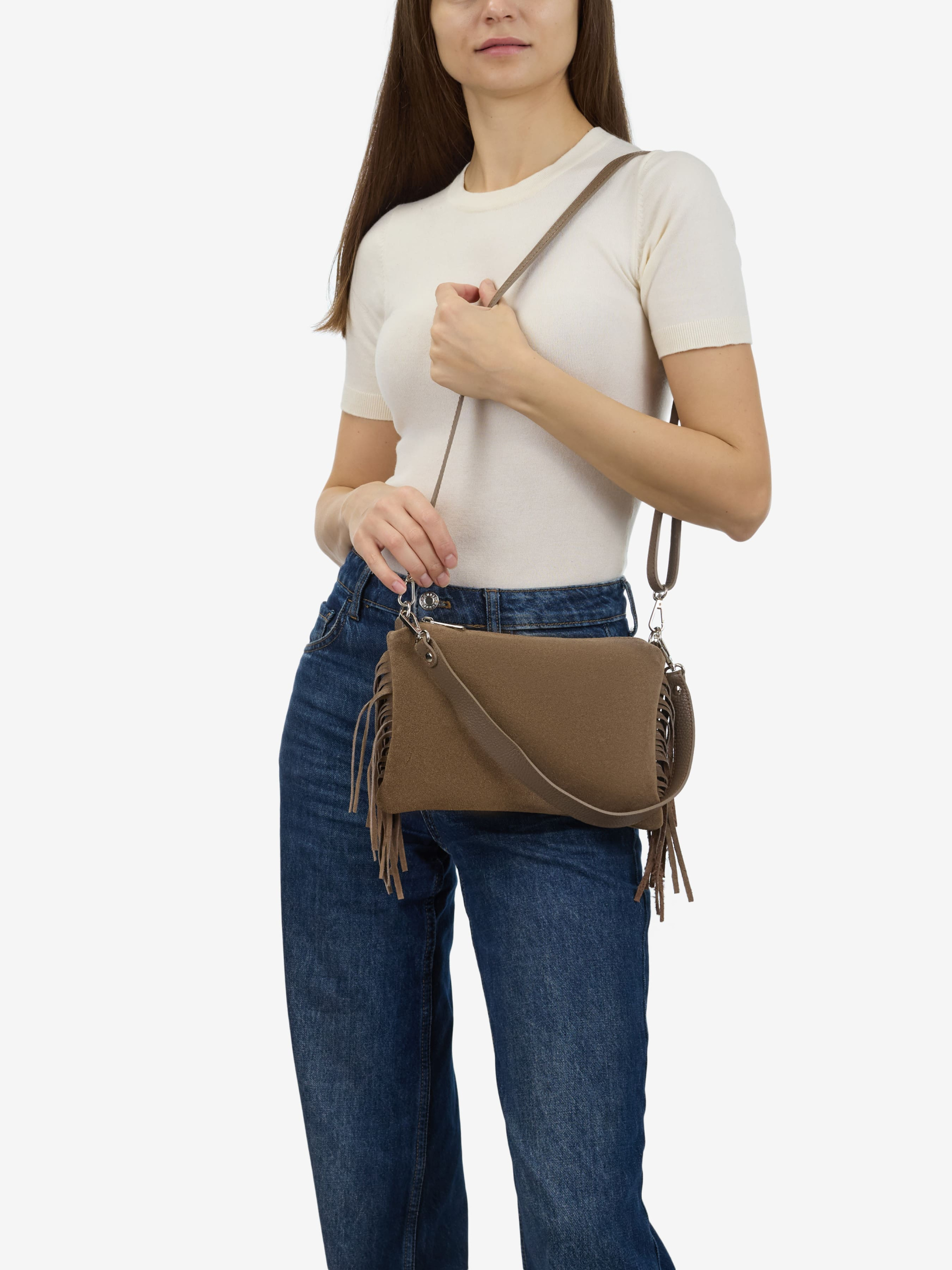 Детали: Материал: 100% натуральная замша Фурнитура серебристого цвета Размеры (Ш x В x Г) - 25 x 19 x 2 см Внутри 1 отделение и 1 карманчик на молнии Подкладка: хлопок Застежка: молния Высота ручки 23 см Ремешок замшевый, съемный, регулируется, максимальная длина 110 см