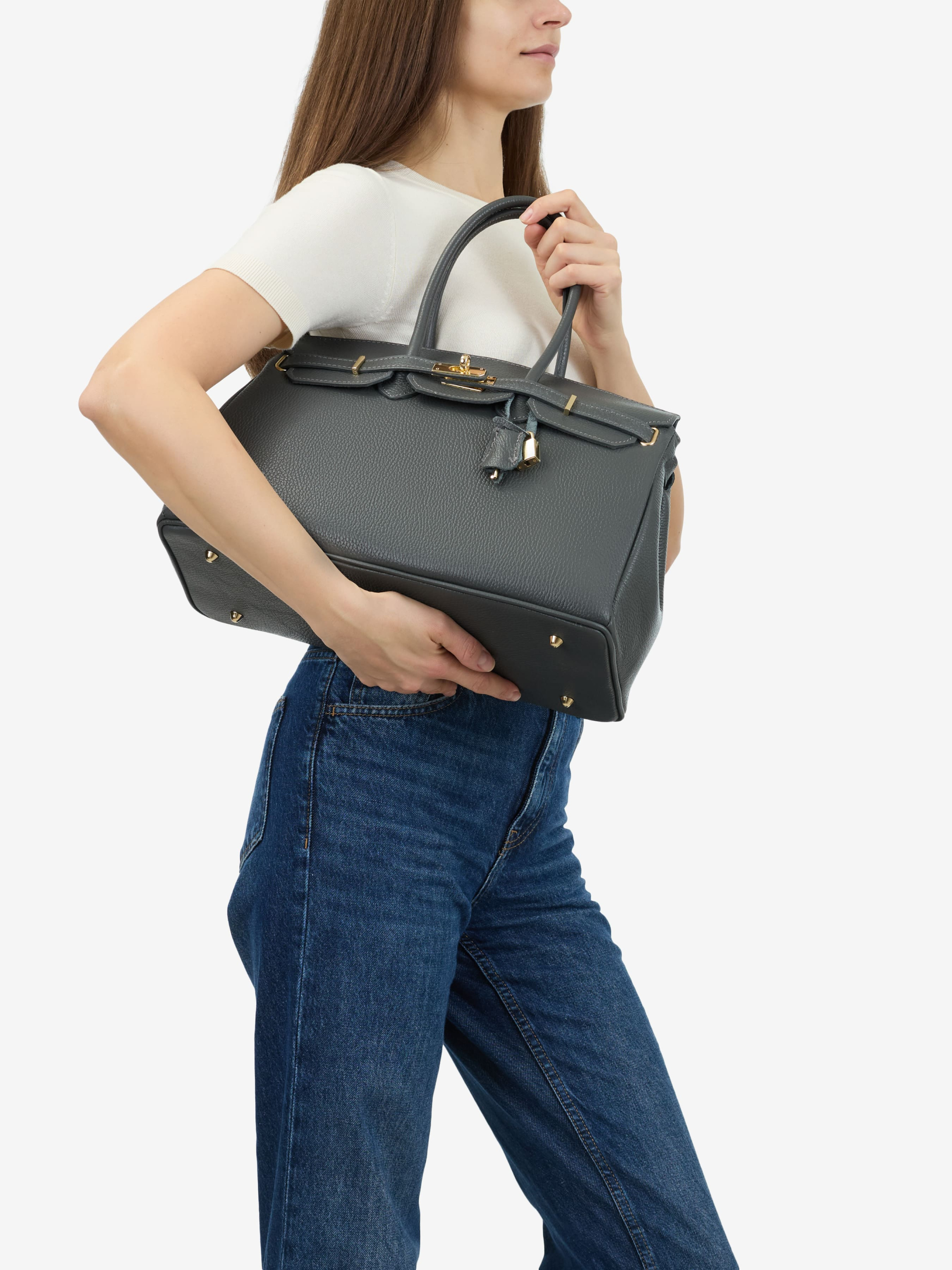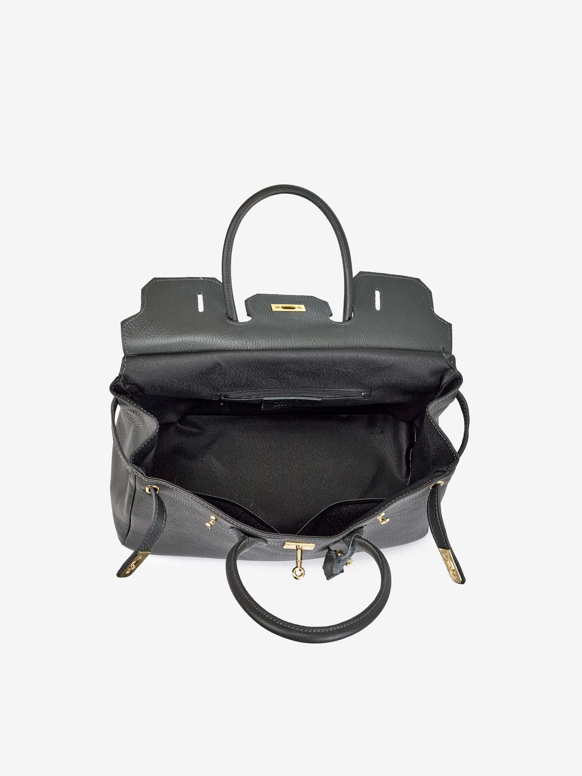 Детали: Материал: 100% натуральная кожа флотар Фурнитура золотистого цвета Размеры (Ш x В x Г) - 39 х 24 х 17 см Внутри 1 отделение , три карманчика для мелочей, один на молнии Подкладка: отсутствует Застежка: клапан на поворотном замке Высота ручек 17 см