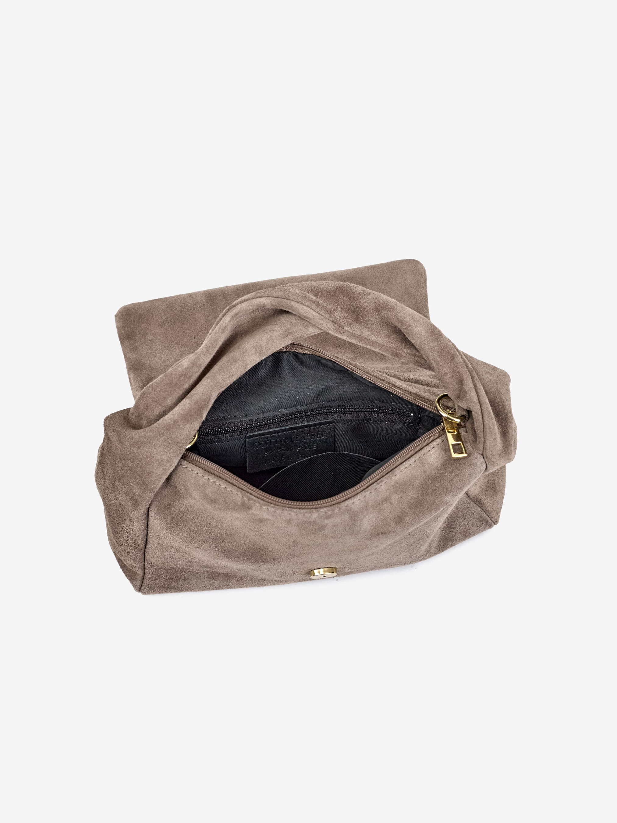 Детали: Материал: 100% натуральная замша Фурнитура золотистого цвета Размеры (Ш x В x Г) - 30 x 24 x 12 см Внутри 1 отделение и 2 карманчика, один из них на молнии Подкладка: хлопок Застежка: молния Высота ручек 14 см Ремешок замшевый, съемный, регулируется, максимальная длина 120 см