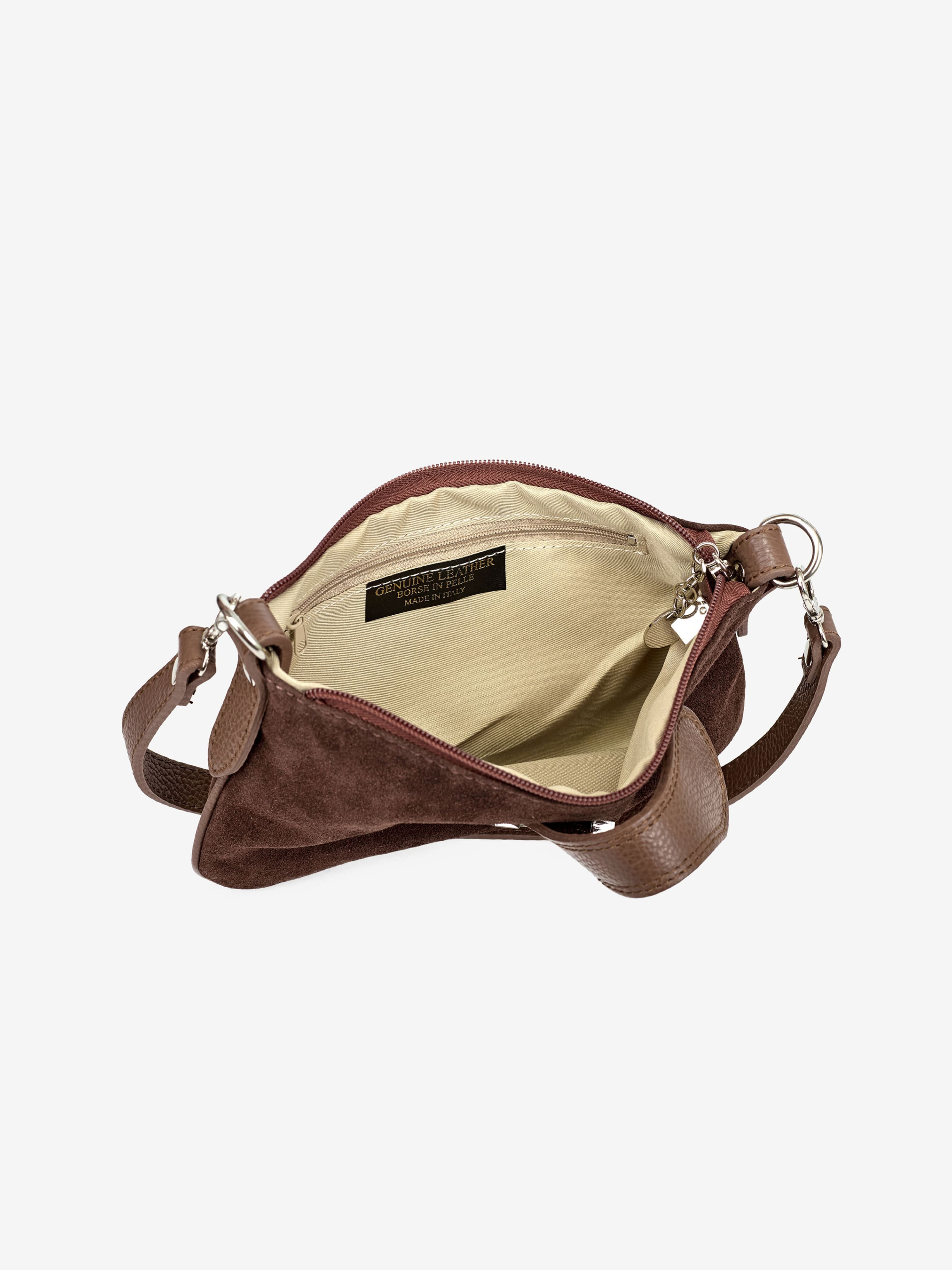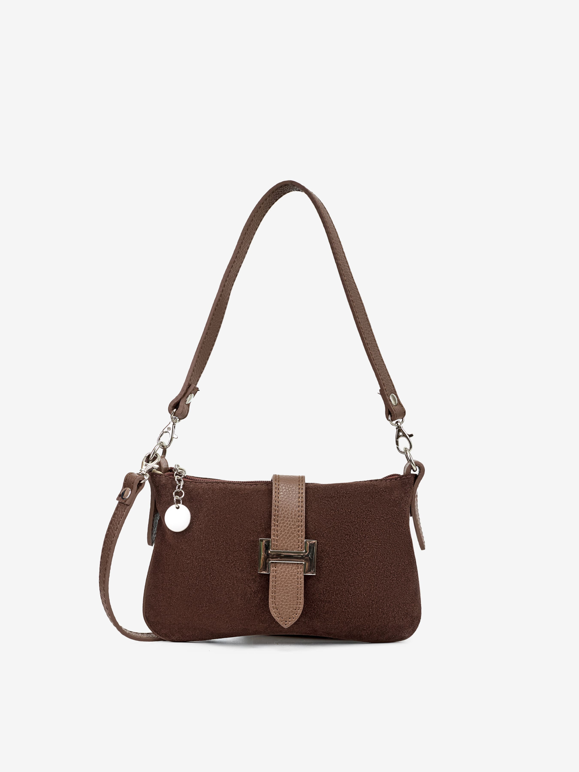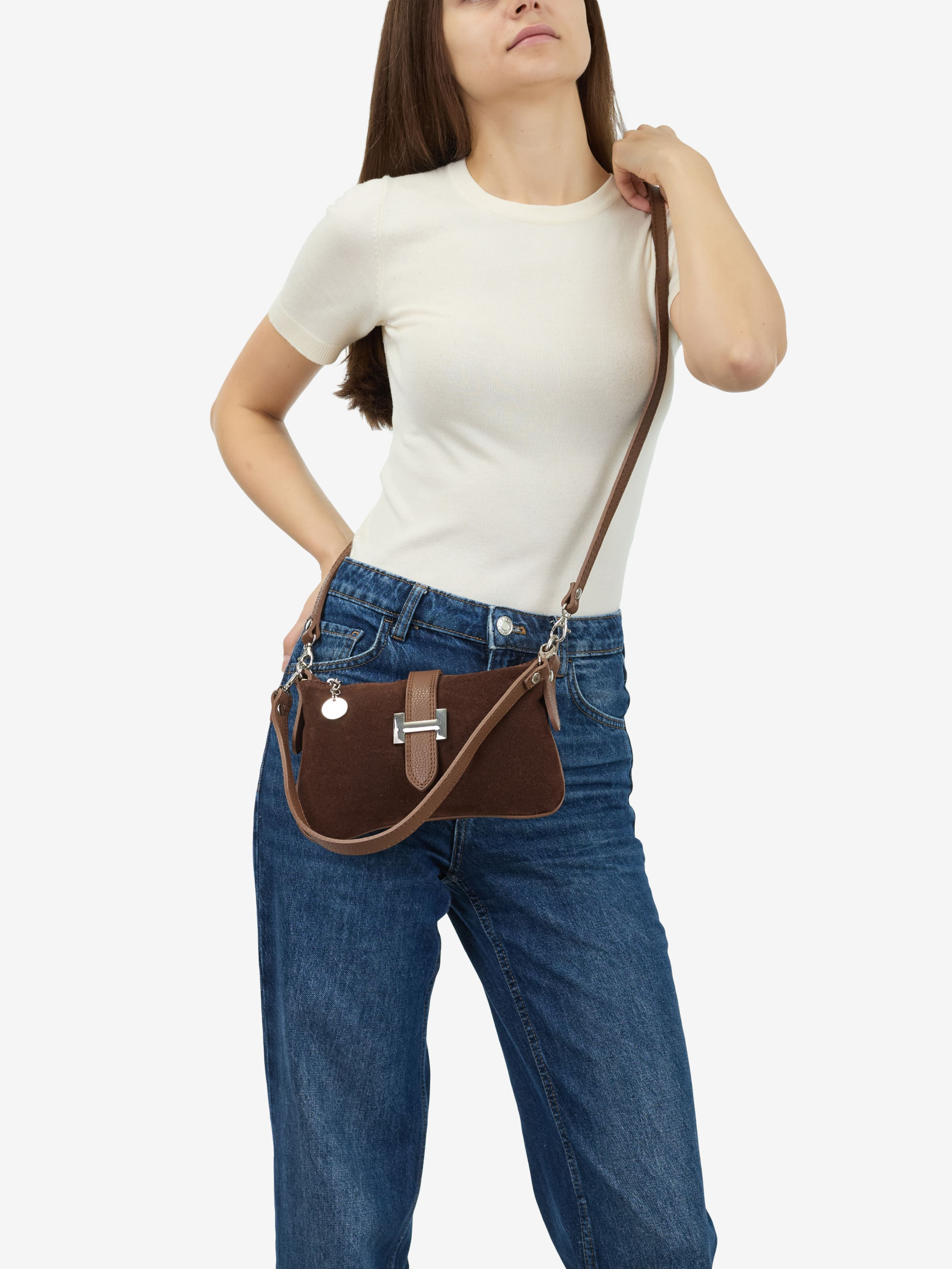 Детали: Материал: 100% натуральная замша Фурнитура серебристого цвета Размеры (Ш x В x Г) - 23 х 16 х 1 см Внутри 1 отделение, 1 карманчик на молнии для мелочей Подкладка: хлопок Застежка: молния , клапан на магните Ремешок кожаный, съемный, не регулируется, максимальная длина 115 см Высота ручки 25 см