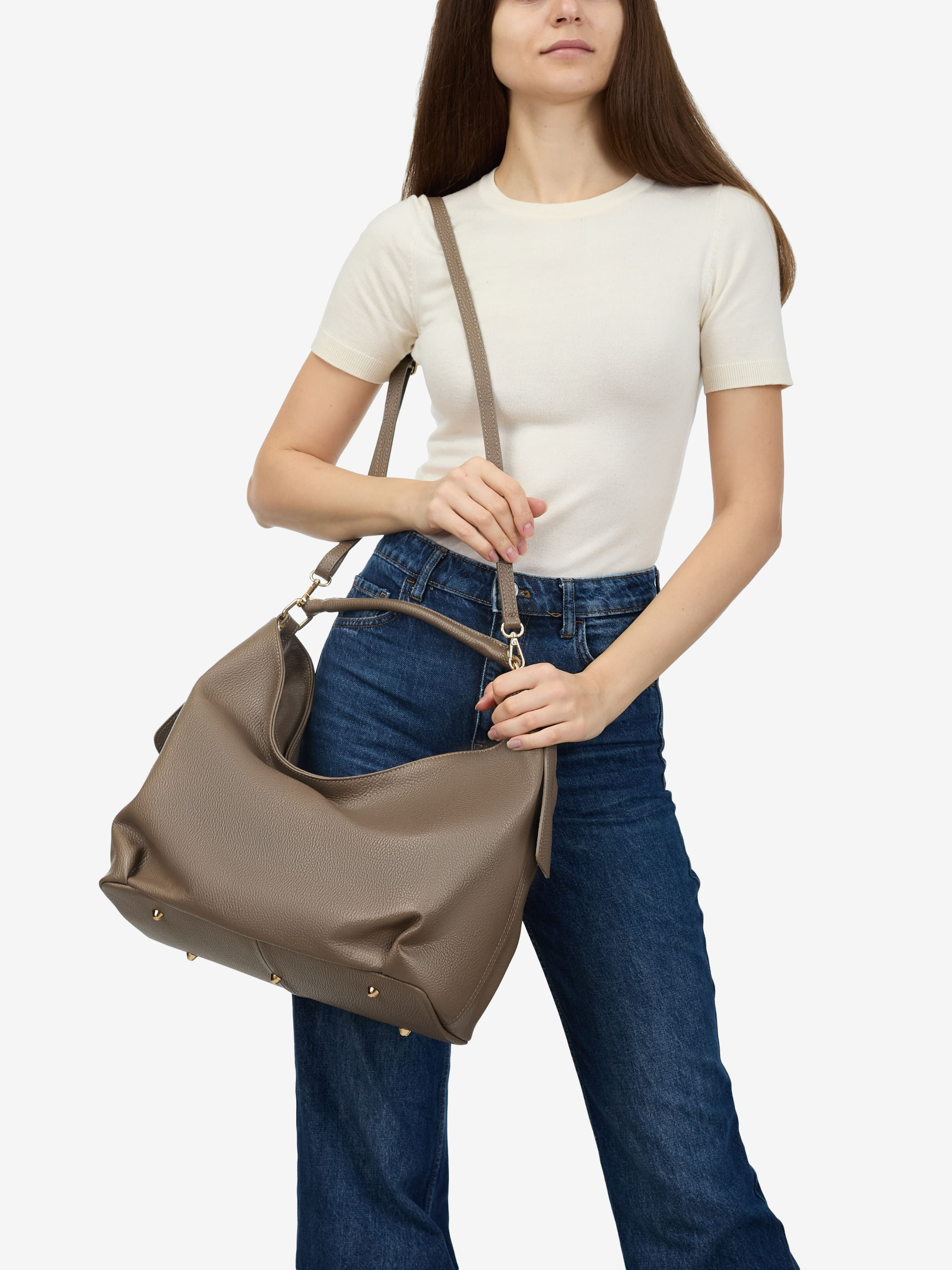 Детали: Материал: 100% натуральная кожа флотар Фурнитура золотистого цвета Размеры (Ш x В x Г) - 36 х 26 х 15 см Внутри 1 отделение, 3 карманчика для мелочей один на молнии Подкладка: хлопок Застежка: молния Ремешок кожаный, съемный, регулируется, максимальная длина 125 см Высота ручки 20 см