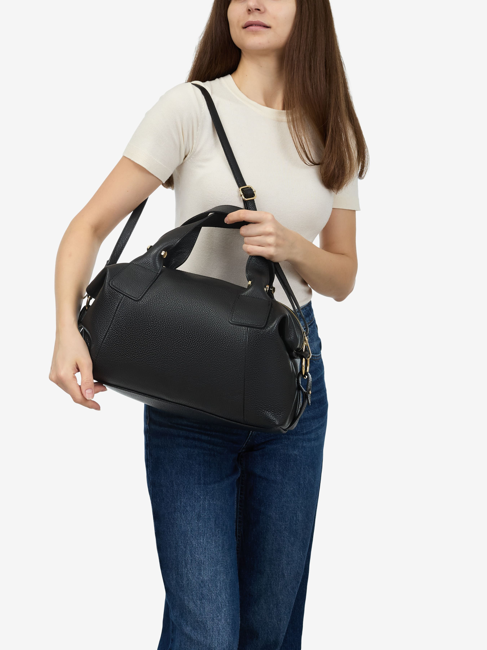 Детали: Материал: 100% натуральная кожа флотар Фурнитура золотистого цвета Размеры (Ш x В x Г) - 39 x 25 x 13 см Внутри 2 раздельных отделения разделены карманчиком на молнии, 3 карманчика для мелочей, один на молнии По бокам есть регуляторы высоты сумки Подкладка: хлопок Застежка: молния Ремешок кожаный, съемный,регулируется, максимальная длина 120 см Высота ручек 15 см