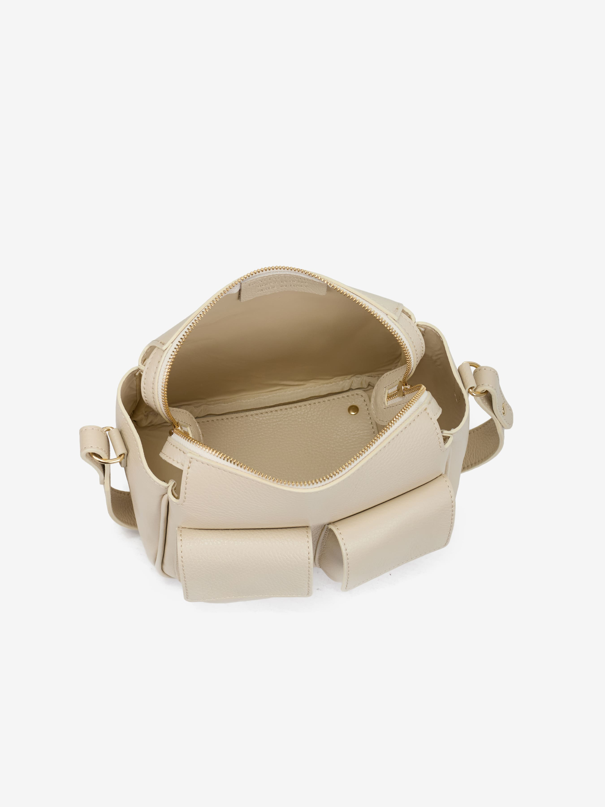 Детали: Материал: 100% натуральная кожа флотар Фурнитура золотистого цвета Размеры (Ш x В x Г) - 23 x 16 x 14 см Внутри 1 отделение, спереди 2 карманчика с клапаном на магните Застежка: молния Подкладка: нет Высота ручек 21 см Ремешок кожаный, регулируется, 125 см