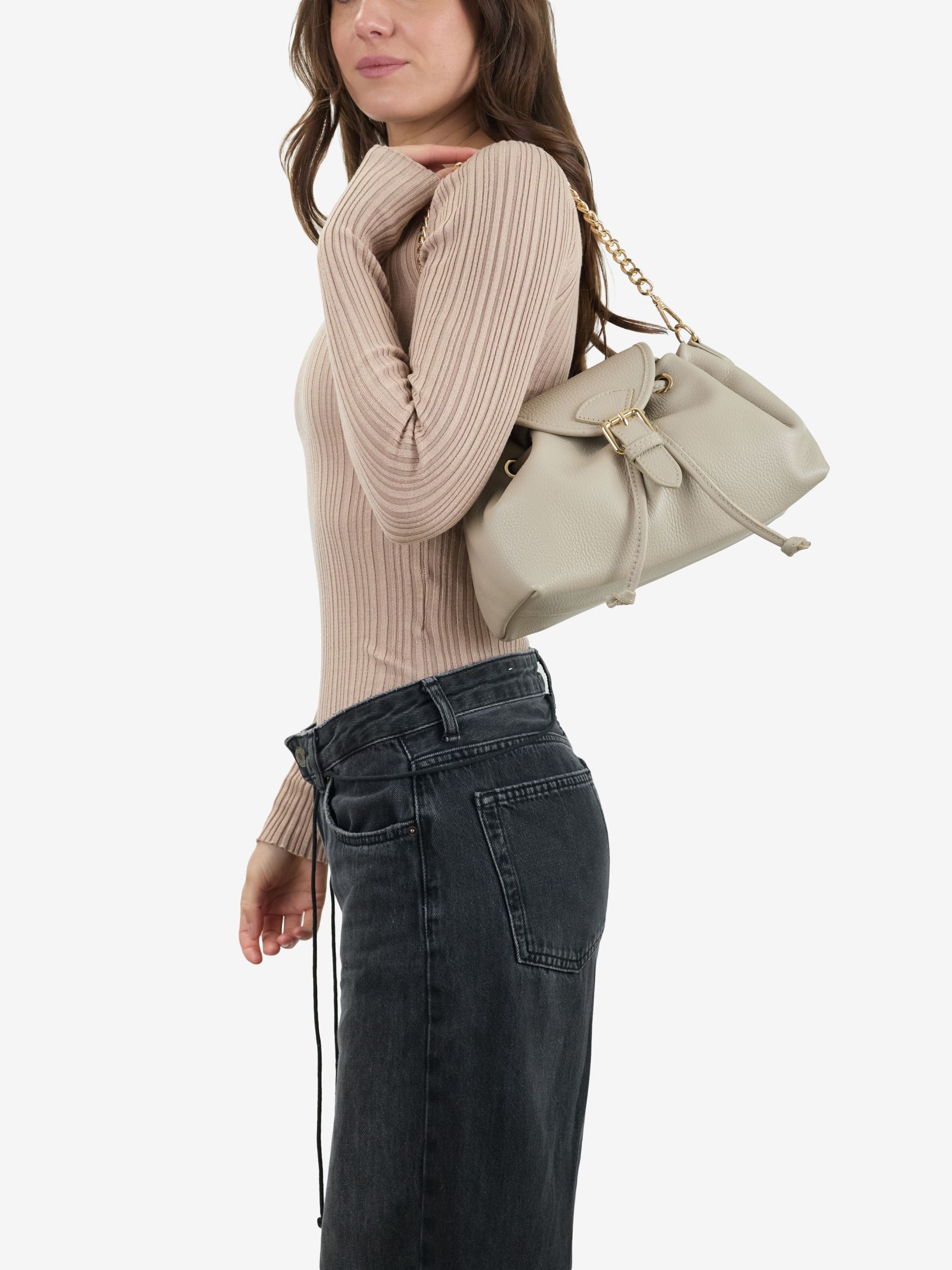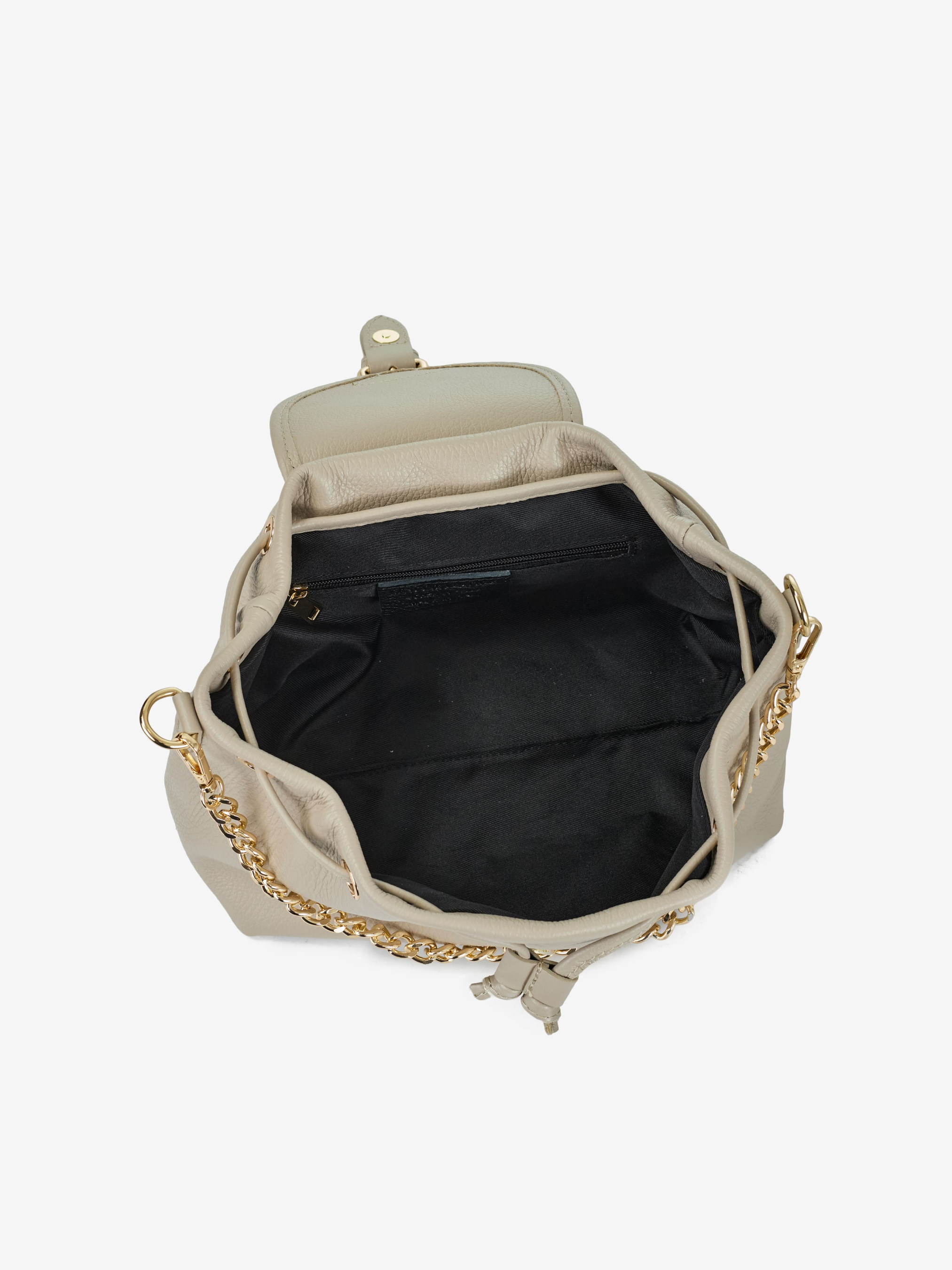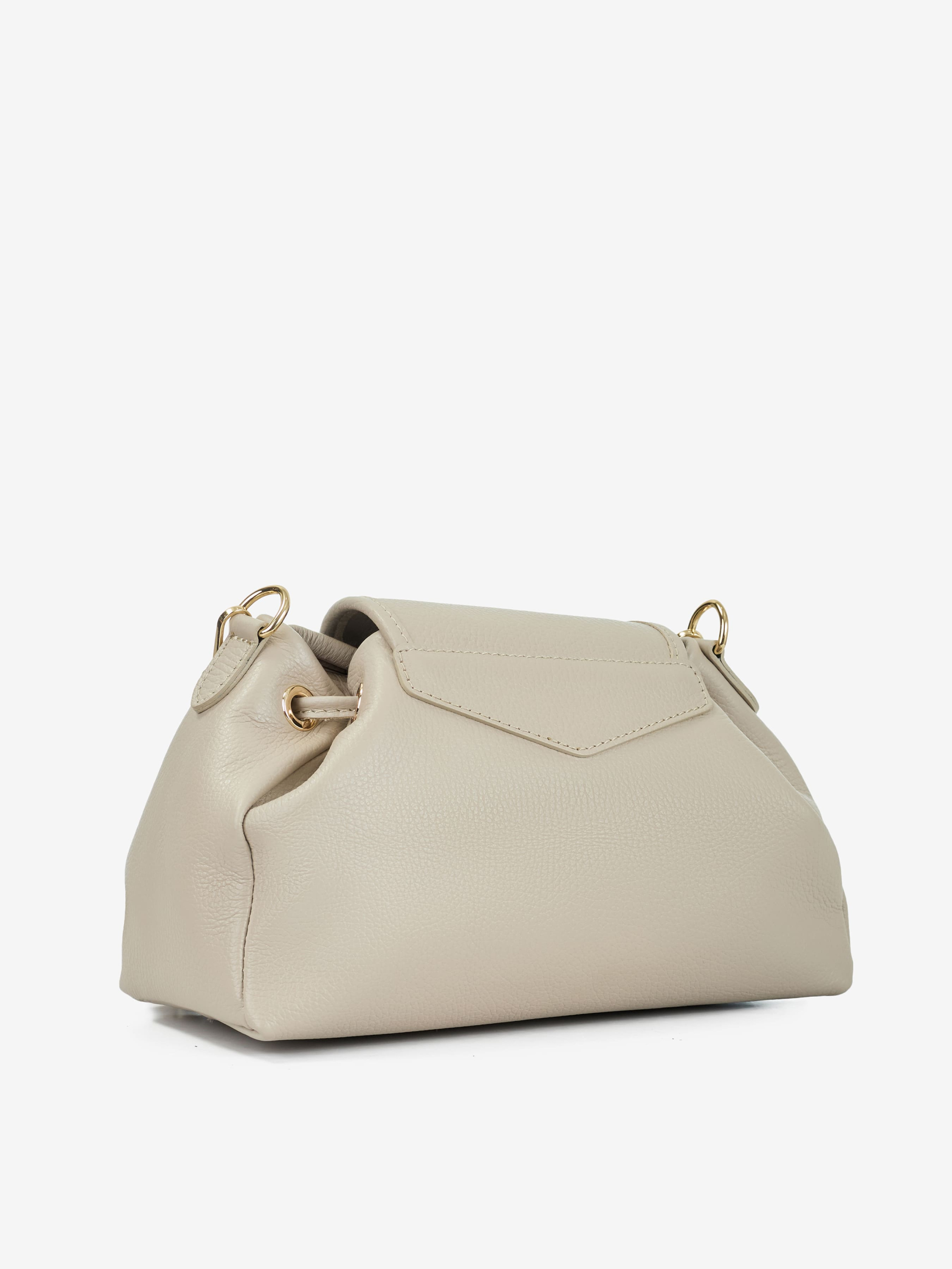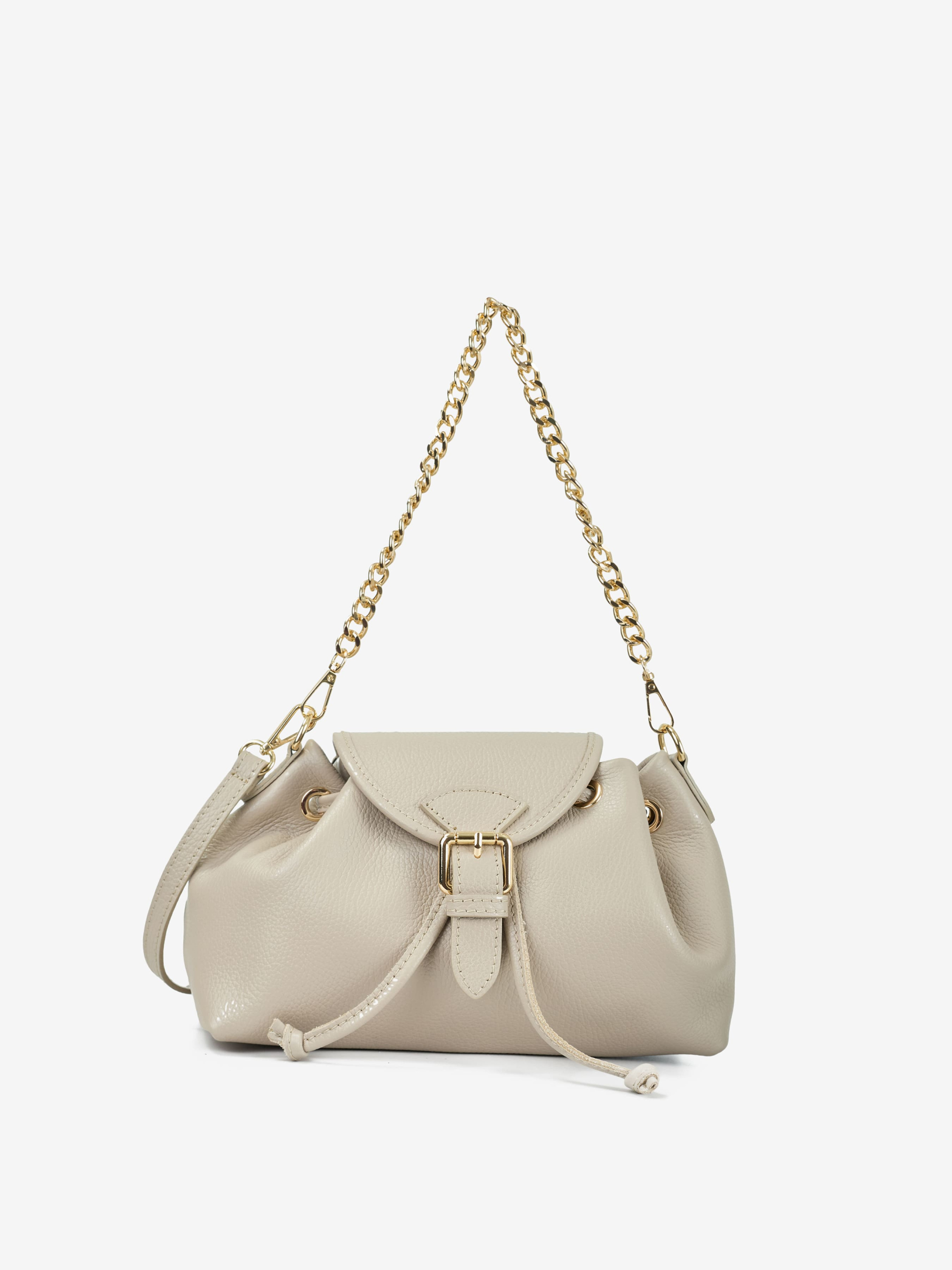 Детали: Материал: 100% натуральная кожа флотар Фурнитура золотистого цвета Размеры (Ш x В x Г) - 26 x 16 x 12 см Внутри 1 отделение, 1 карманчик для мелочей на молнии Подкладка: хлопок Застежка: затяжки, клапан на магните Высота ручек 22 см Ремешок кожаный, регулируется, длина 125 см