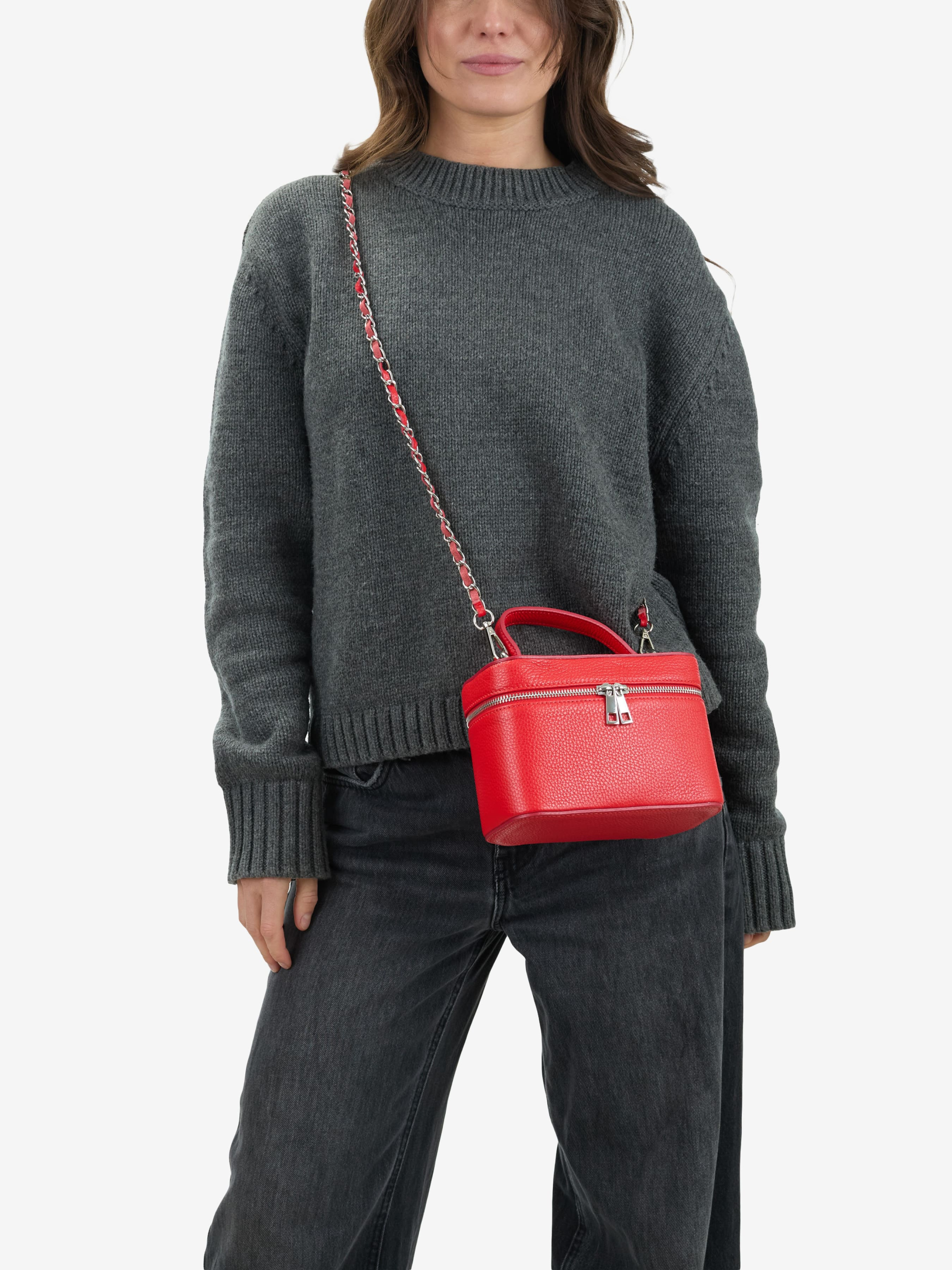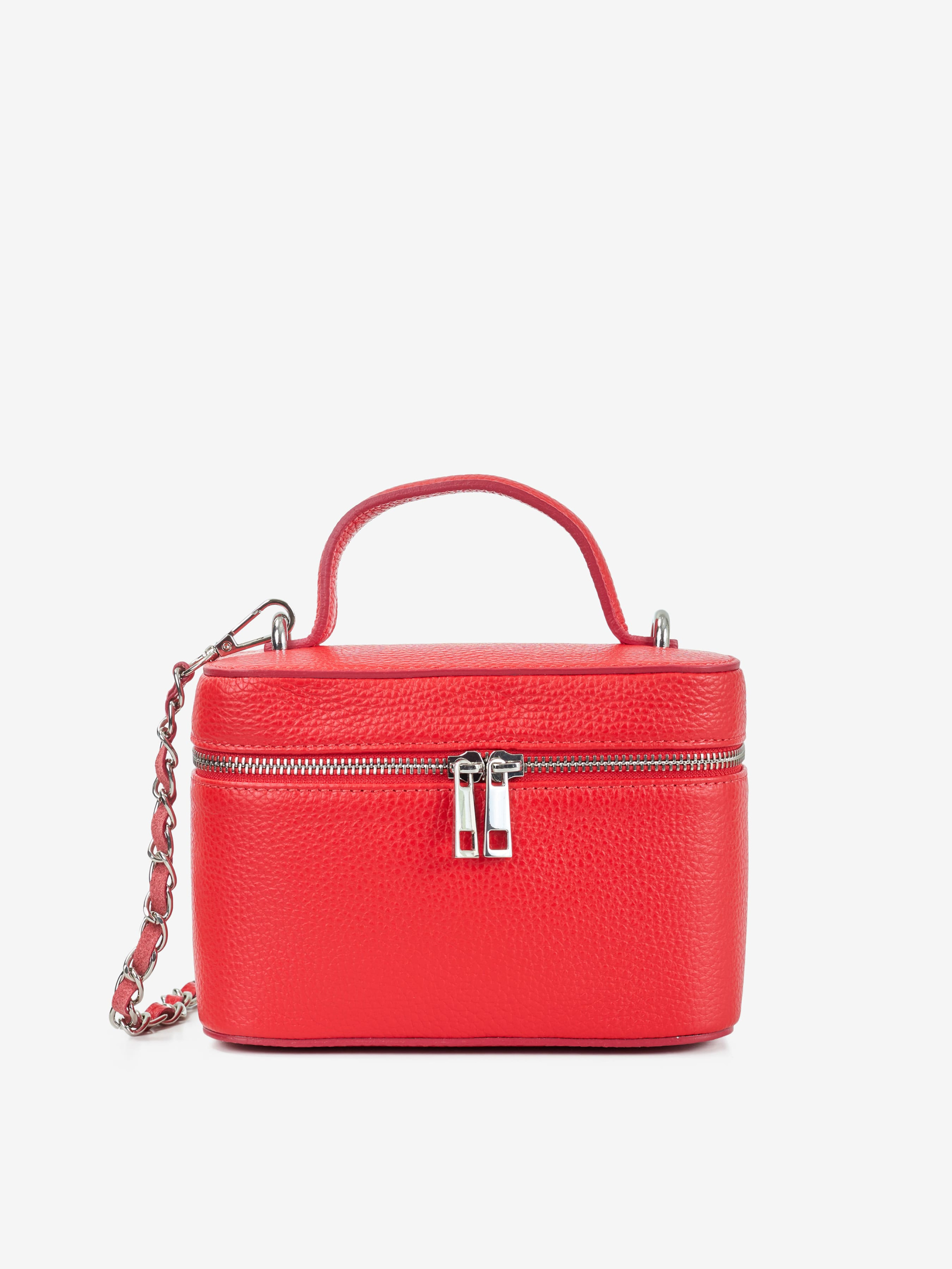 Детали: Материал: 100% натуральная кожа флотар Фурнитура серебристого цвета Размеры (Ш x В x Г) - 19 x 13 x 9 см Внутри 1 отделение, 1 карманчик для мелочей Застежка: молния Подкладка: нет Высота ручек 6 см Ремешок кожа+цепочка, не регулируется, 110 см