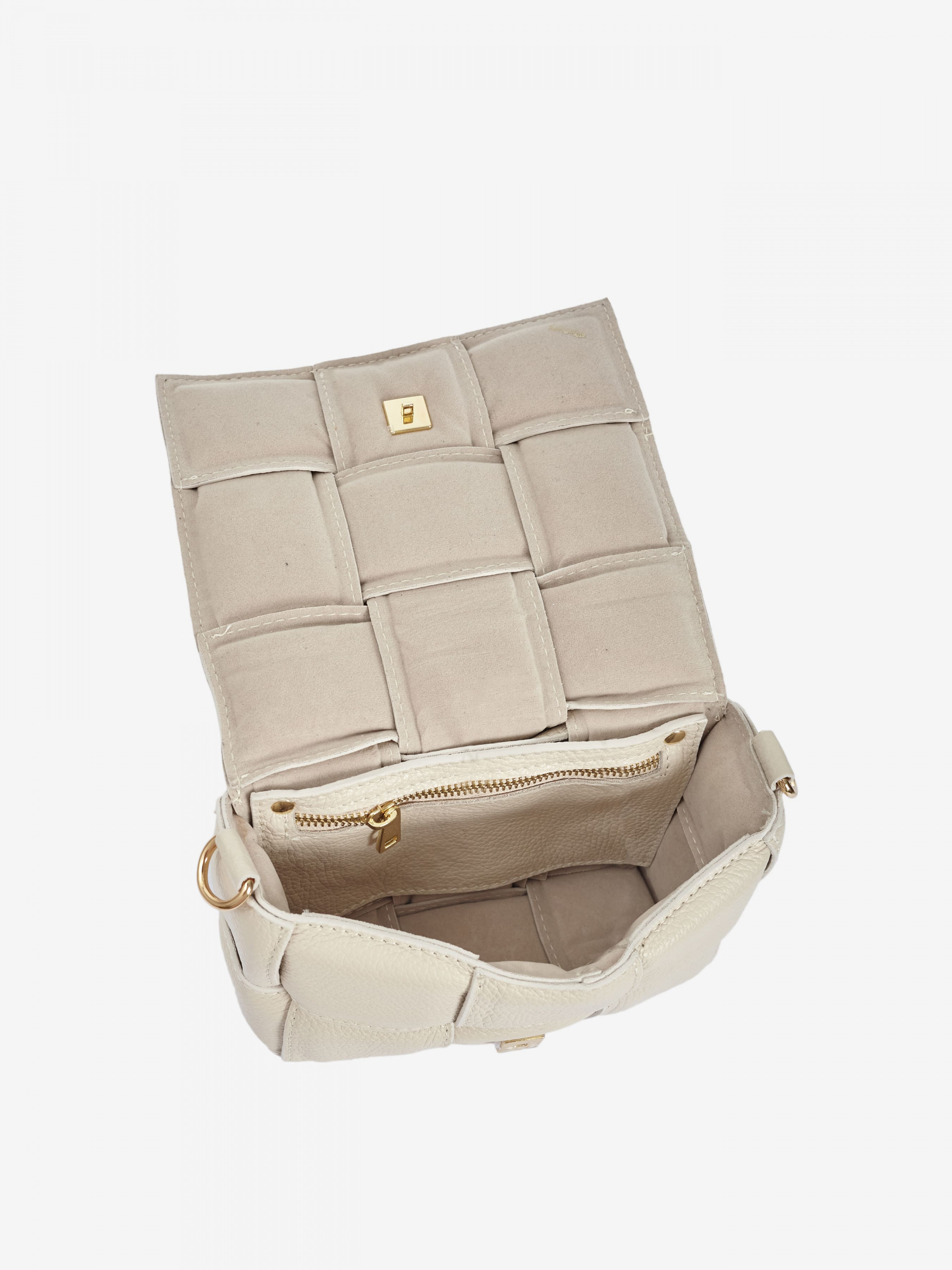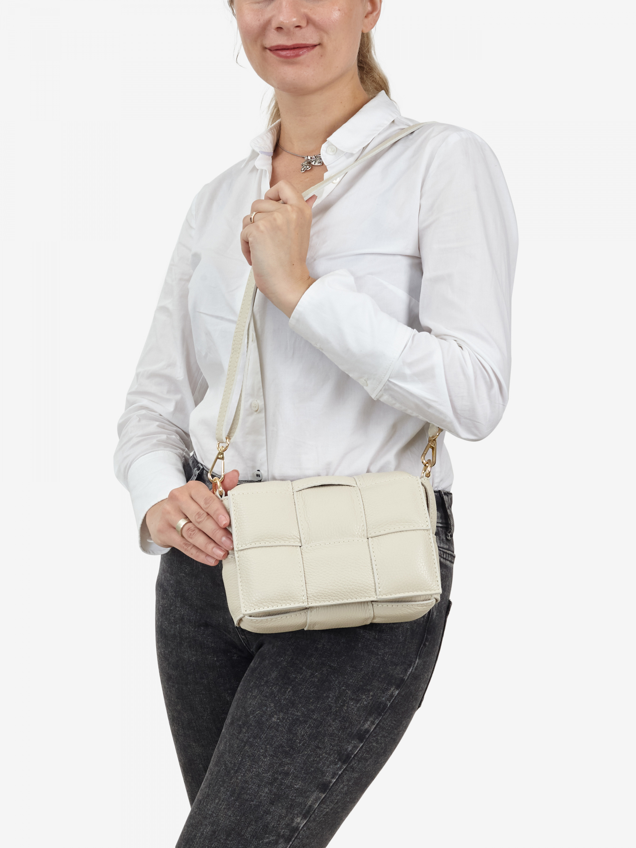 Детали: Материал: 100% натуральная кожа Кожа наппа стеганая фурнитура золотистого цвета Размеры (Ш x В x Г) - 22 x 14 x 6 см Внутри: 1 отделение и съемный карманчик для мелочей на молнии Подкладка: замша Ремешок съемный на карабинах регулируется, максимальная длина 110 см Застежка: клапан на портфельном замке