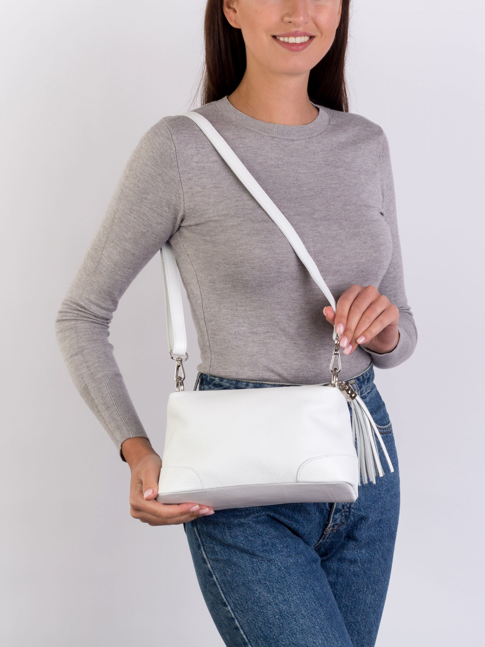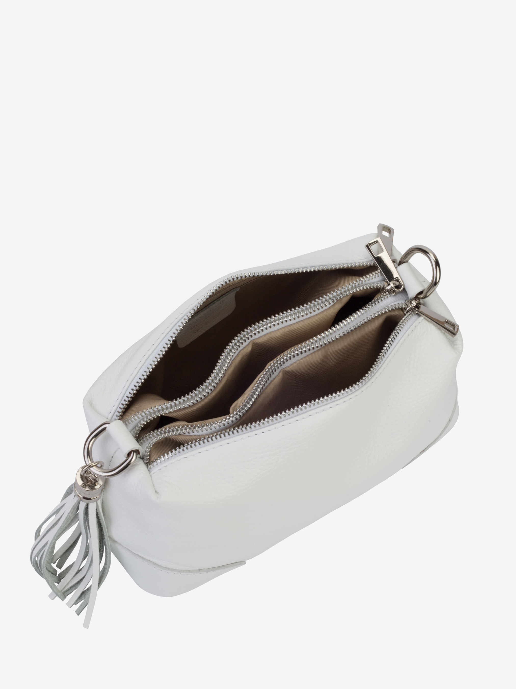 Детали: Материал: 100% натуральная кожа Кожа имеет фактуру флотар Фурнитура серебристого цвета Размеры (Ш x В x Г) - 25 х 16 х10 см Внутри внутри 3 раздельных отделения на молнии, в одном из отделений карманчик для мелочей на молнии Подкладка: хлопок Застежка: молния В комплекте ремешок для ношения на плече (съемный на карабинах, регулируется, максимальная длина 110 см) Декорирована кожаной кисточкой