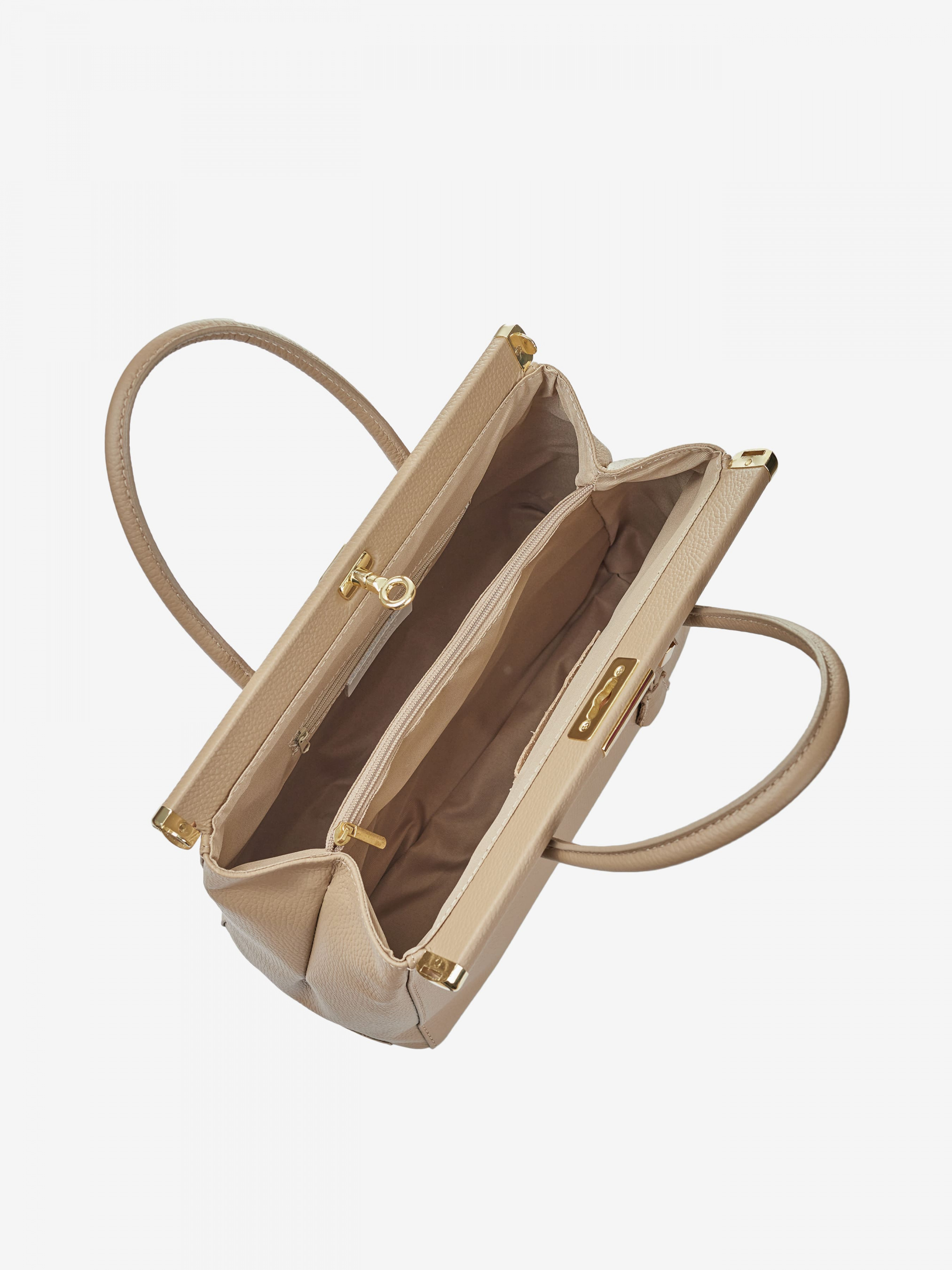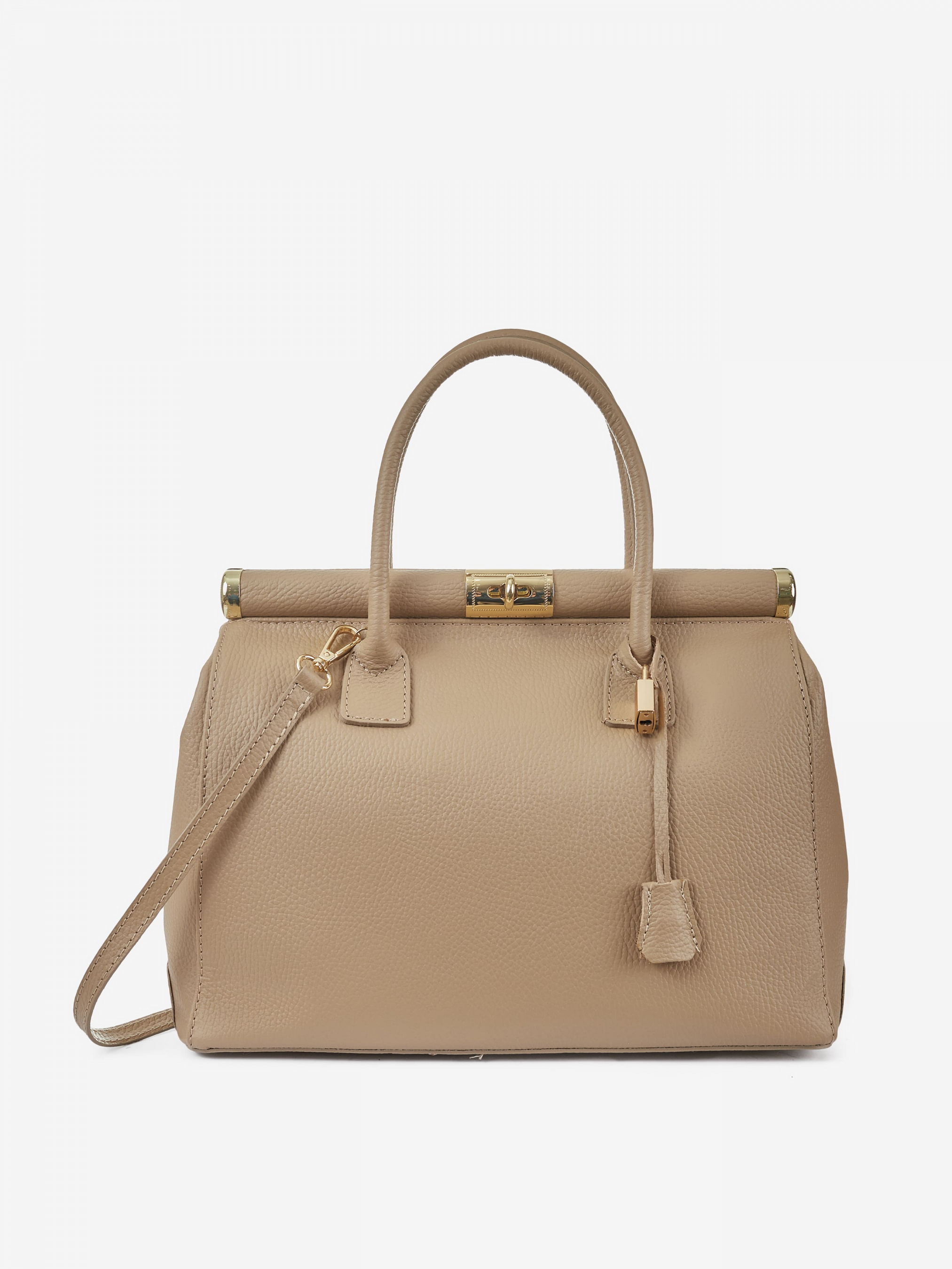 Детали: Материал: 100% натуральная кожа Кожа имеет фактуру флотар Фурнитура золотистого цвета Размеры (Ш x В x Г) - 35 x 24 x 15 см Внутри 2 отделения разделены карманом на молнии и карманчик для мелочей Подкладка: 100% хлопок Застежка: поворотный замок Высота ручек 10 см В комплекте ремешок для ношения на плече (съемный на карабинах не регулируется, максимальная длина 100 см)