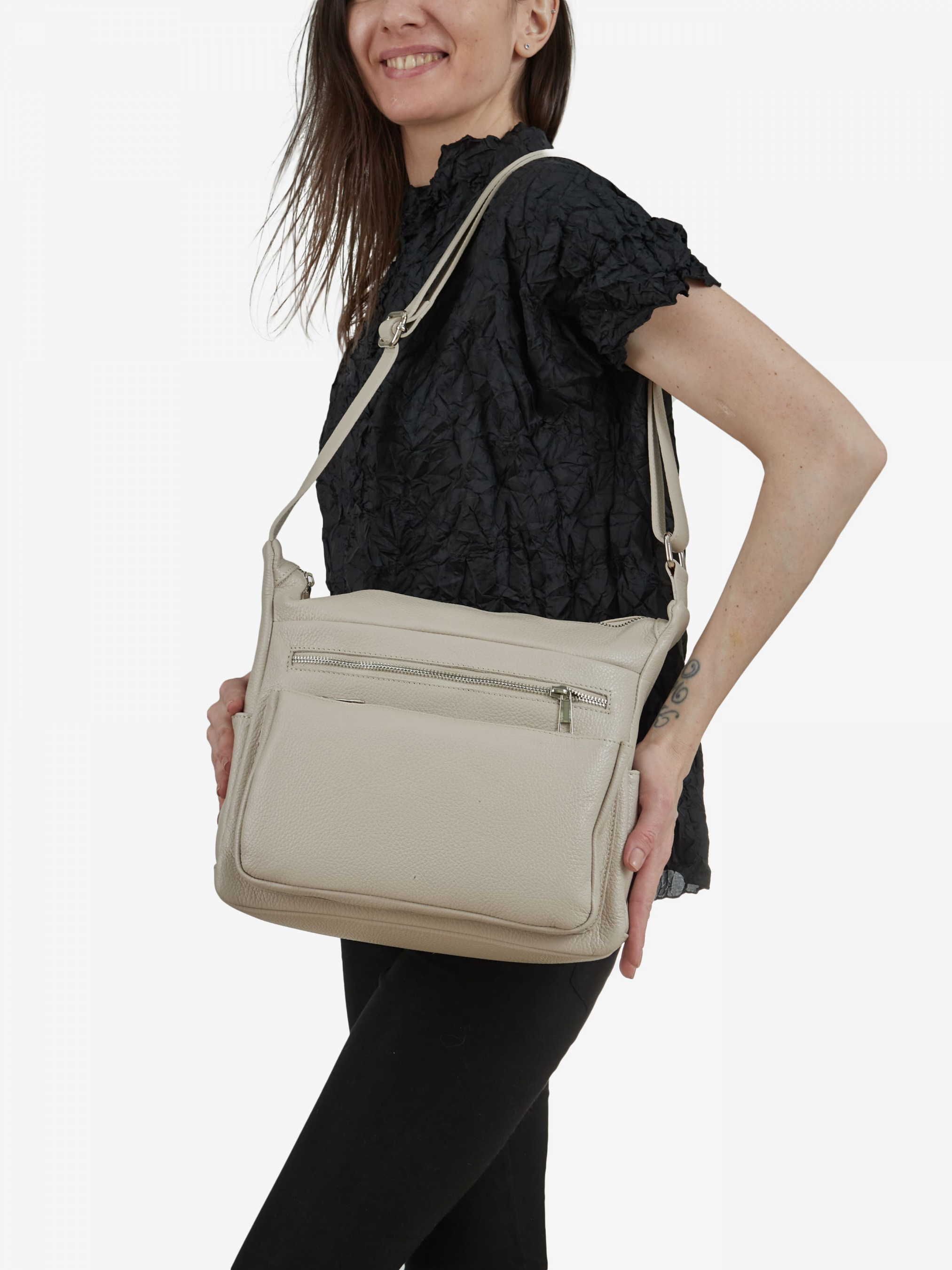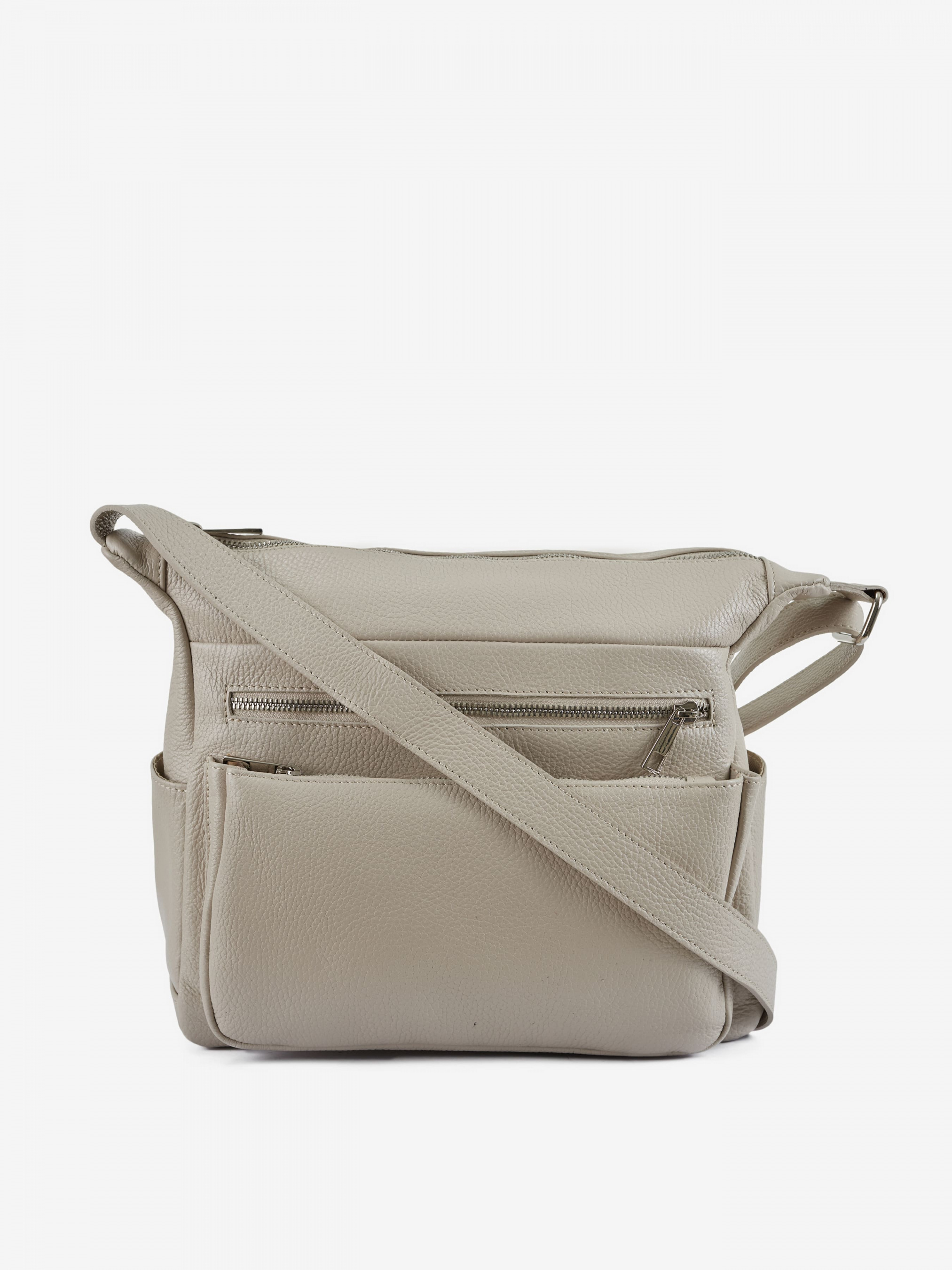 Детали: Материал: 100% натуральная кожа Кожа имеет фактуру флотар Фурнитура серебристого цвета Размеры (Ш x В x Г) - 28 x 25 x 11 см Внутри 1 отделение на молнии и 3 карманчика для мелочей, один из них на молнии. Спереди 2 горизонтальных карманчика на молнии. Сзади горизонтальный карман на молнии. По бокам 2 карманчика без застежки Подкладка: хлопок Застежка: молния Ремешок кожаный, регулируется, несъемный, максимальная высота 60 см