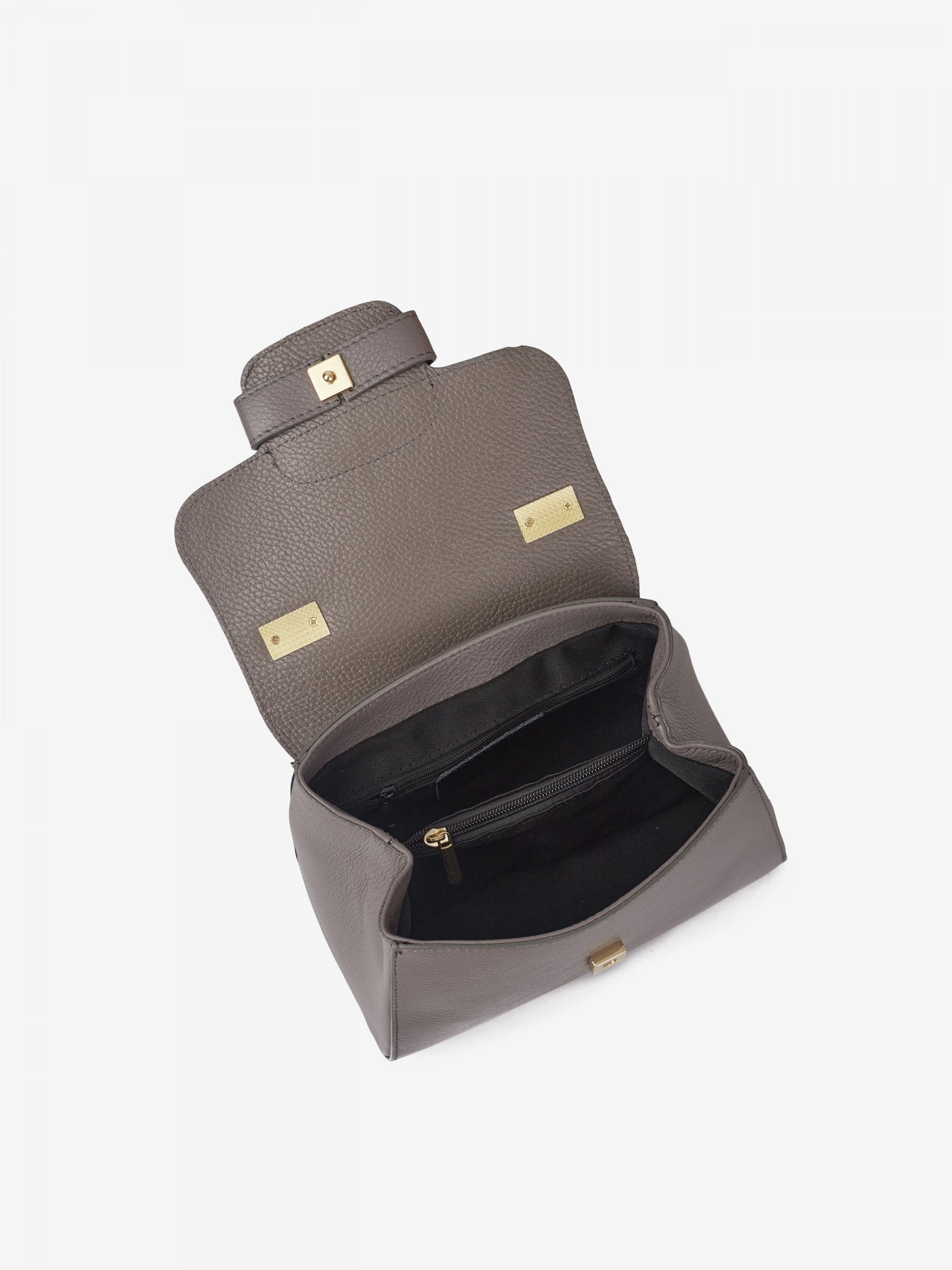 Детали: Материал: 100% натуральная кожа Кожа имеет фактуру флотар Фурнитура золотистогоо цвета Размеры (Ш x В x Г) - 13 х 16 х 9 см Внутри 2 отделения разделены карманом на молнии и карманчик для мелочей на молнии Подкладка: 100% хлопок Застежка: молния, клапан на механическом замке Ремешок кожаный, регулируется, съемный, максимальная длина 110 см Высота ручки 12 см