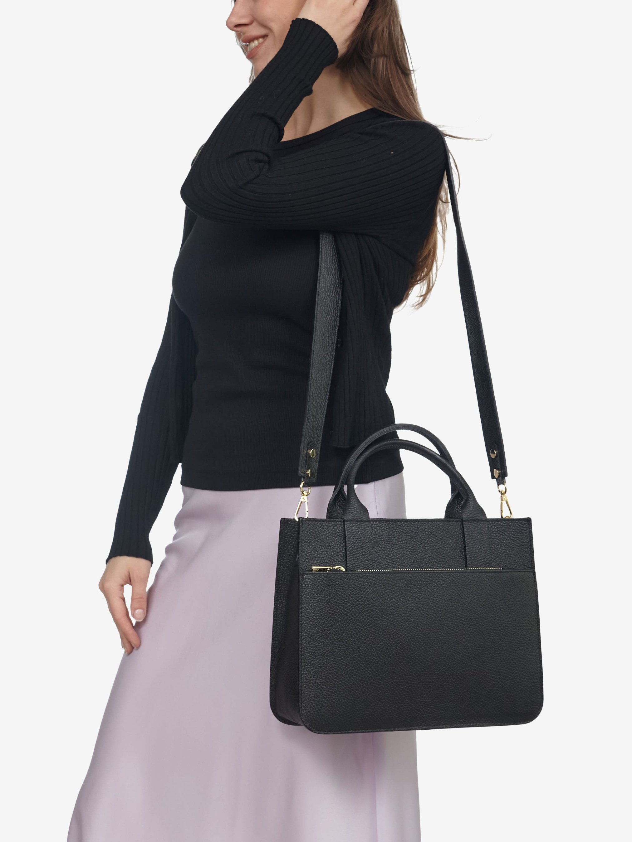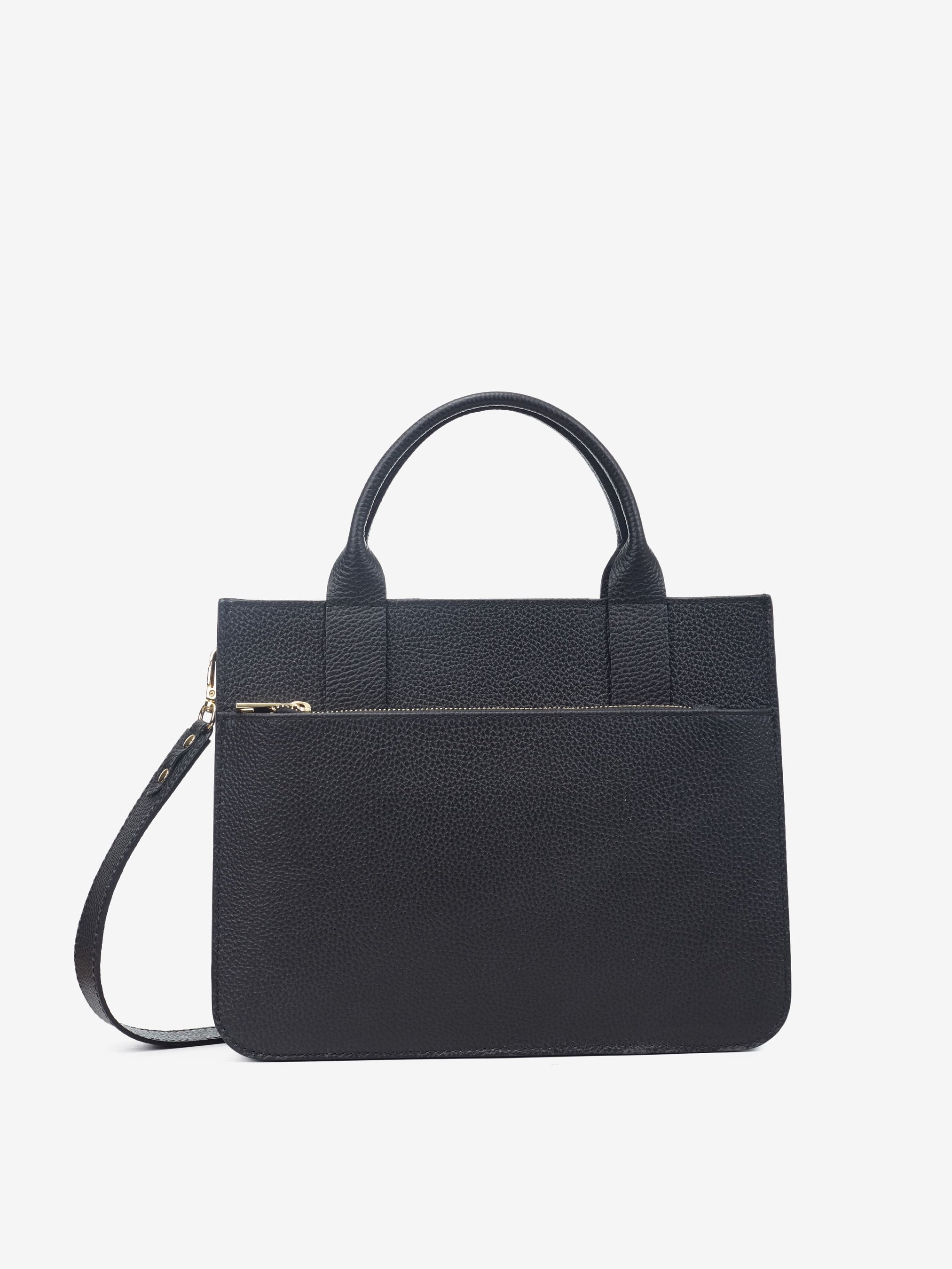 Детали: Материал: 100% натуральная кожа Кожа флотар Фурнитура золотистого цвета Размеры (Ш x В x Г) - 31 х 25 х 11 см Внутри 1 отделение и 1 карманчик для мелочей на молнии Спереди большой карман на всю ширину сумки Подкладка: 100% хлопок Застежка: молния Ремешок широкий кожаный, не регулируется, съемный, максимальная длина 95 см Высота ручек 10 см