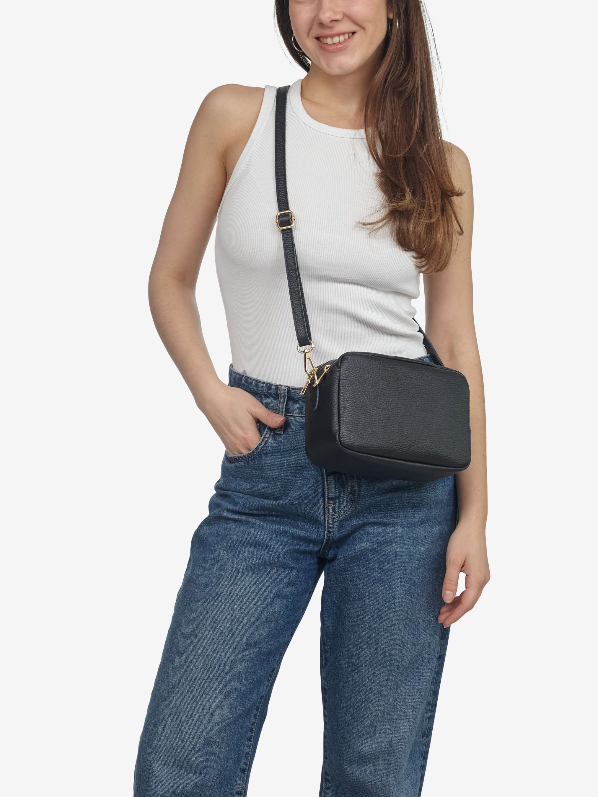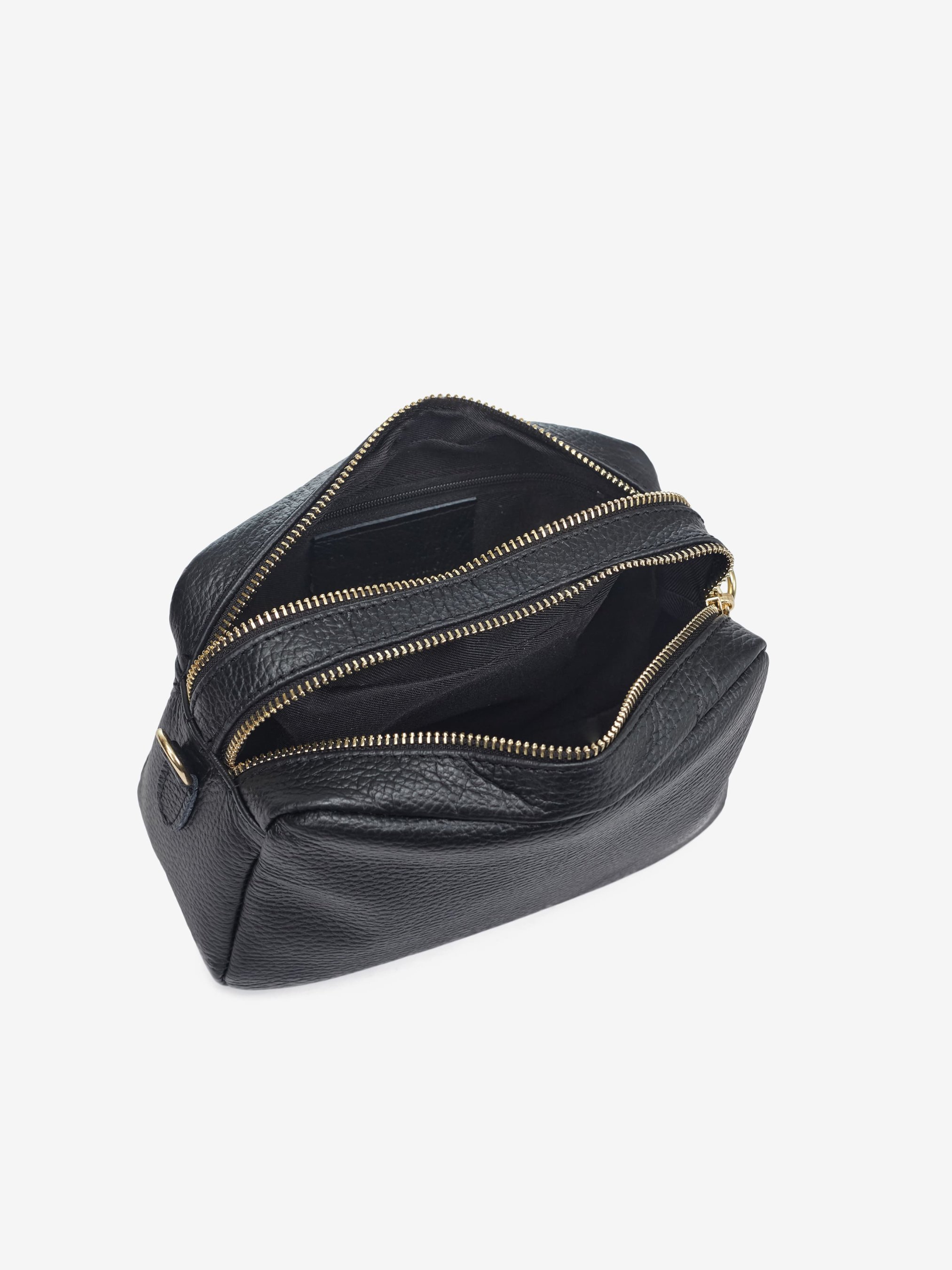Детали: Материал: 100% натуральная кожа флотар Фурнитура золотистого цвета Размеры (Ш x В x Г) - 20 x 14 x 8 см Внутри 2 раздельных отделения на молнии и 1 карманчик для мелочей на молнии Подкладка: 100% хлопок Застежка: молния Ремешок кожаный, регулируется, съемный, максимальная длина 125 см
