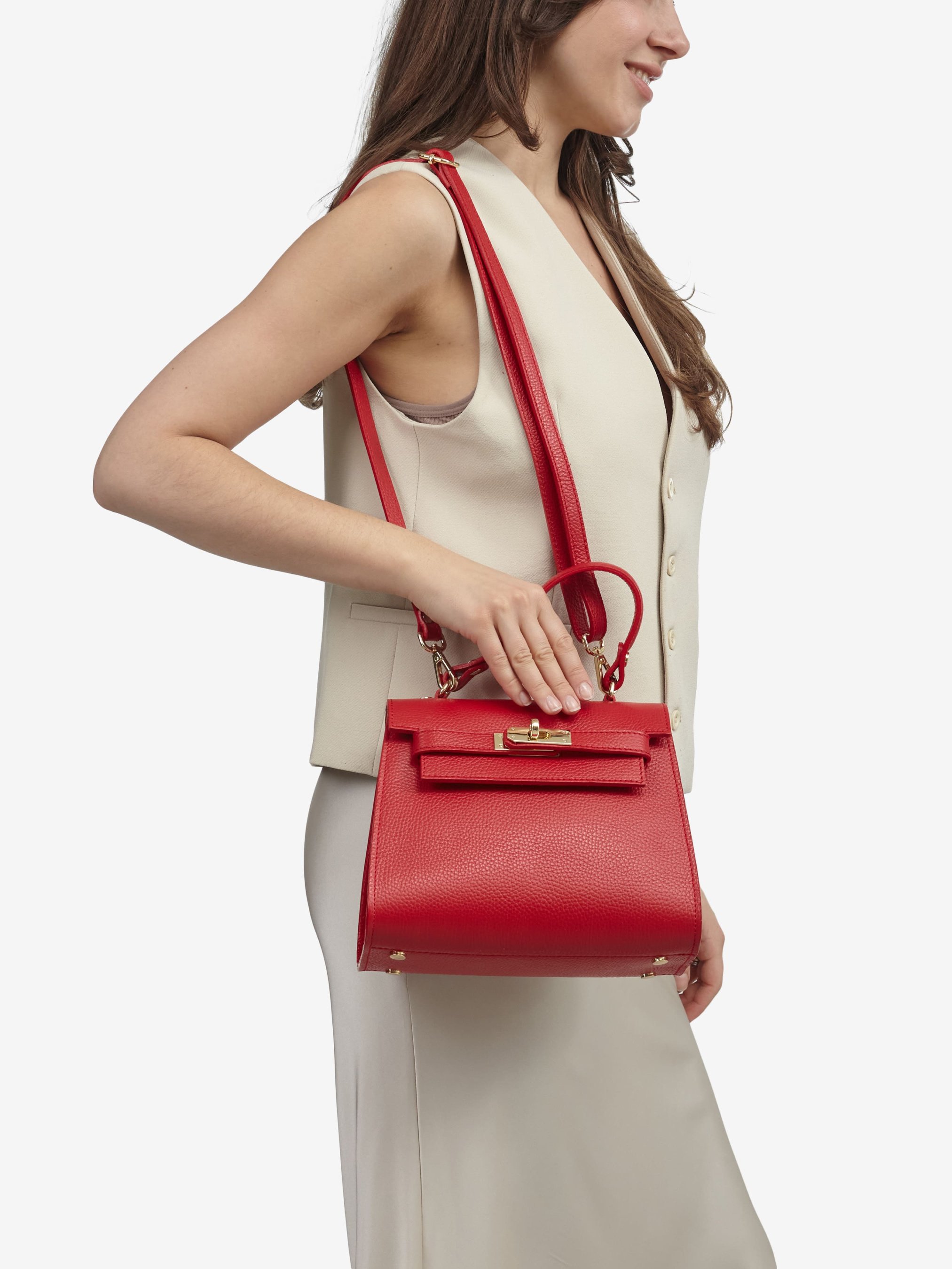 Детали: Материал: 100% натуральная кожа Кожа имеет фактуру флотар Фурнитура золотистого цвета Размеры (Ш x В x Г) - 22 x 18 x 12 см Внутри 1 отделение и карманчик без застежки Подкладка: отсутствует Застежка: клапан на поворотном замке Ремешок кожаный, регулируется, съемный, максимальная длина 120 см. Высота ручки 12 см