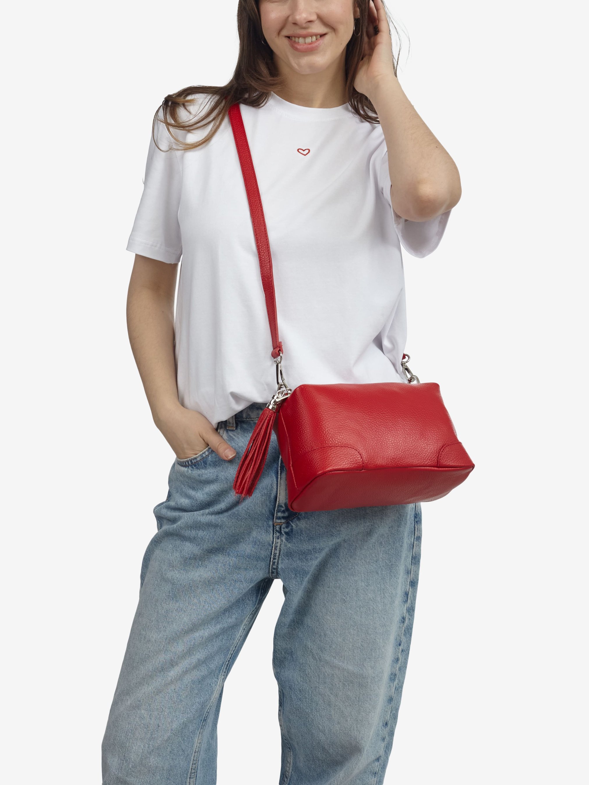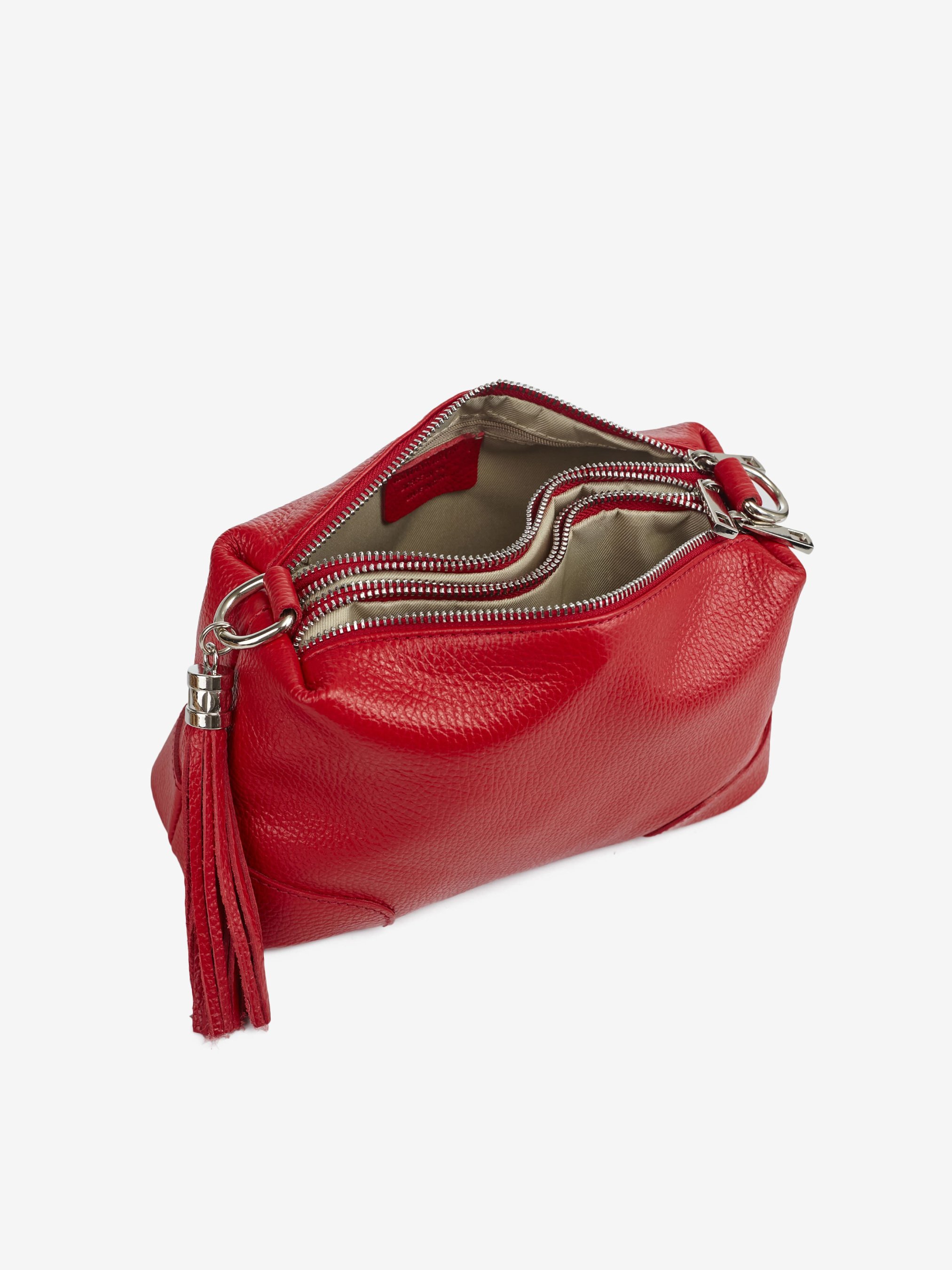 Детали: Материал: 100% натуральная кожа Кожа имеет фактуру флотар Фурнитура серебристого цвета Размеры (Ш x В x Г) - 25 х 16 х10 см Внутри внутри 3 раздельных отделения на молнии, в одном из отделений карманчик для мелочей на молнии Подкладка: хлопок Застежка: молния В комплекте ремешок для ношения на плече (съемный на карабинах, регулируется, максимальная длина 110 см) Декорирована кожаной кисточкой