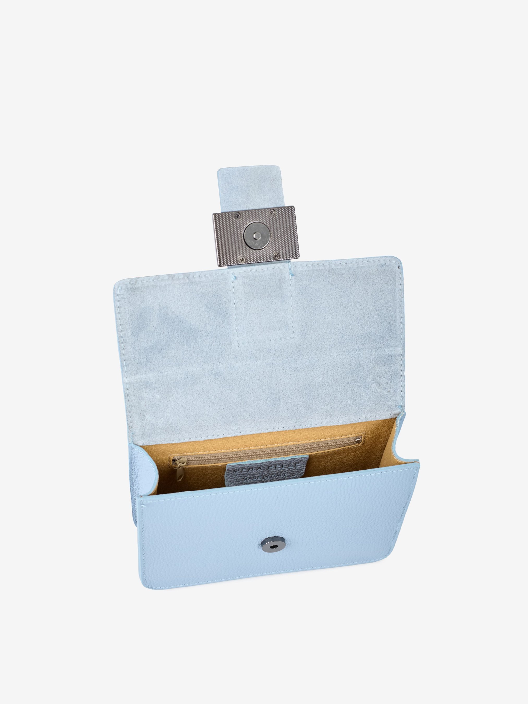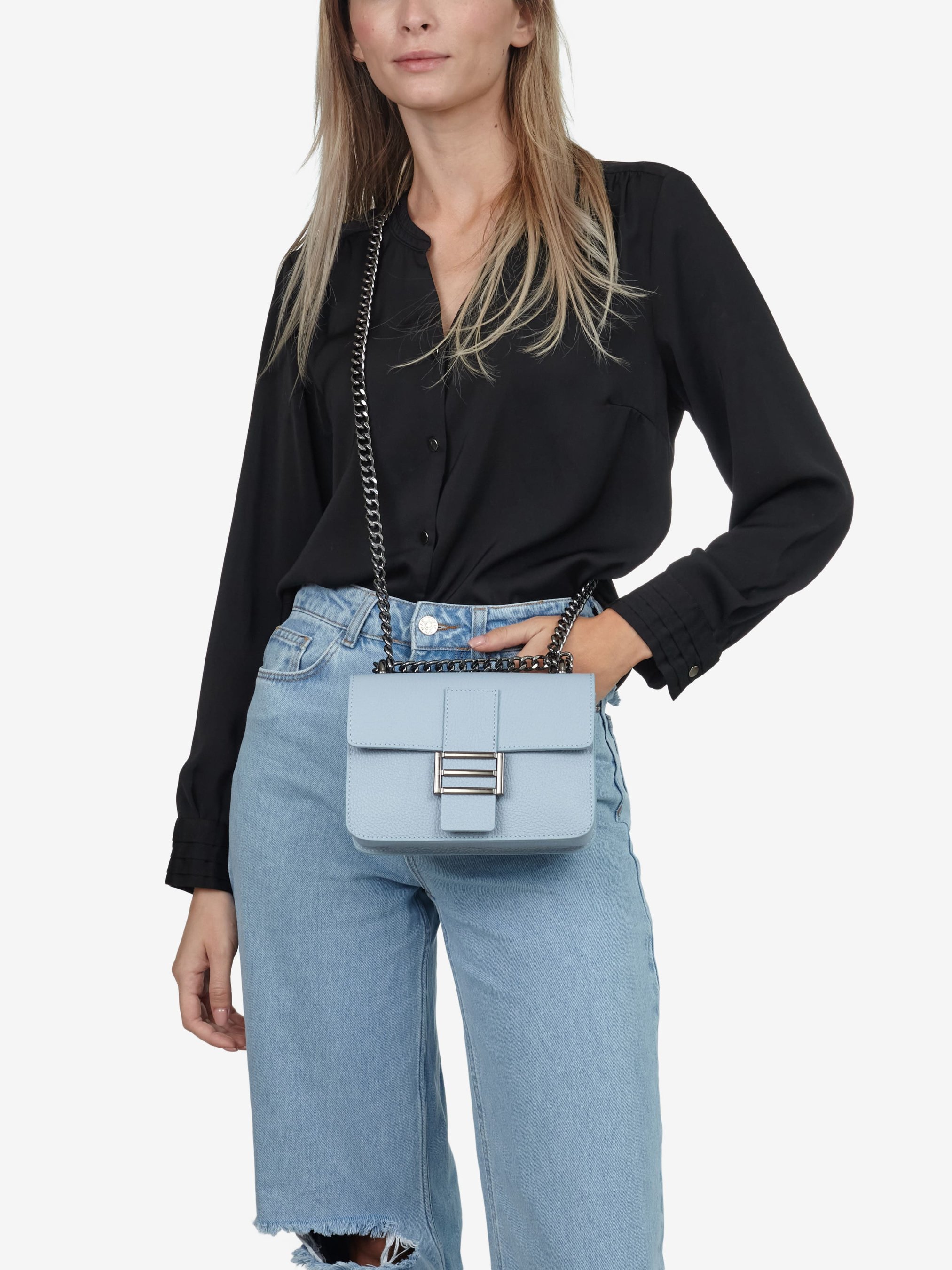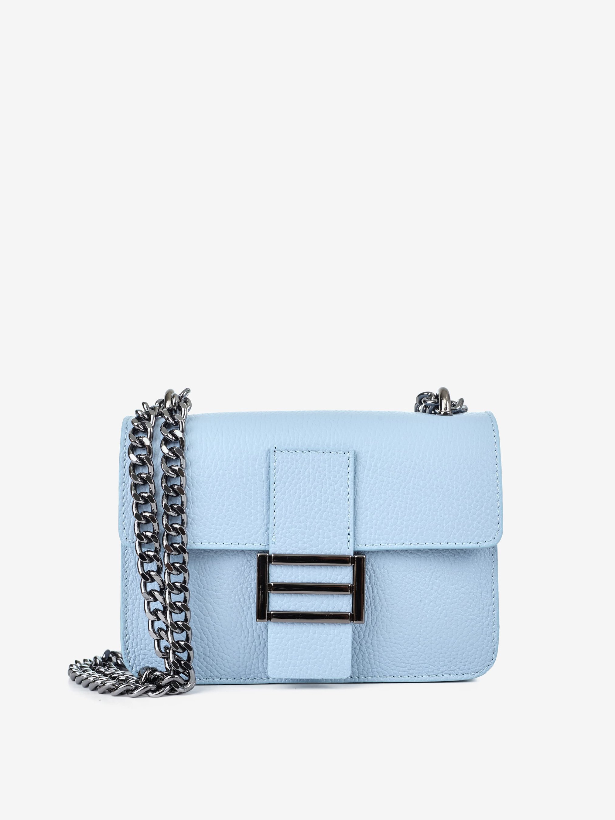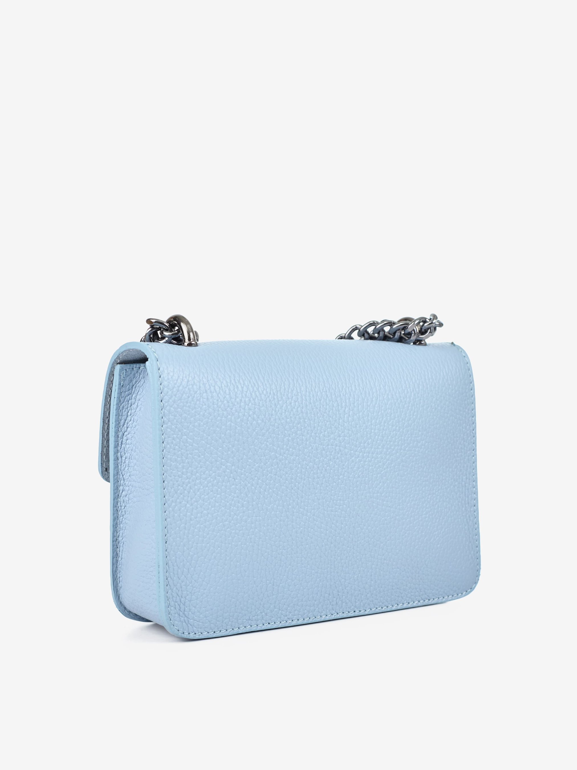 Детали: Материал: 100% натуральная кожа Кожа имеет фактуру флотар Фурнитура черного цвета Размеры (Ш x В x Г) - 20 х 14 х 6 см Внутри 1 отделение и 1 карманчик для мелочей на молнии Подкладка: без подкладки Застежка: клапан на магните Ремешок-цепочка, не регулируется, несъемный, максимальная длина 115 см Высота ручек-цепочек 31 см