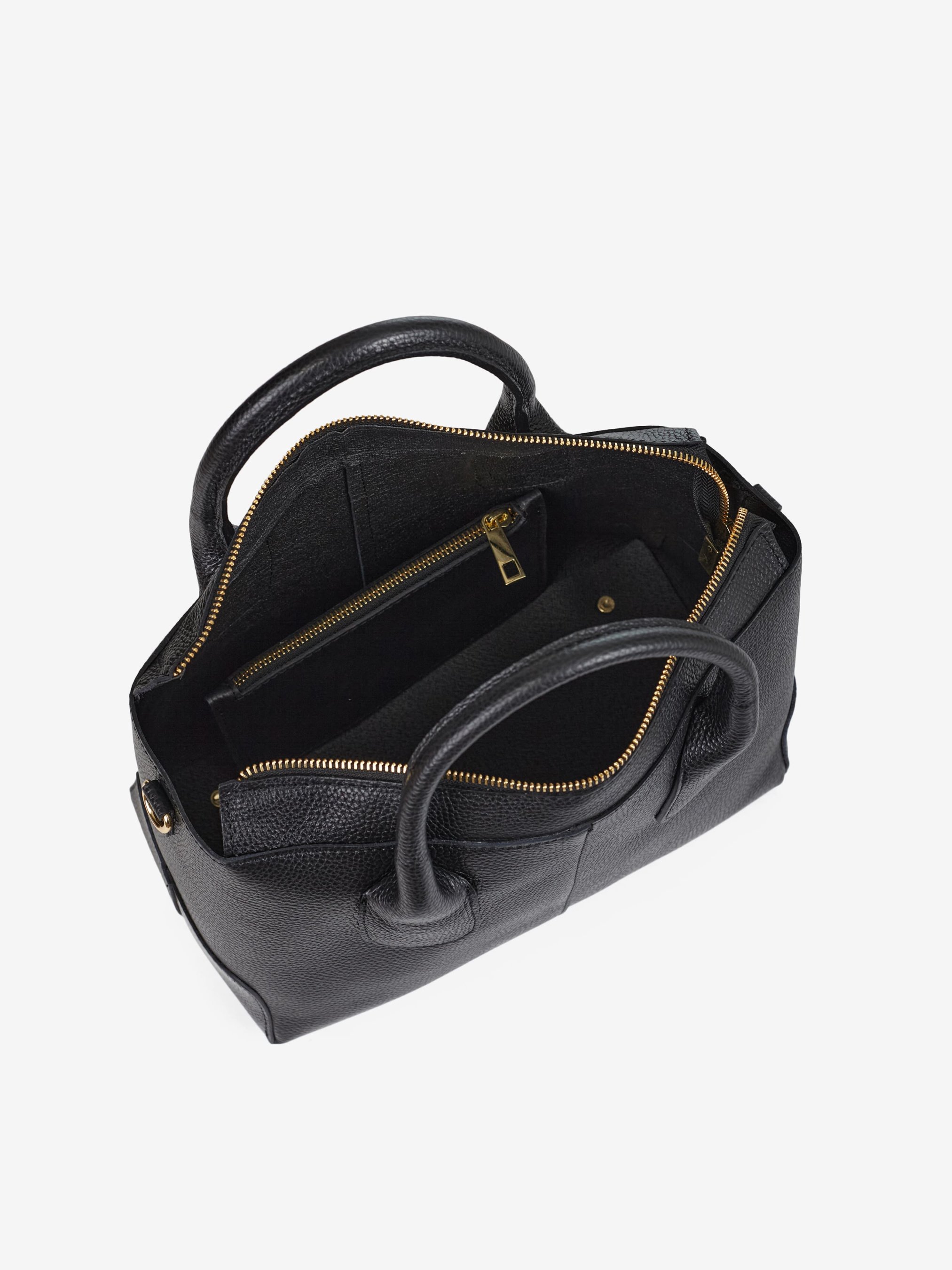 Детали: Материал: 100% натуральная кожа флотар Фурнитура золотистого цвета Размеры (Ш x В x Г) - 30 х 24 х 15 см Внутри 1 отделение и кошелек на молнии Подкладка: отсутствует Застежка: молния Ремешок кожаный, съемный, регулируется, максимальная длина 130 см Высота ручек 12 см
