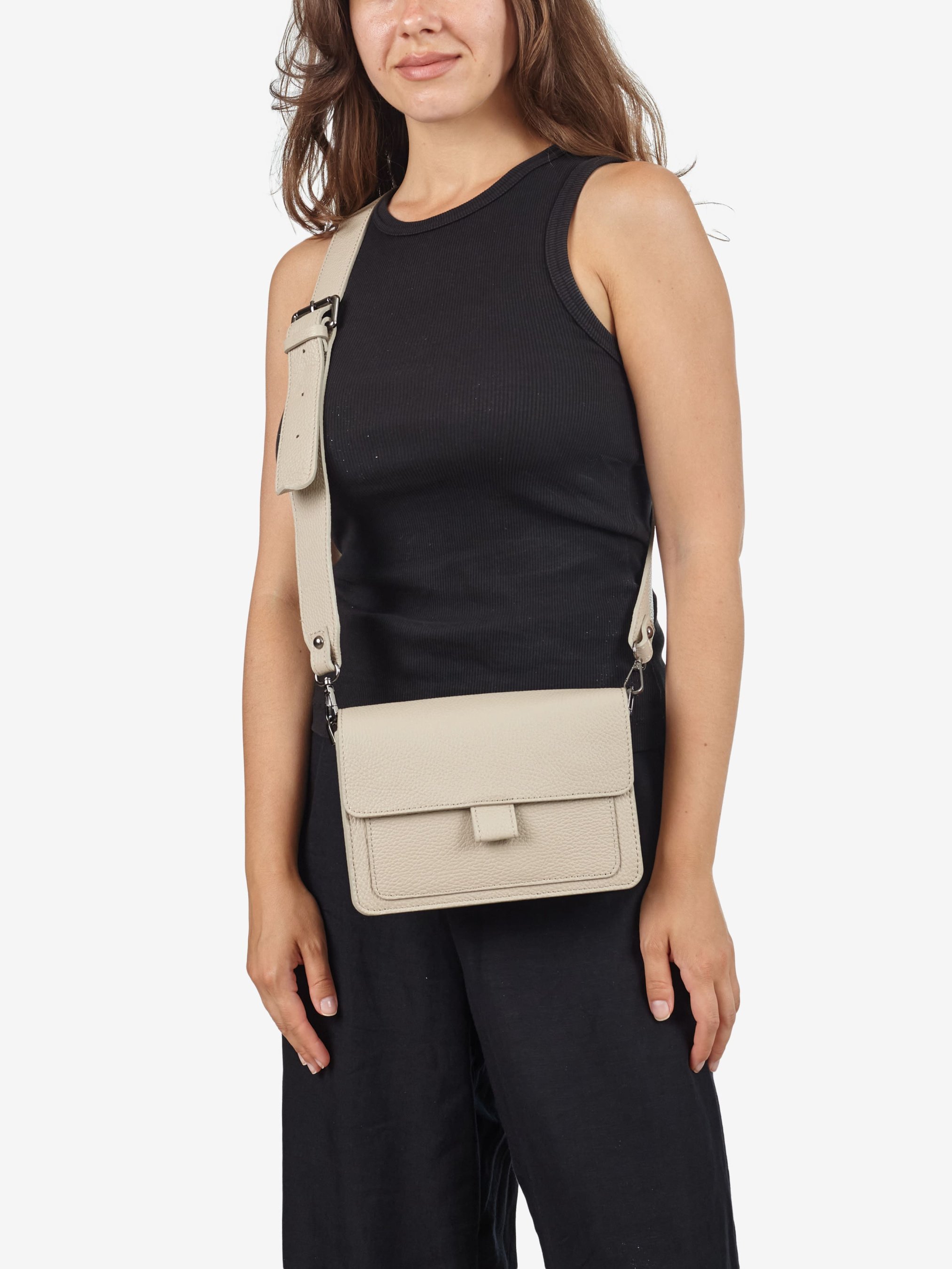 Детали: Материал: 100% натуральная кожа флотар Фурнитура черного цвета Размеры (Ш x В x Г) - 21 x 15 x 6 см Внутри 2 отделения, разделены карманом на молнии Спереди под клапаном карманчик без застежки Подкладка: отсутствует Застежка: клапан на магнитах Ремешок кожаный, съемный, регулируется, максимальная длина 110 см