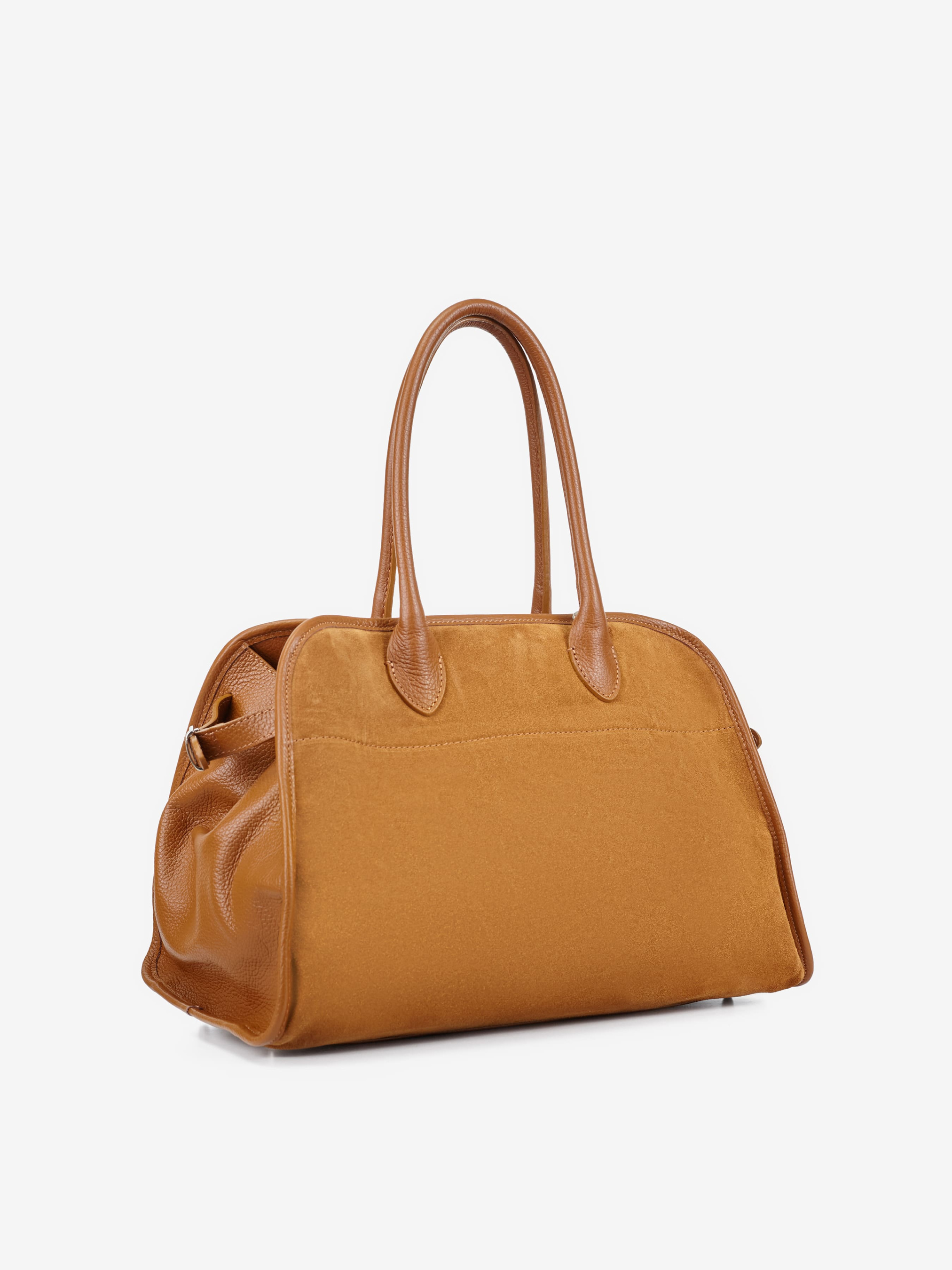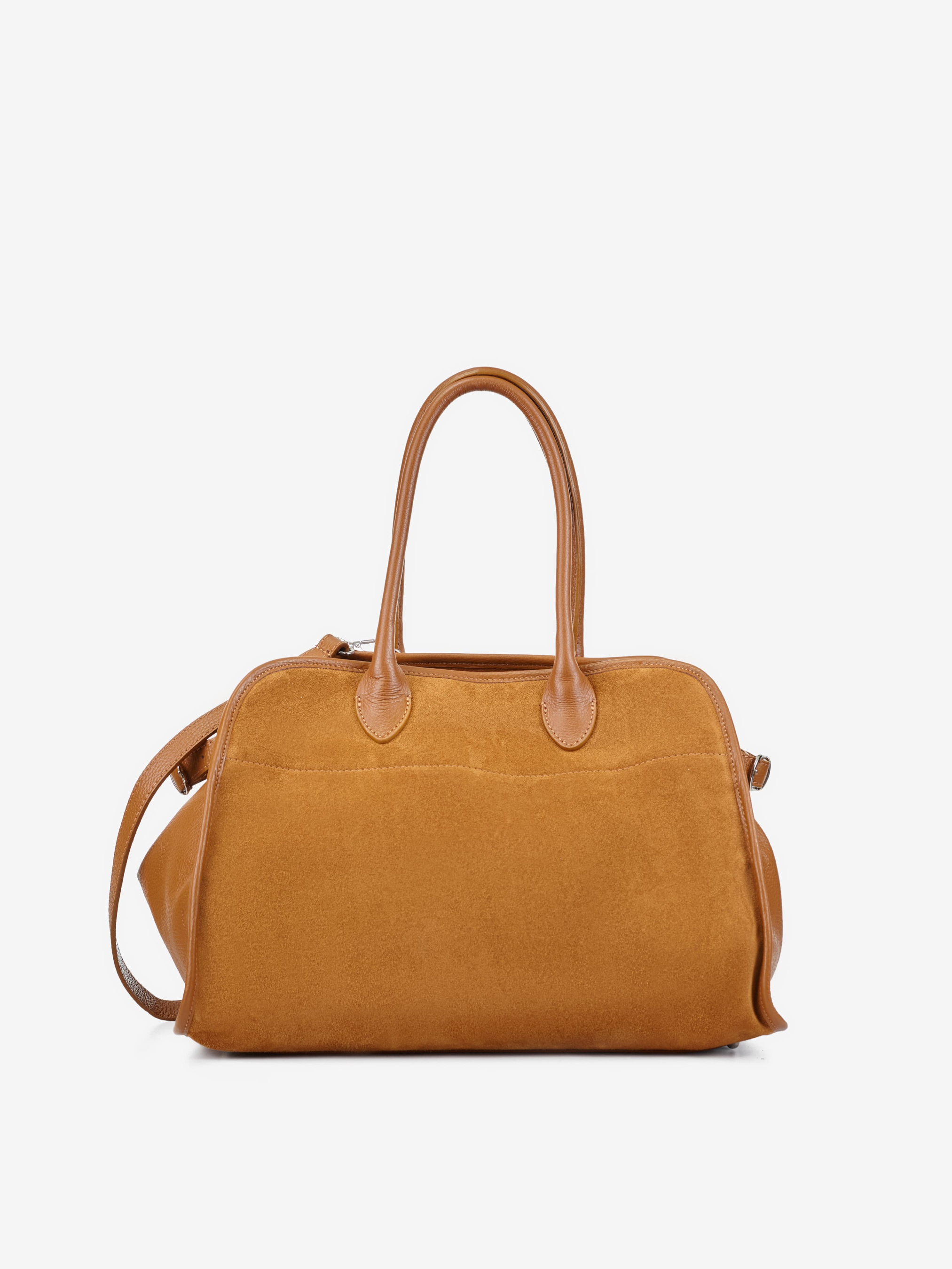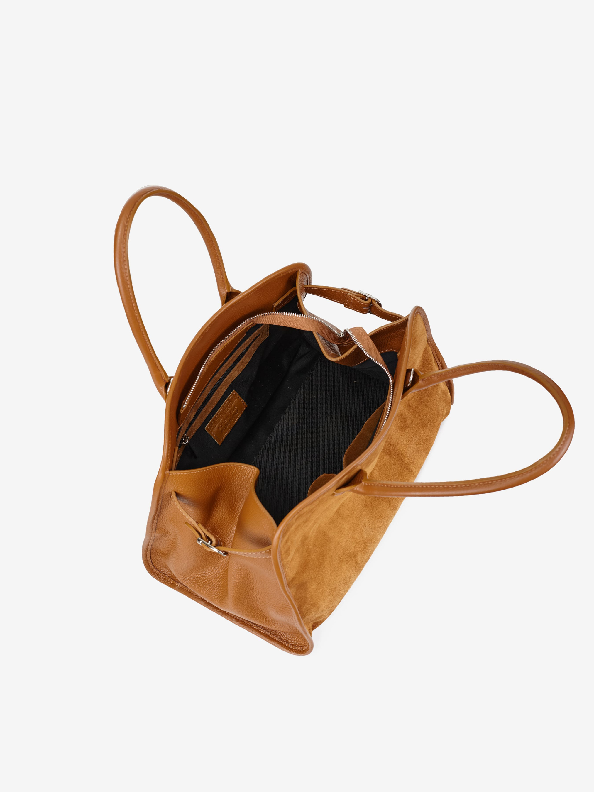 Детали: Материал: 100% натуральная кожа флотар, замша Фурнитура серебристого цвета Размеры (Ш x В x Г) - 37 х 30 х 20 см Внутри 1 отделение и 3 карманчика для мелочей, один из них на молнии Размер сумки можно регулировать по бокам Подкладка: хлопок Застежка: молния Ремешок кожаный, съемный, регулируется, максимальная длина 80 см Высота ручек 20 см