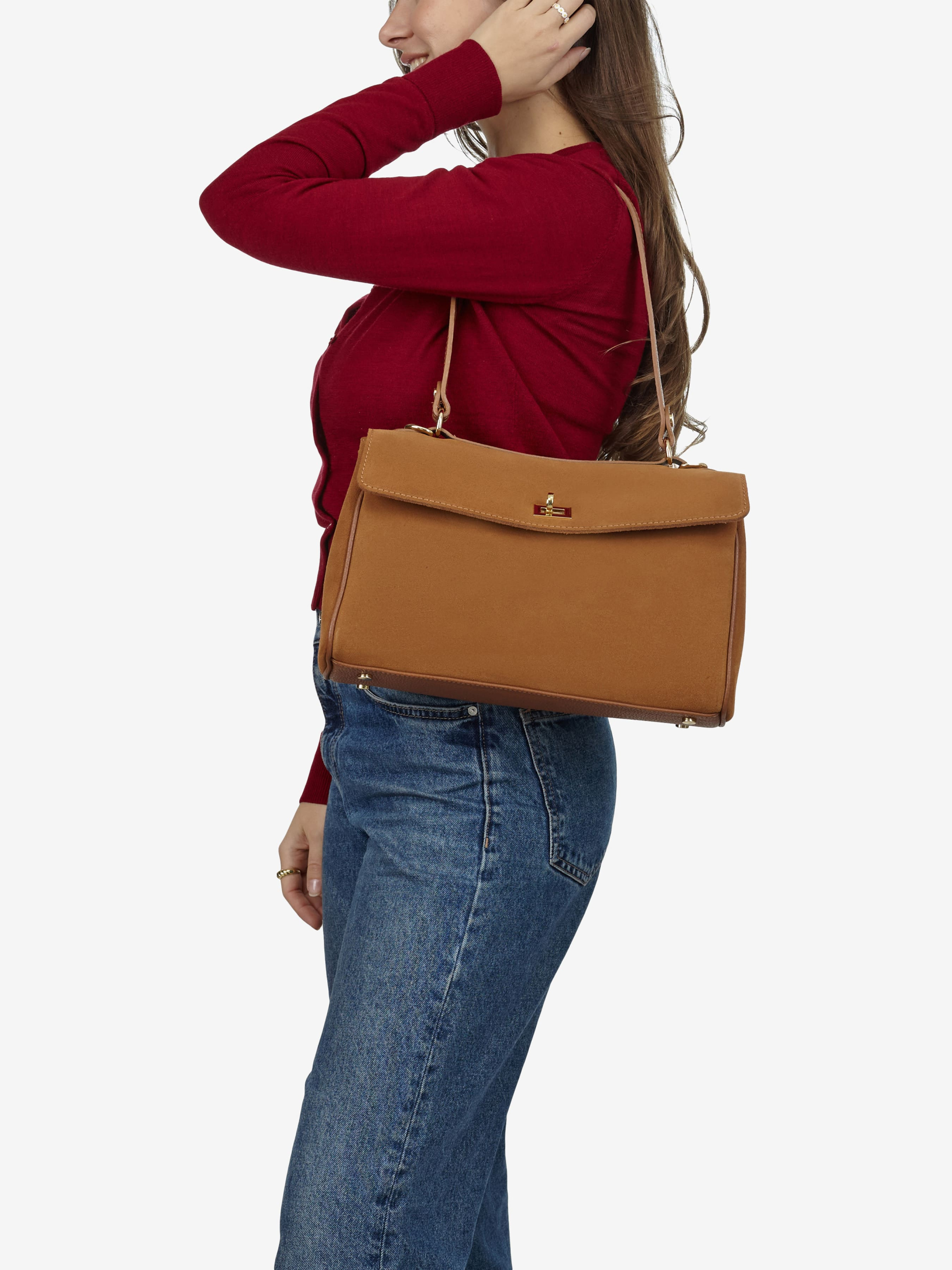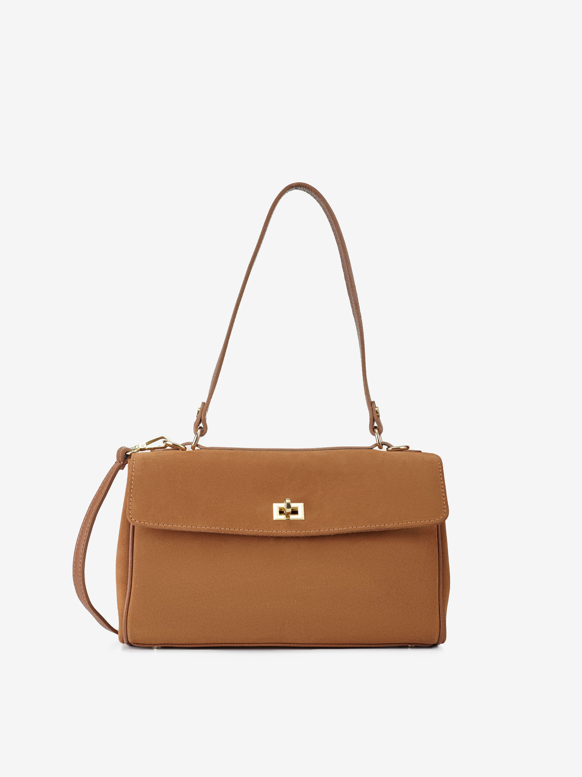 Детали: Материал: 100% натуральная кожа флотар и замша Фурнитура золотистого цвета Размеры (Ш x В x Г) - 31 x 18 x 10 см Внутри 2 отделения и карманчик на молнии Подкладка: хлопок Застежка: клапан на поворотном замке Высота ручки 26 см Ремешок кожаный, съемный, регулируется, максимальная длина 110 см