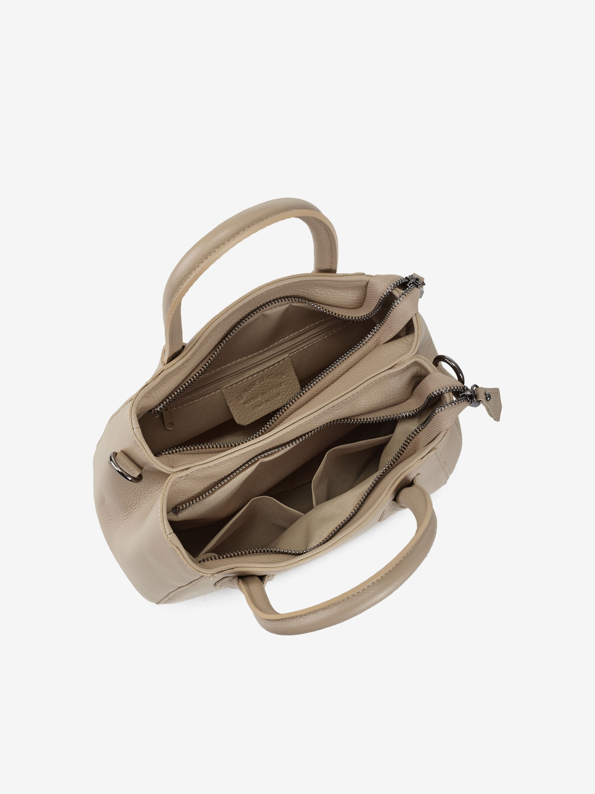 Детали: Материал: 100% натуральная кожа флотар Фурнитура золотистого цвета Размеры (Ш x В x Г) - 26 x 20 x 10 см Внутри 2 раздельных отделения и 3 карманчика для мелочей, один из них на молнии Подкладка: хлопок Застежка: молния Ремешок кожаный, съемный, регулируется, максимальная длина 115 см Высота ручки 13 см