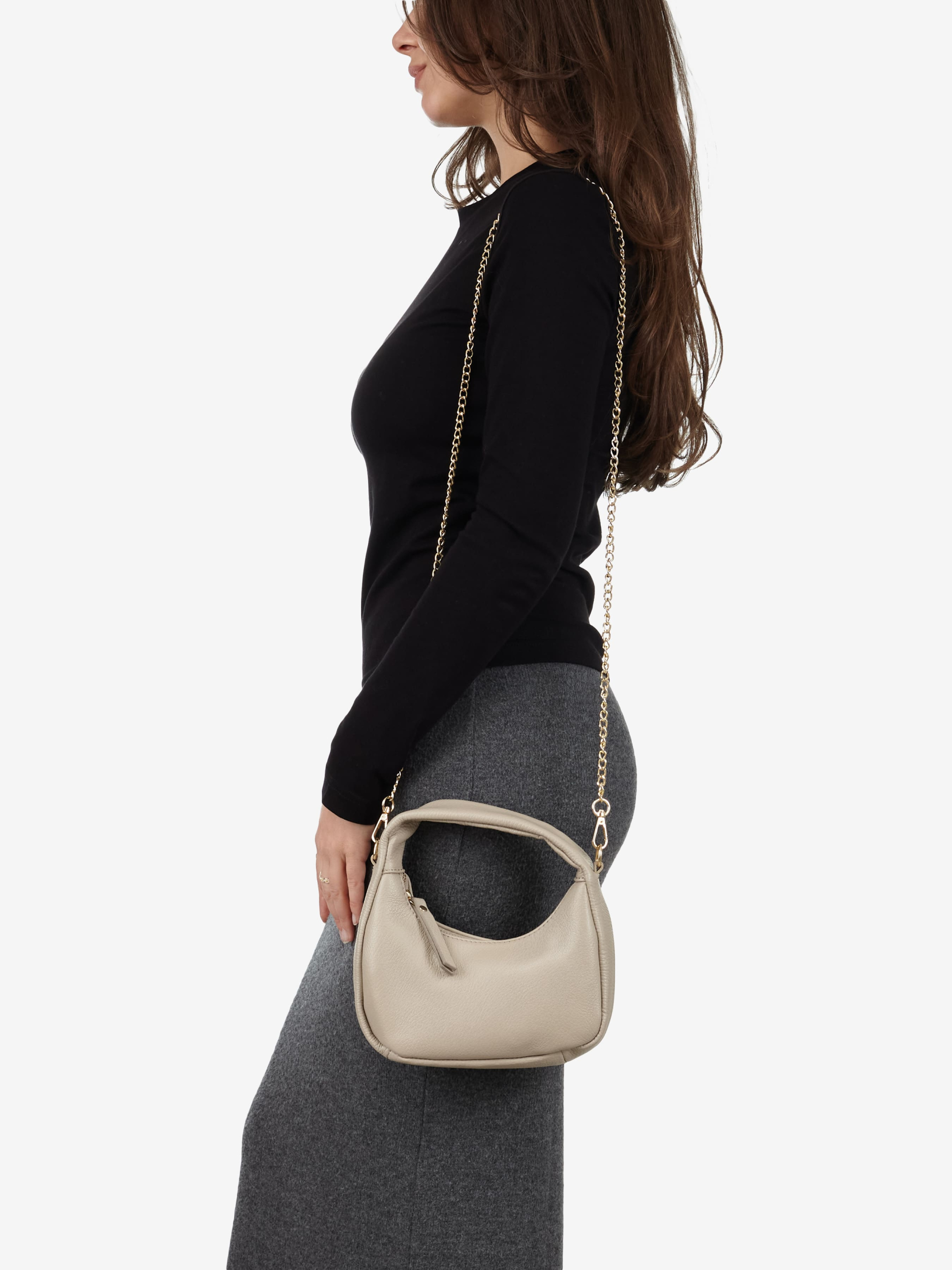 Детали: Материал: 100% натуральная кожа флотар Фурнитура золотистого цвета Размеры (Ш x В x Г) - 20 x 10 x 6 см Внутри 1 отделение и карманчик на молнии Подкладка: хлопок Застежка: молния Высота ручки 12 см Ремешок-цепочка, съемная, не регулируется, максимальная длина 110 см