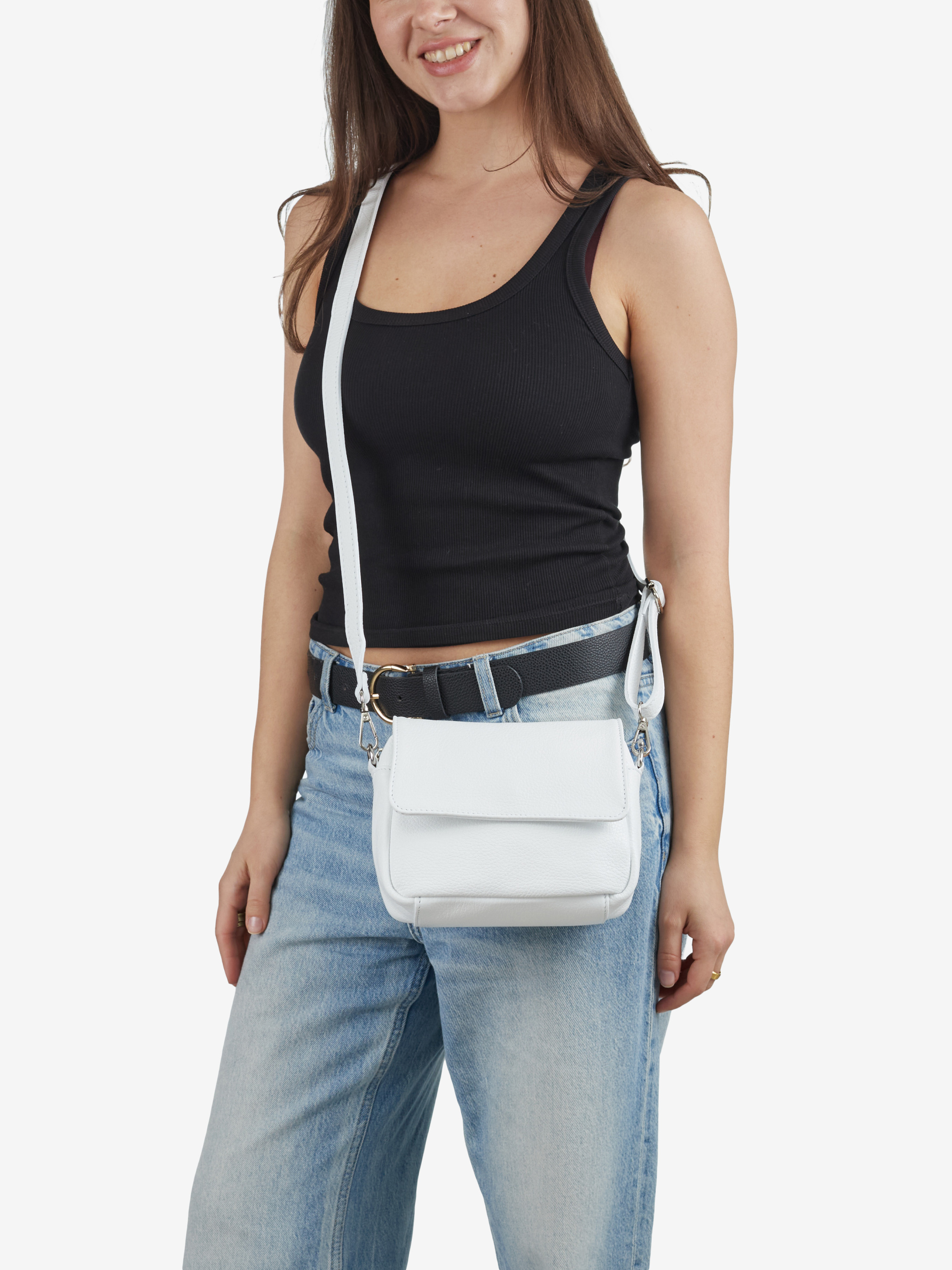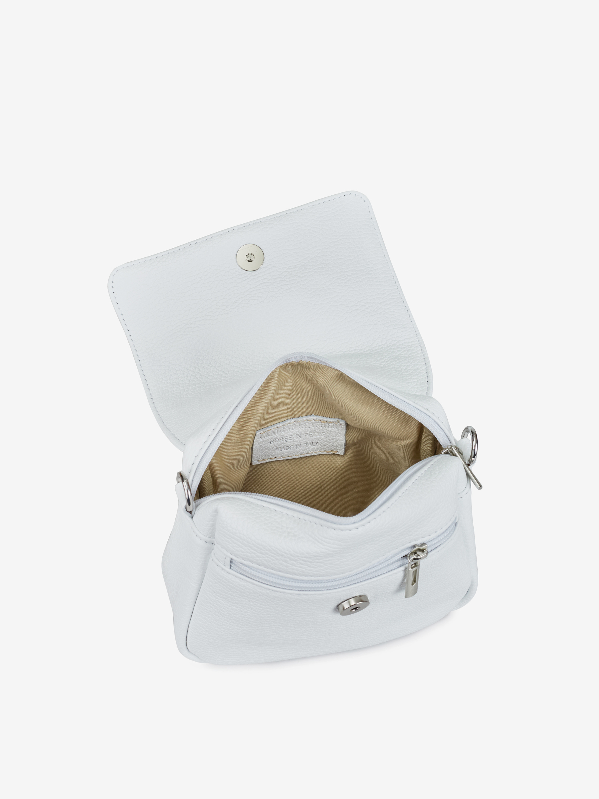 Детали: Материал: 100% натуральная кожа флотар Фурнитура серебристого цвета Размеры (Ш x В x Г) - 20 x 15 x 10 см Внутри 1 отделение, сзади и спереди карманчики на молнии Подкладка: хлопок Застежка: молния, клапан на магните Ремешок кожаный, съемный, регулируется, максимальная длина 120 см