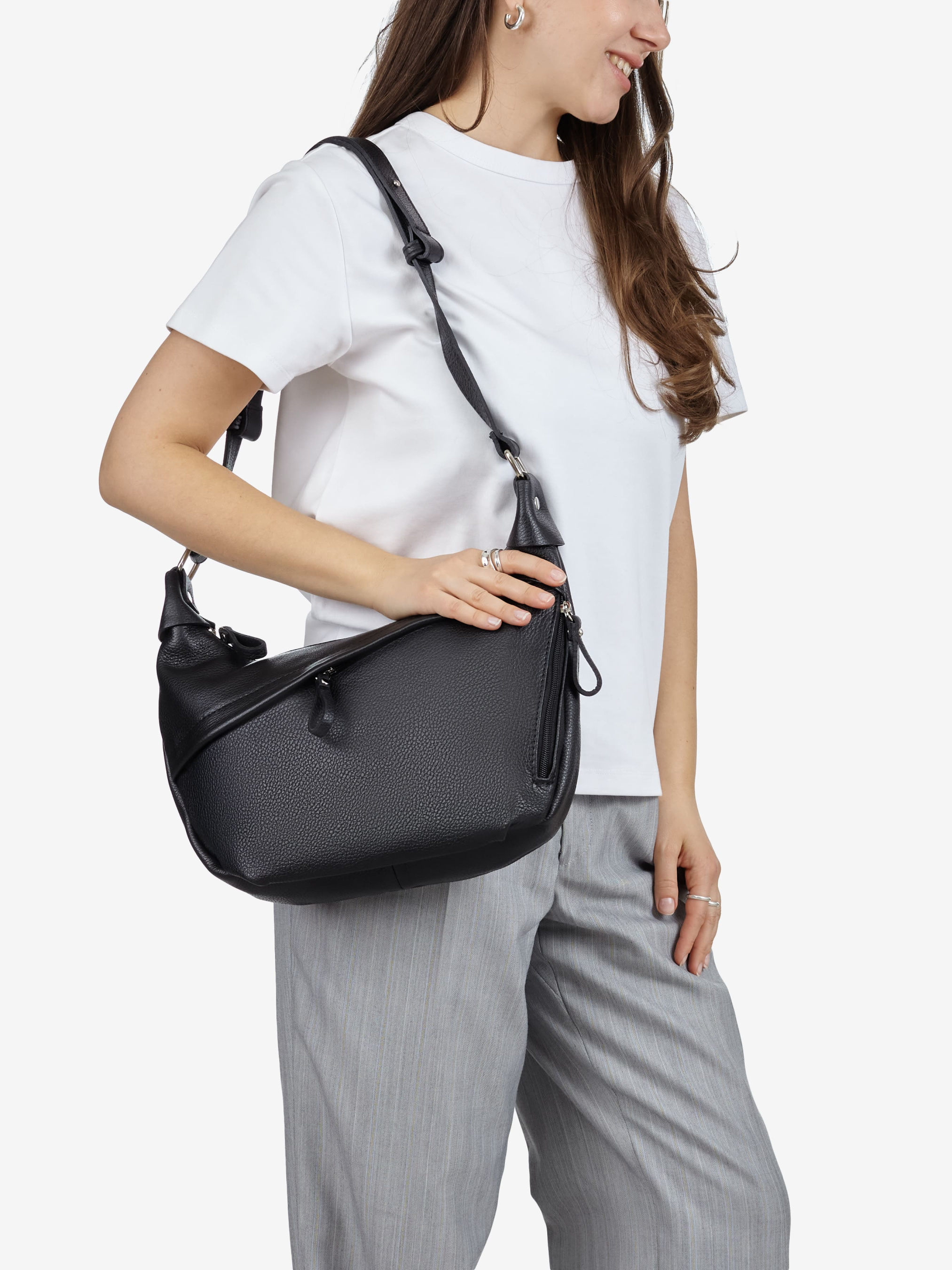 Детали: Материал: 100% натуральная кожа флотар Фурнитура серебристого цвета Размеры (Ш x В x Г) - 35 x 21 x 8 см Внутри 1 отделение и 2 карманчика, один из них на молнии Спереди 2 карманчика на молнии Подкладка: хлопок Застежка: молния Ремешок кожаный, несъемный, регулируется, максимальная длина 115 см